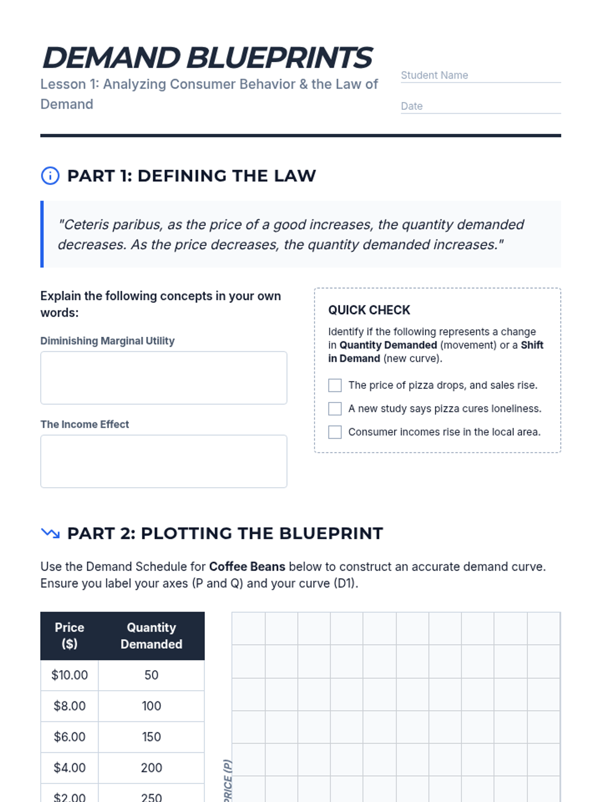 Students investigate the inverse relationship between price and quantity demanded, focusing on the Law of Demand and graphical representation.