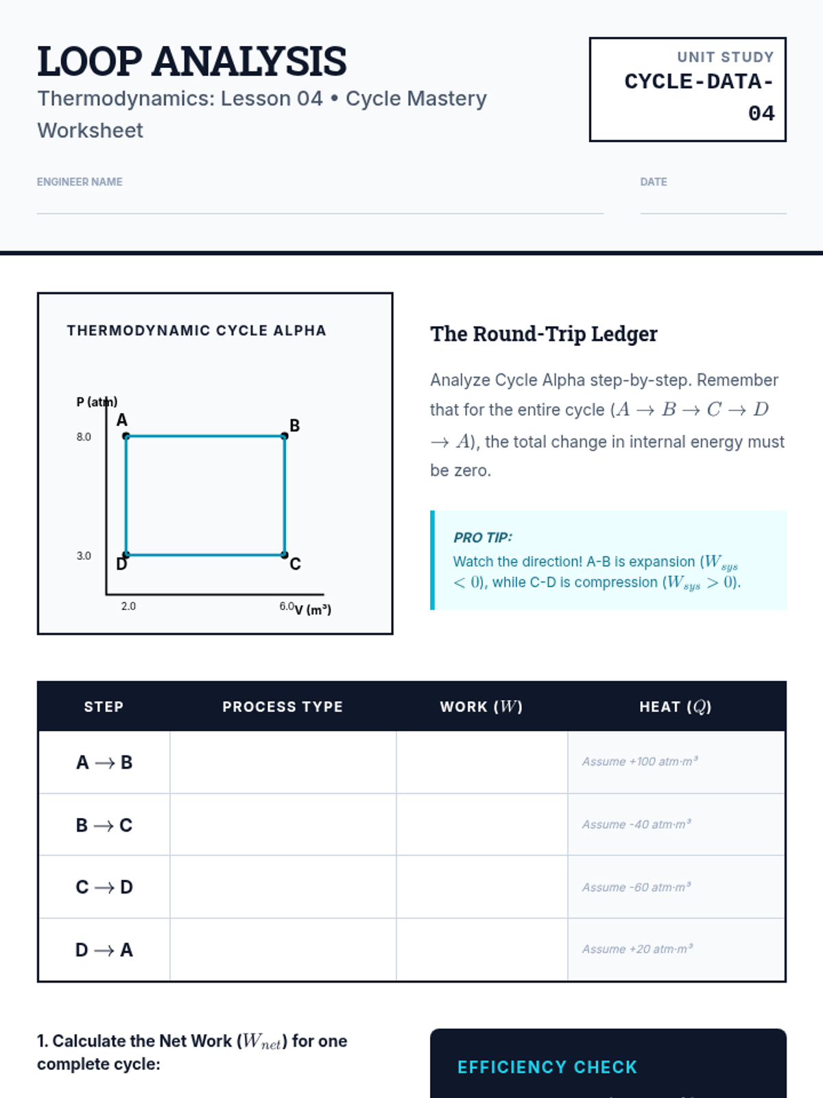 Students trace full thermodynamic cycles on PV diagrams, calculating net work and heat exchange for repeating engines.
