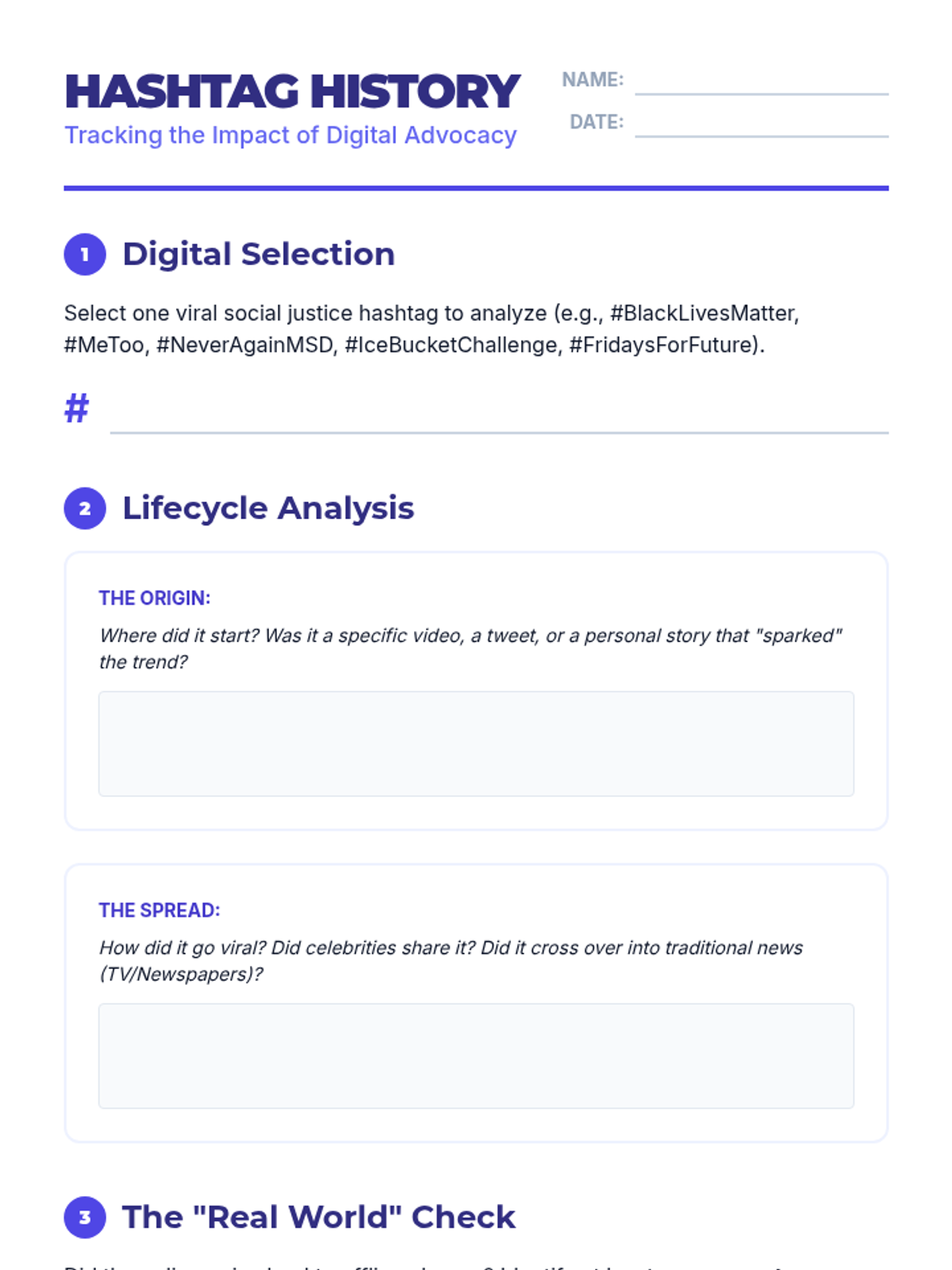 Students critically examine the role of social media in modern advocacy, distinguishing between 'slacktivism' and meaningful digital organization.