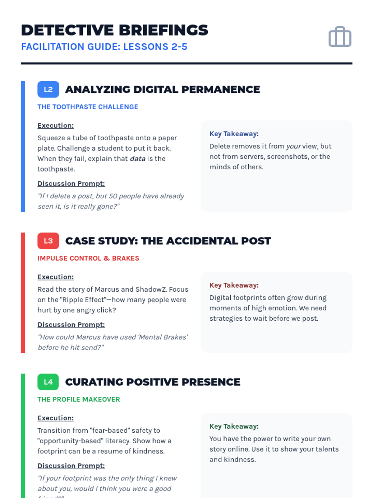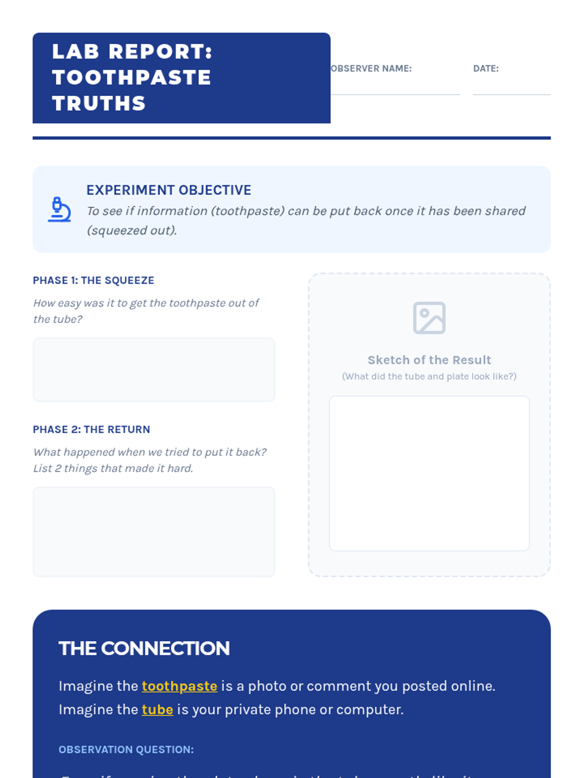 Through the 'Toothpaste Challenge' and discussion, students learn about the difficulty of deleting information once it is shared online.