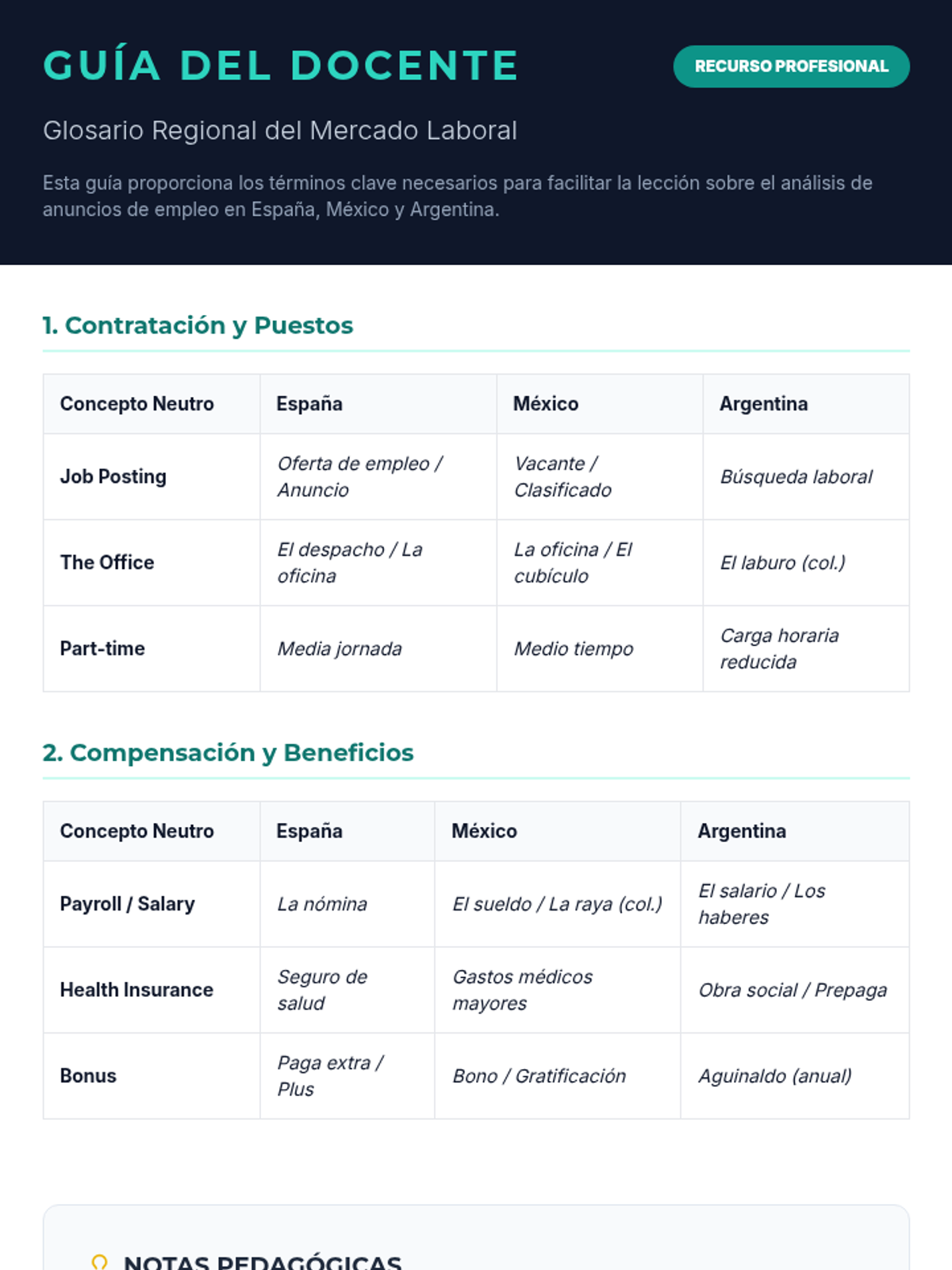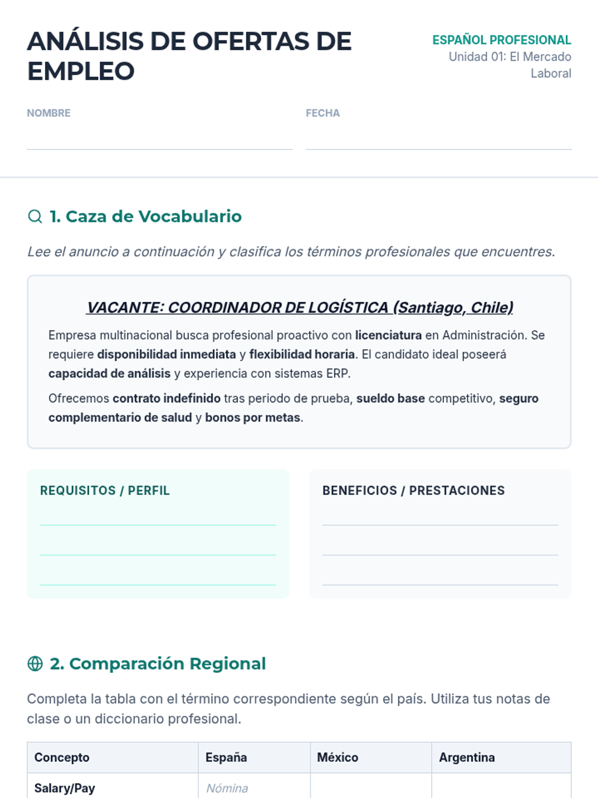 Students analyze authentic job postings to identify industry terms, required qualifications, and regional differences in professional Spanish vocabulary.