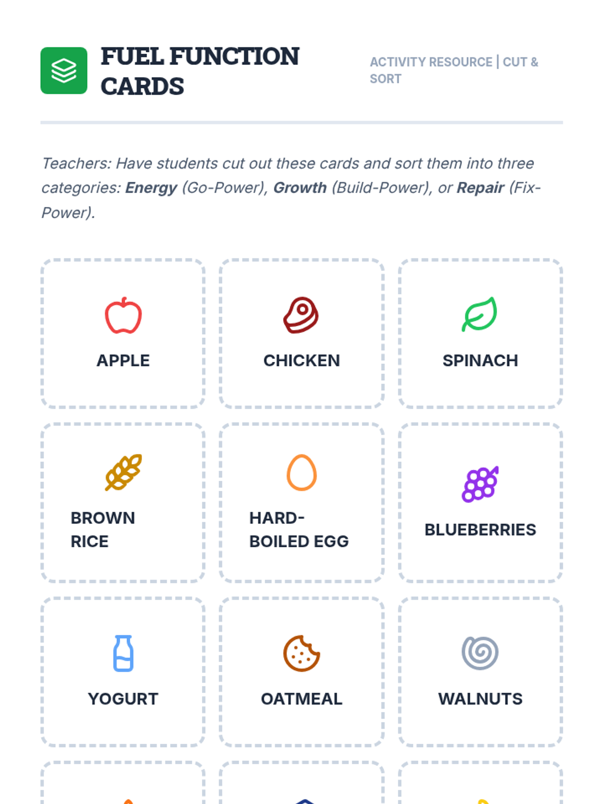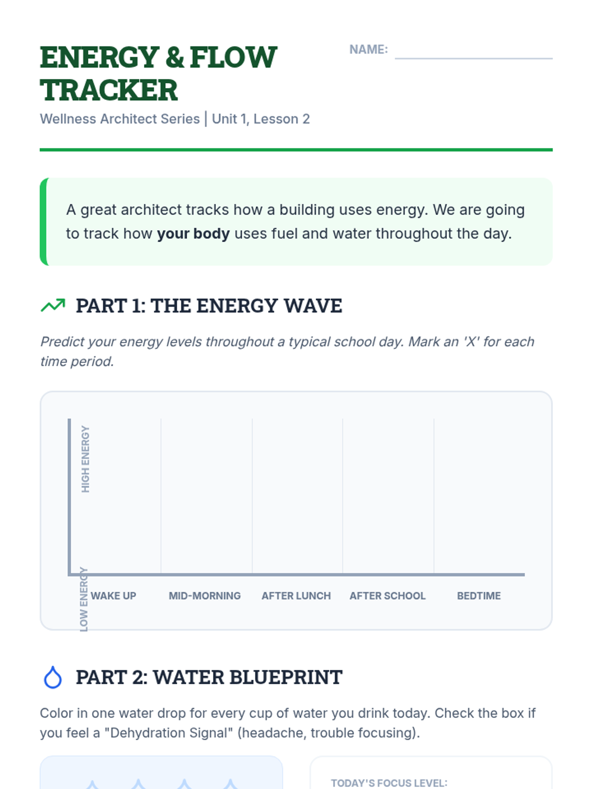 Students investigate how food and water act as fuel for the body's 'engine'. They categorize foods by their function (energy, growth, repair) and track their hydration to understand its impact on focus.
