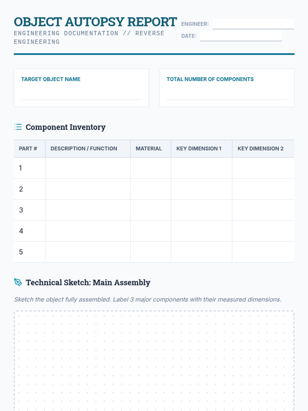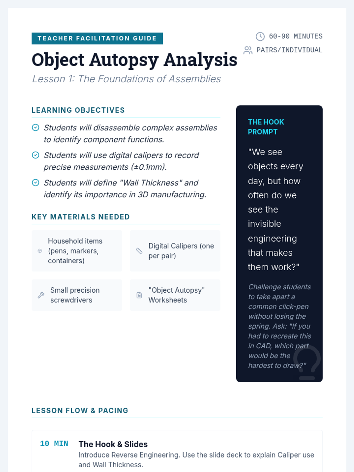 Students reverse-engineer a household item by measuring its components with calipers and creating technical sketches to understand how parts work together.