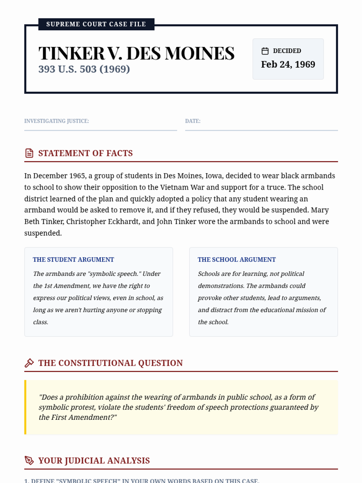Using Tinker v. Des Moines, students analyze how the Court applies the Bill of Rights to school settings. They dissect arguments and rulings to see how abstract principles affect their daily lives.