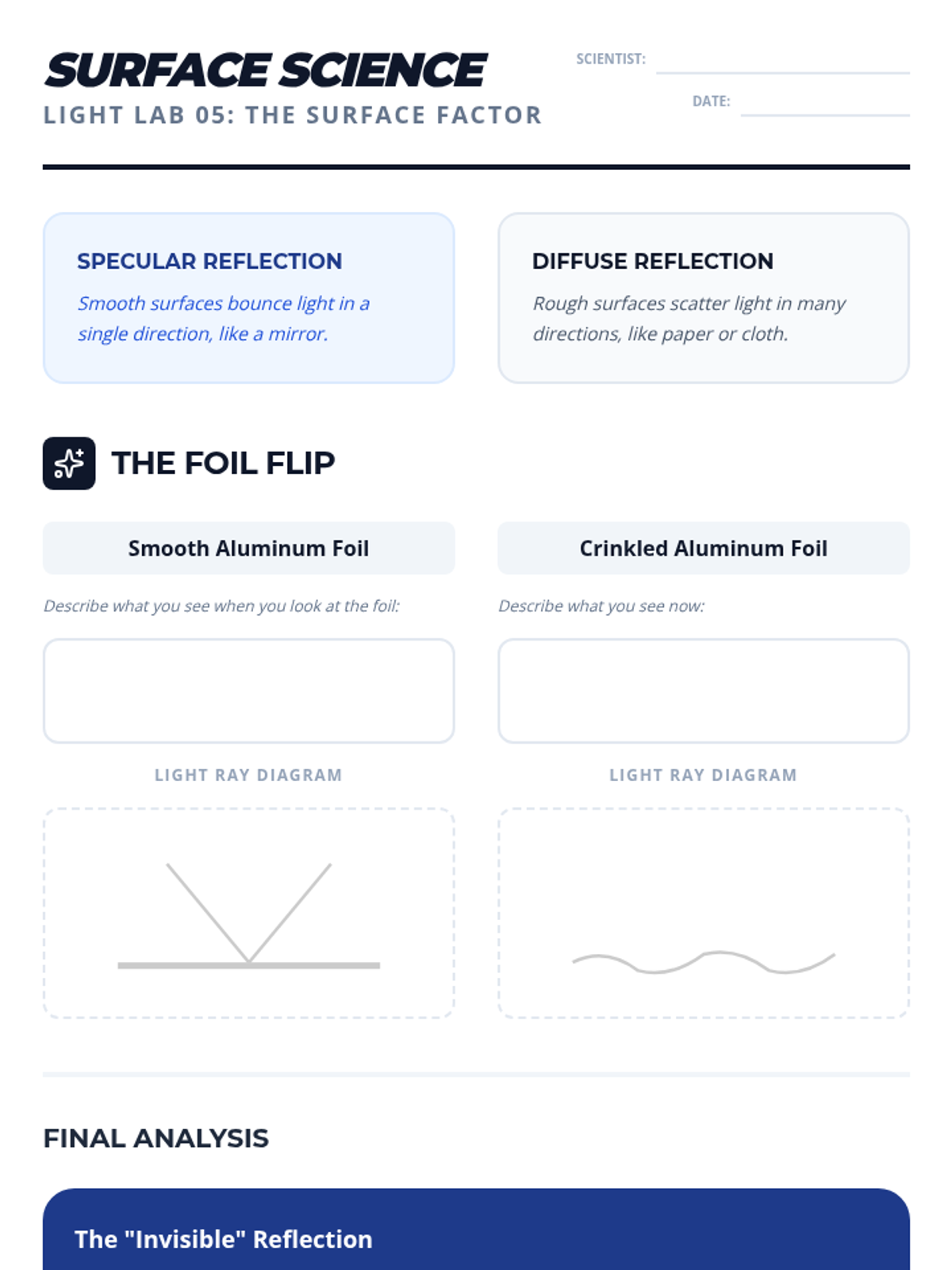 Students compare reflections in flat, smooth mirrors versus crinkled aluminum foil to learn about specular and diffuse reflection.