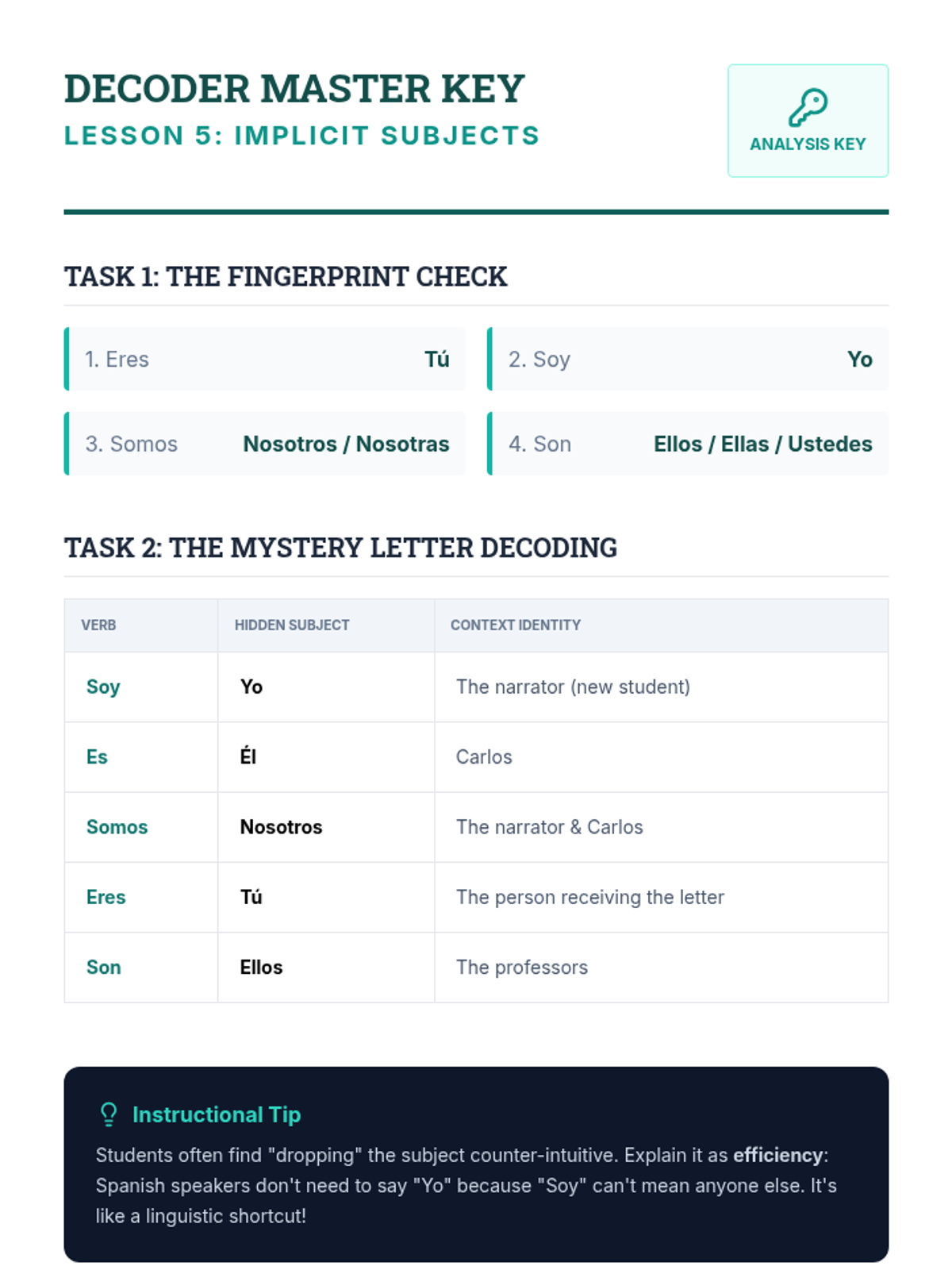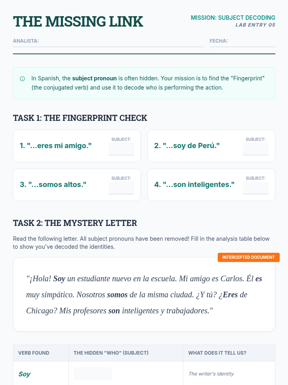 Students read simple introductory texts to identify the implicit subjects hidden within conjugated verbs. They reverse-engineer sentences to find the 'who' behind the action.