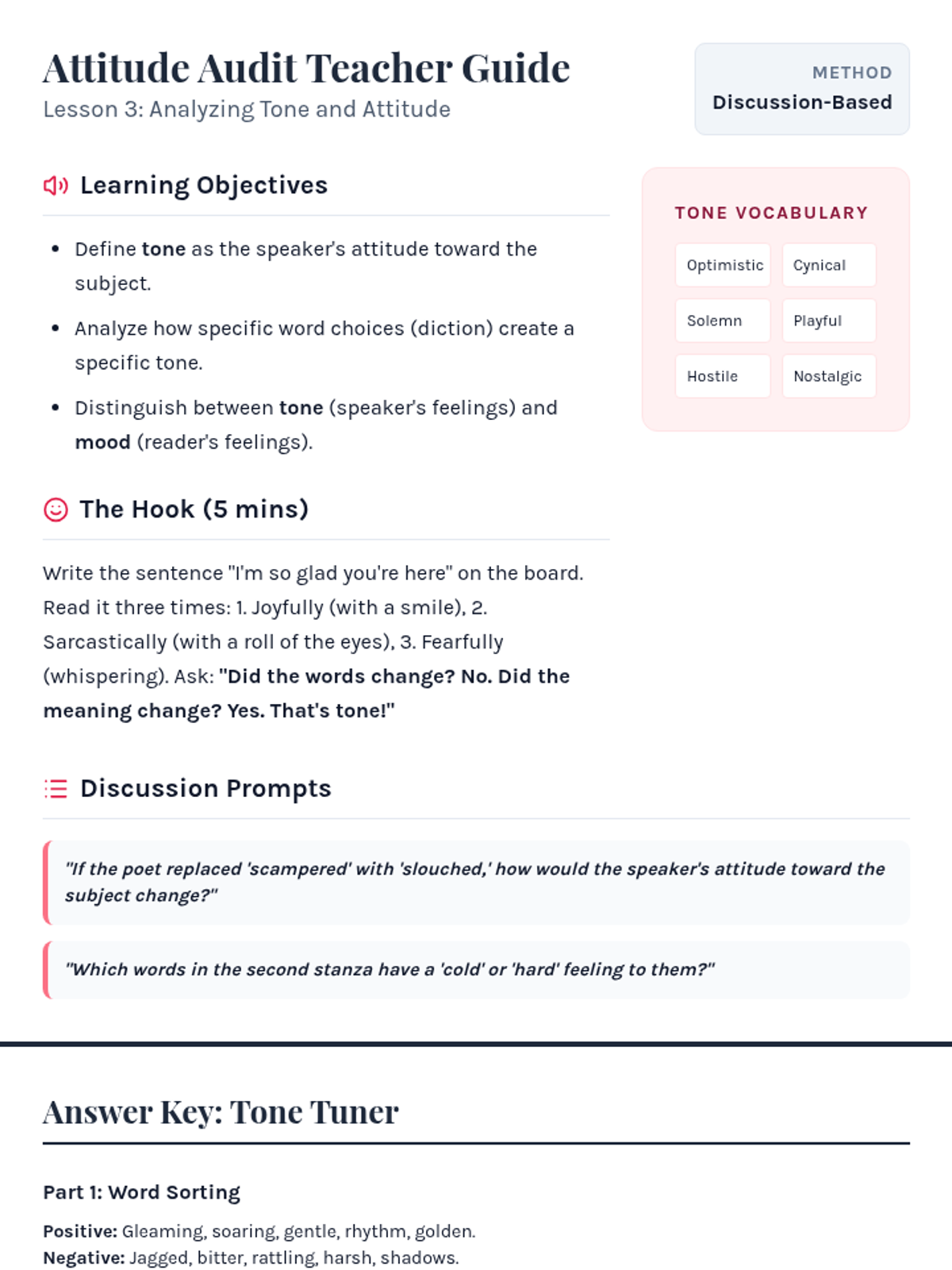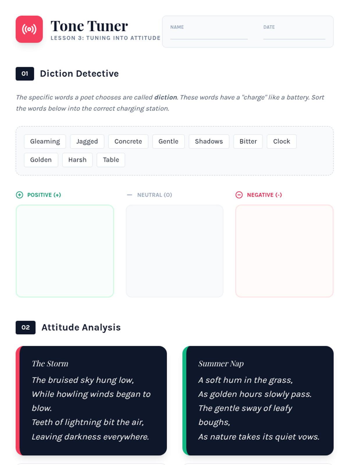An investigation into how a speaker's attitude is conveyed through specific word choices. Students categorize diction to determine tone and analyze how shifting words can change the entire meaning of a verse.