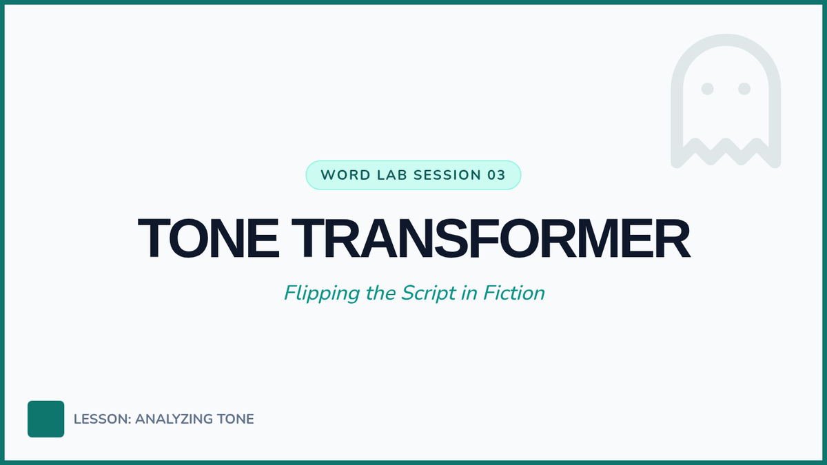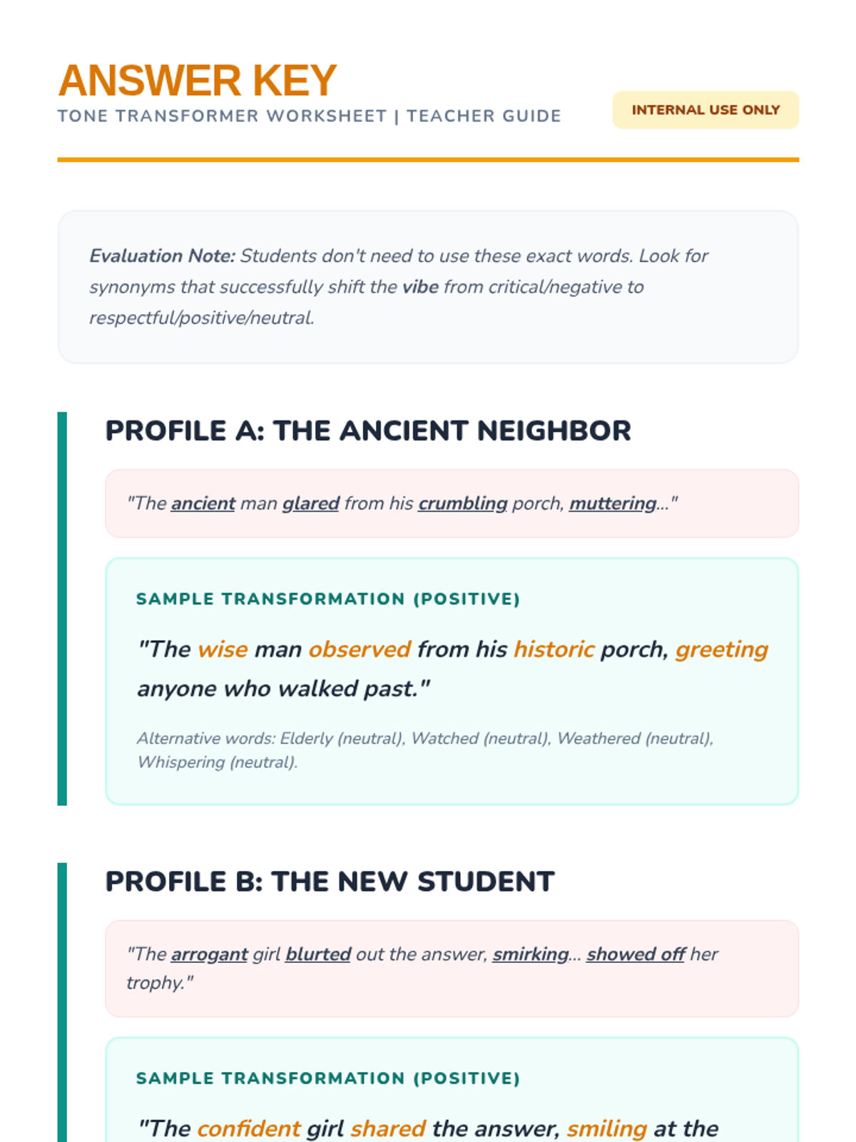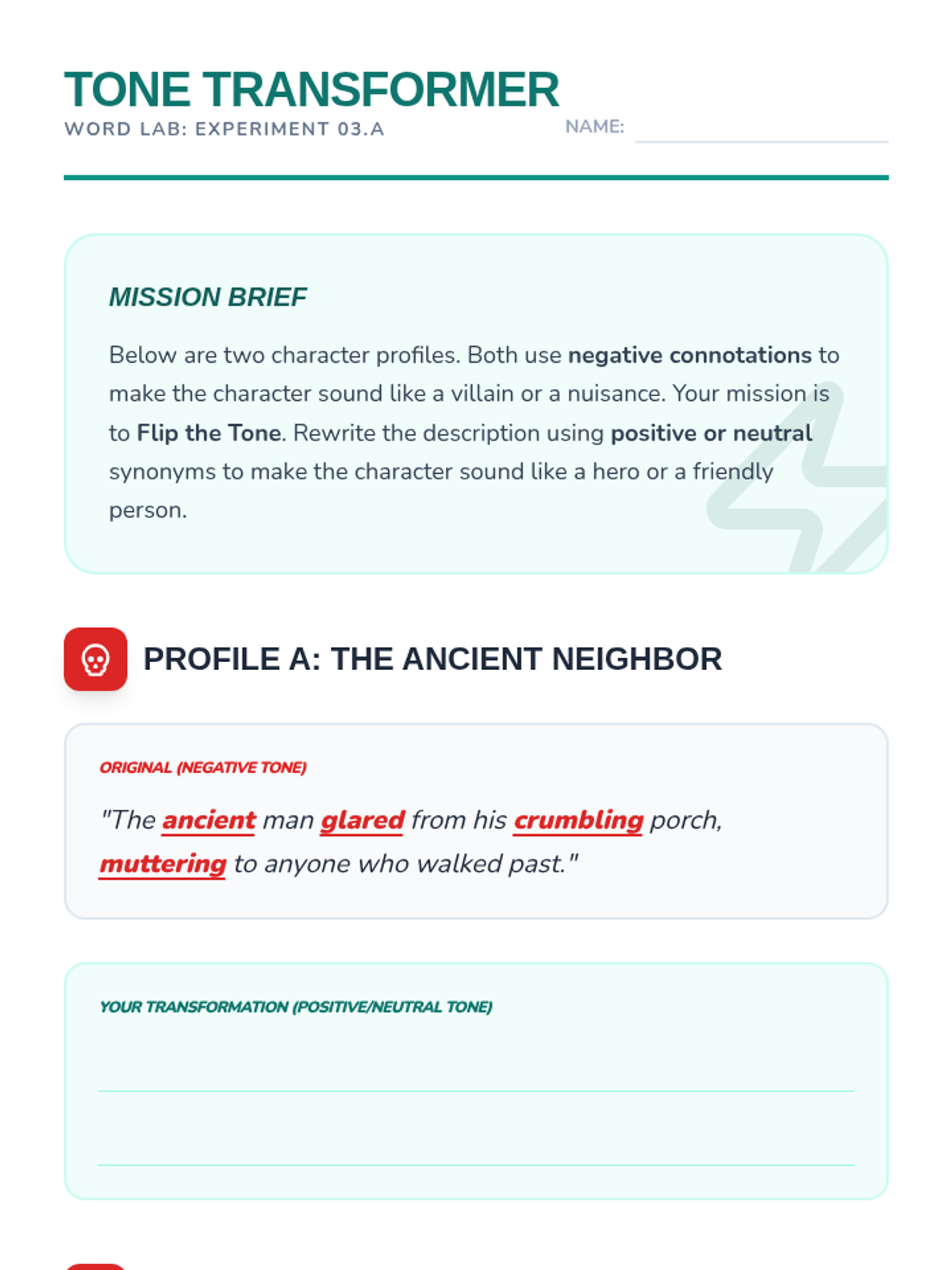 Students read short character descriptions and rewrite them by swapping charged words to flip the tone, highlighting the power of authorial intent.