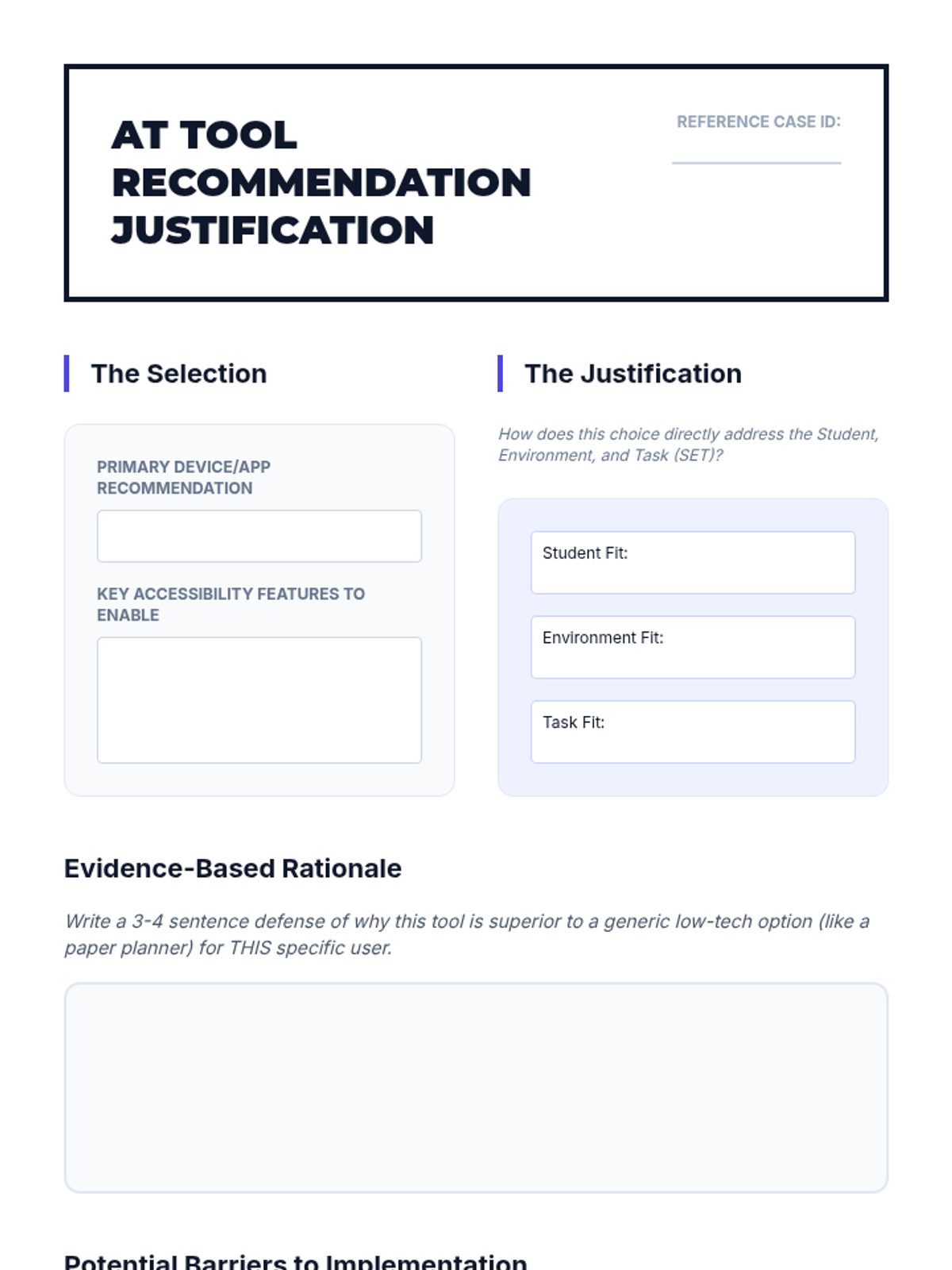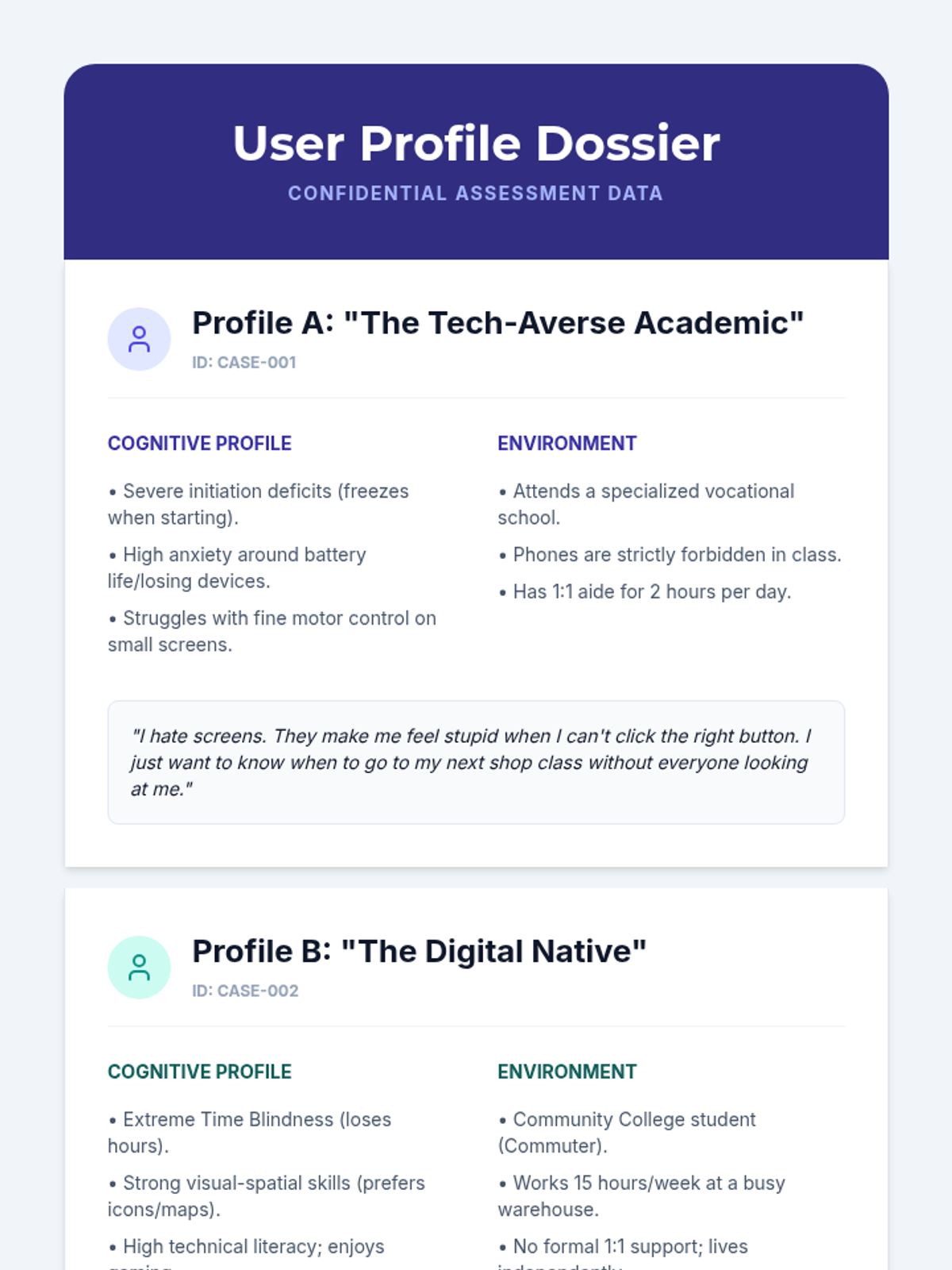 Students synthesize their knowledge by analyzing detailed user profiles. They must differentiate between low-tech and high-tech solutions based on user technical literacy and environment, defending their selections through peer review.