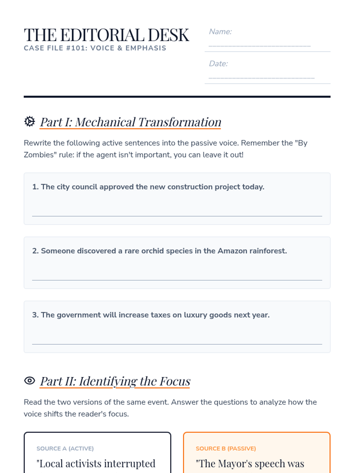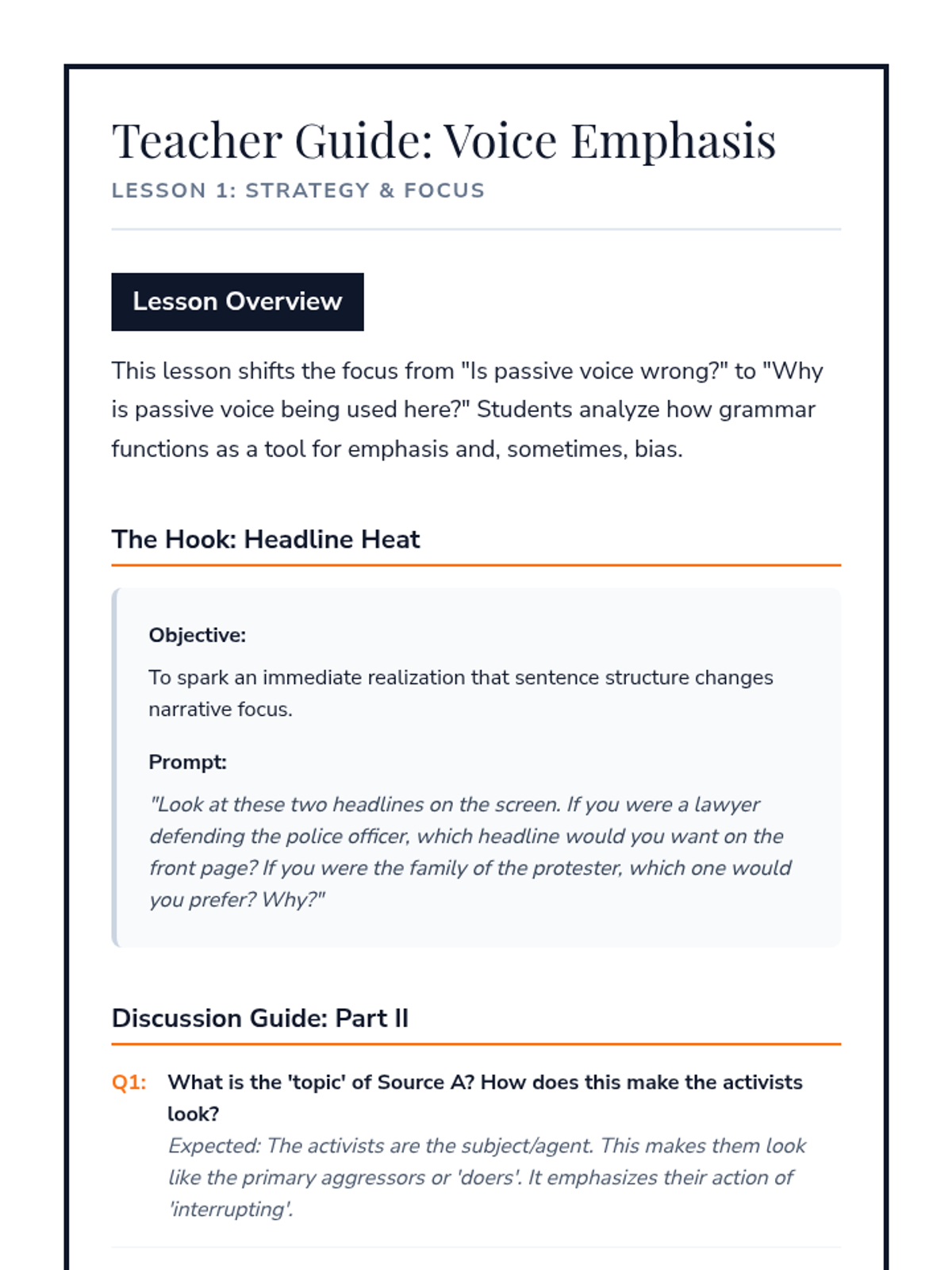 Students investigate the mechanical shift between active and passive voice, focusing on how voice alters the 'topic' of a sentence. They analyze how headlines use voice to shape reader perception and bias.