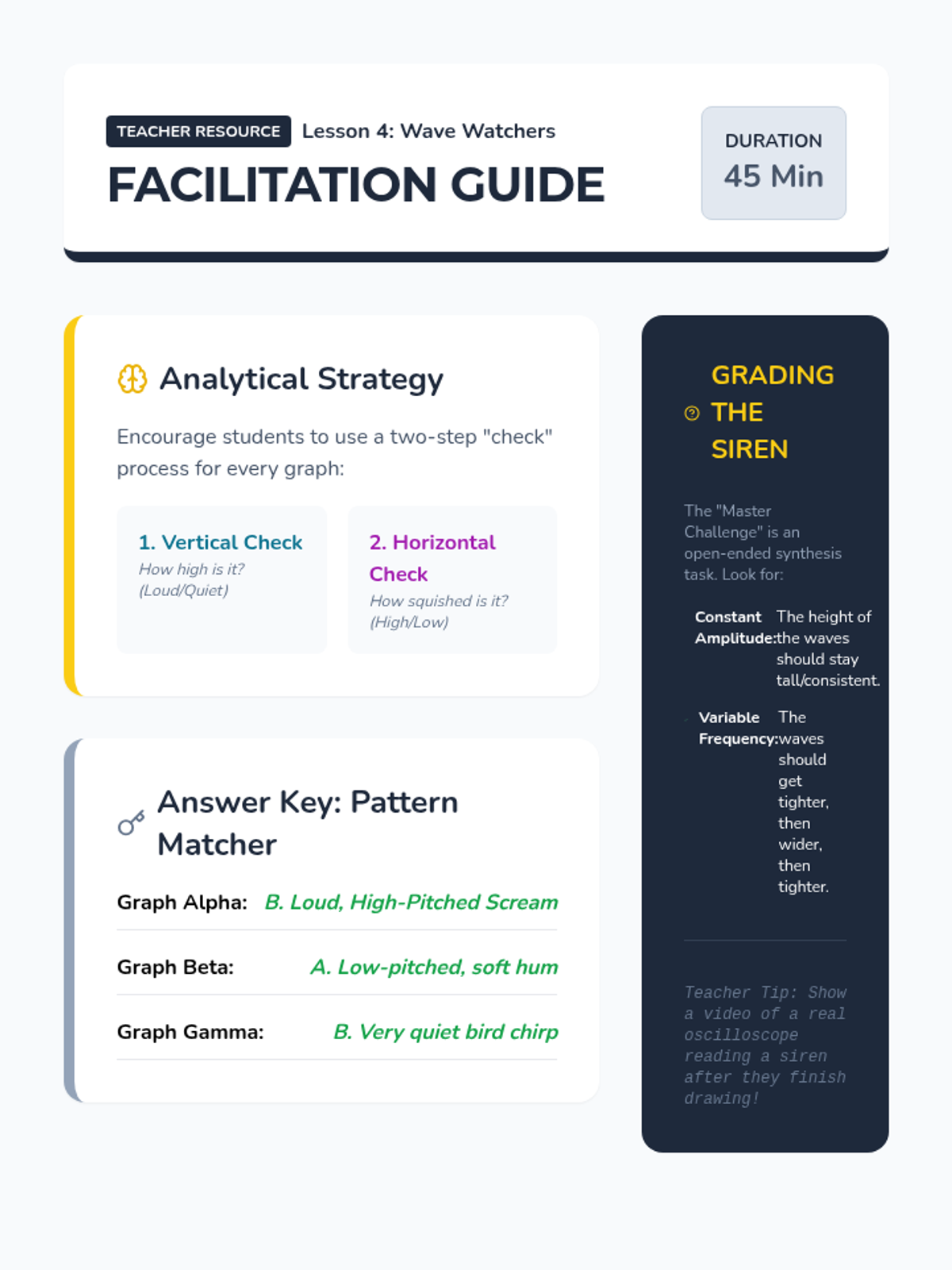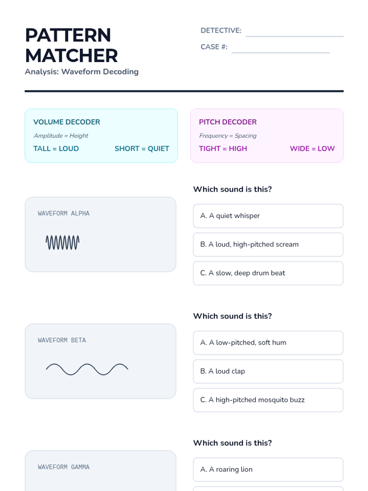 Students are given printed graphs of sound waves and must match them to audio samples. They practice identifying high/low pitch and loud/soft volume based solely on wave geometry.