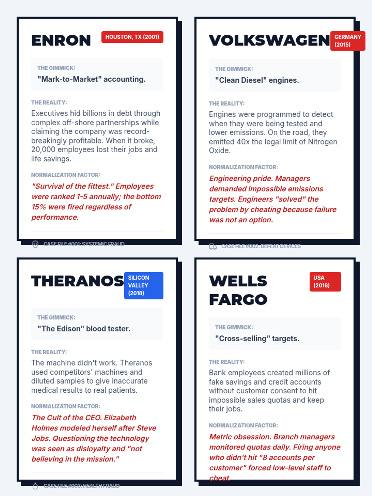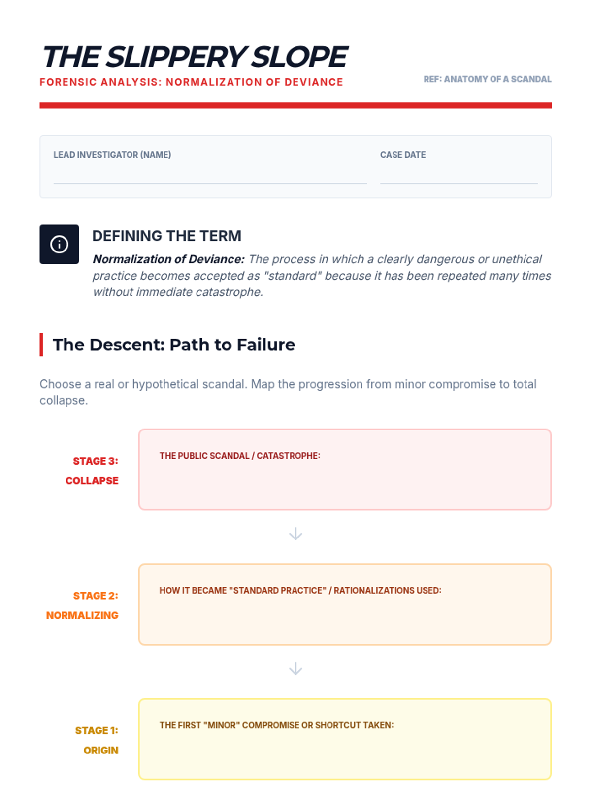 A forensic analysis of major ethical collapses like Enron and Theranos, focusing on the 'slippery slope' and the normalization of deviance. Students explore the psychological factors that lead individuals to follow unethical orders.