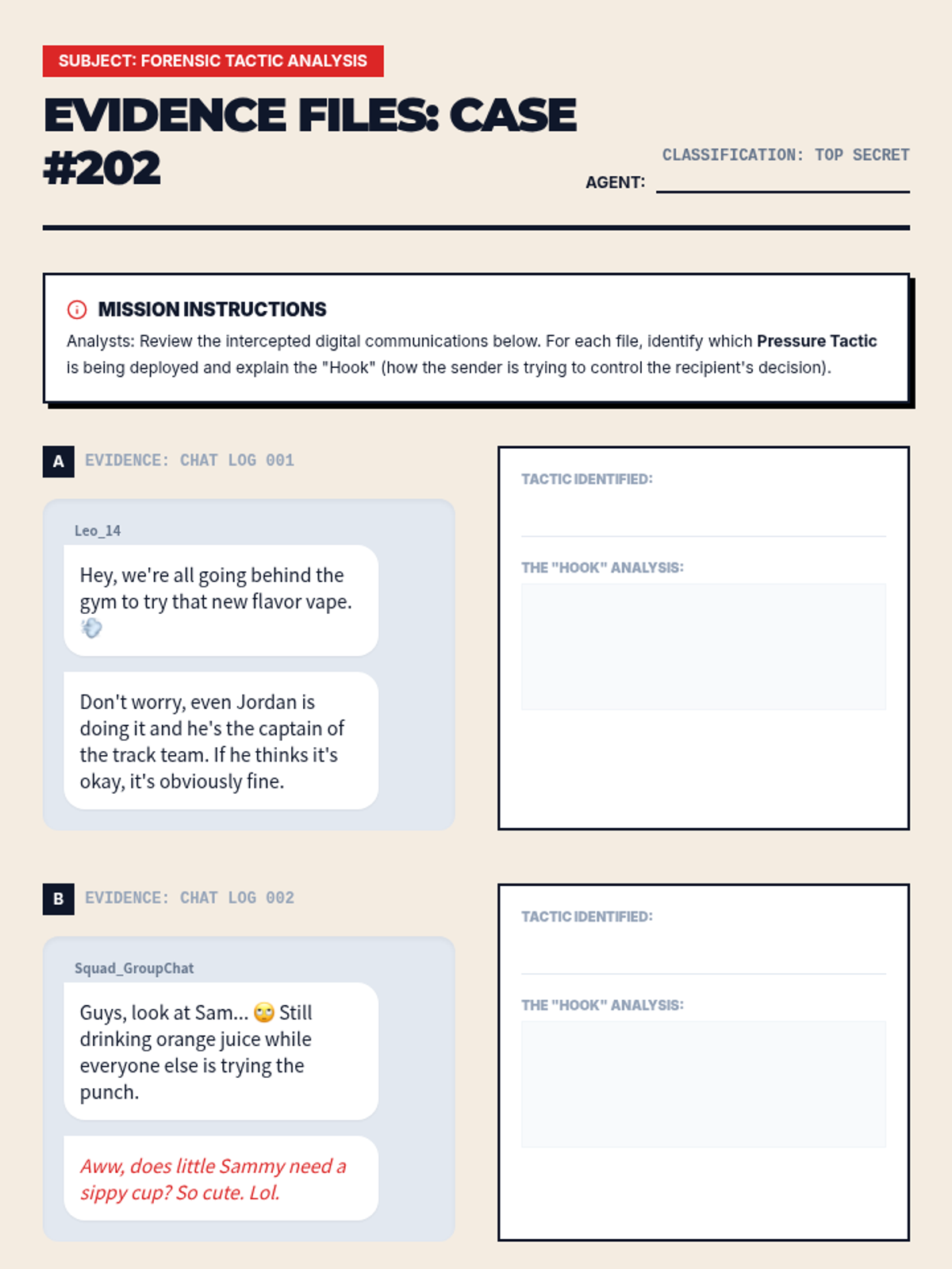Students identify and categorize four primary peer pressure tactics: The Huddle, The Tease, The Example, and The Reason. They analyze 'evidence' in the form of chat logs to spot these patterns in action.