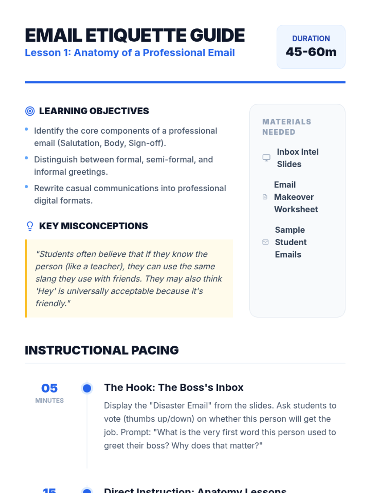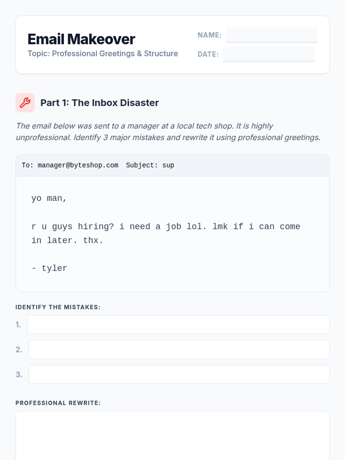 Students dissect formal email structures, focusing on professional salutations and sign-offs to ensure their written greetings match the context of their audience.