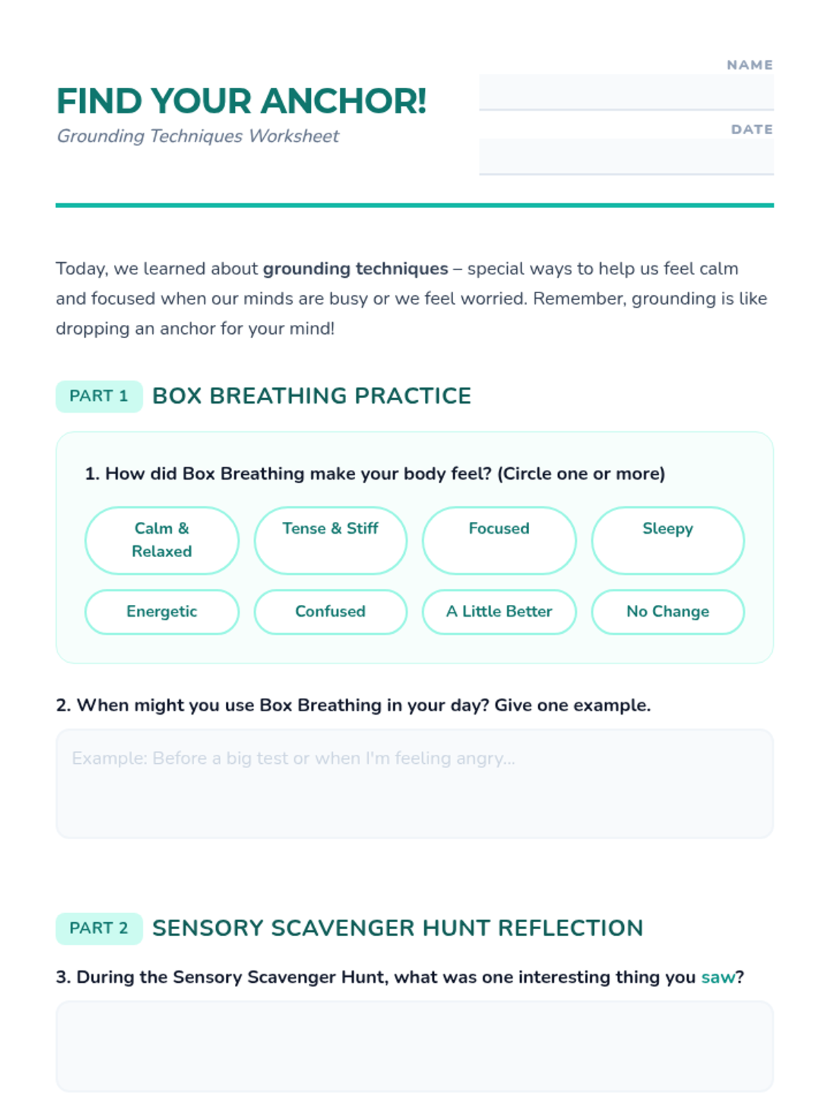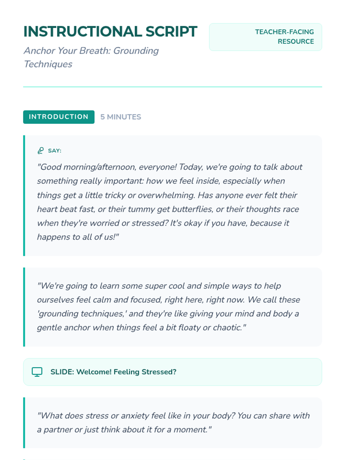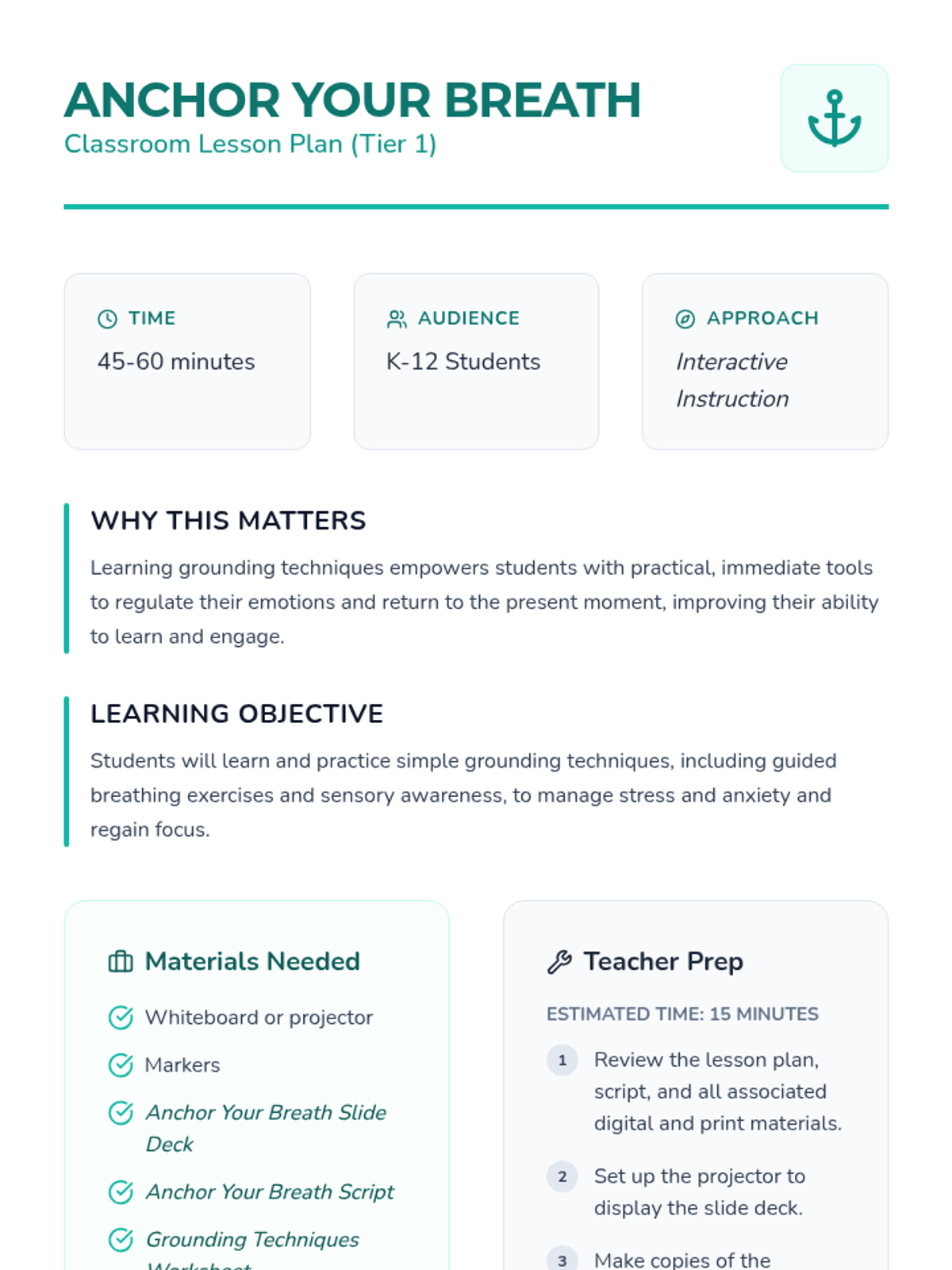 A single-session lesson for K-12 students focusing on accessible grounding techniques like box breathing and sensory awareness to manage stress and anxiety.