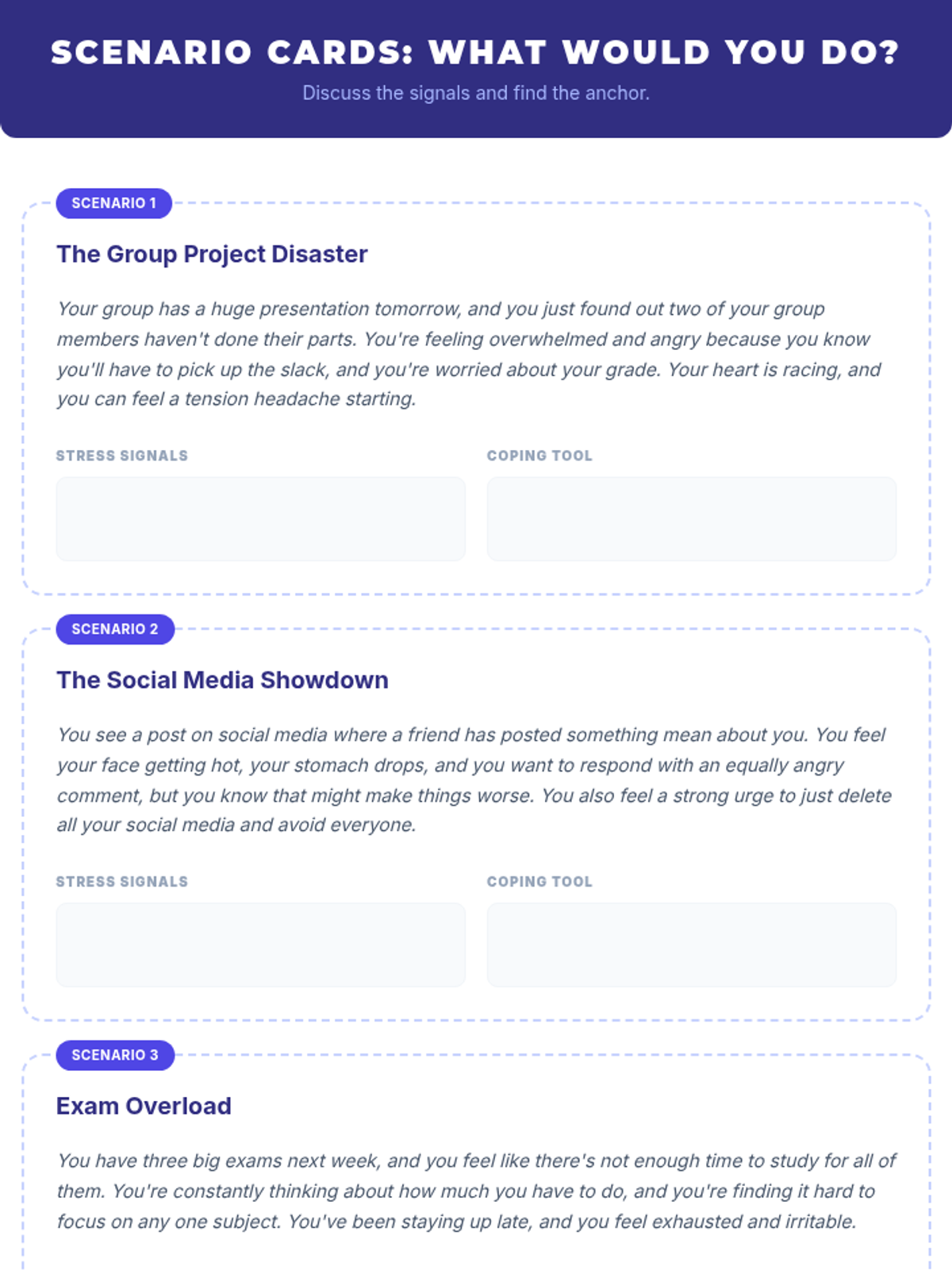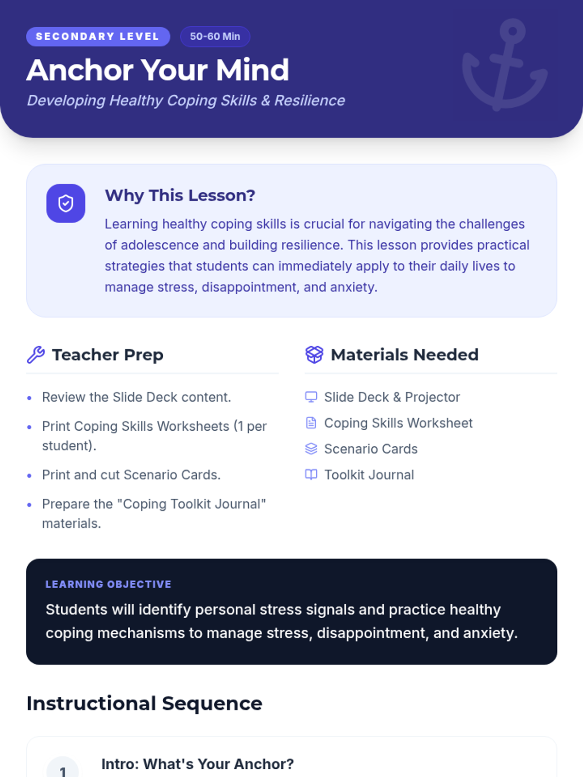 A lesson for secondary students to identify personal stress signals and build a personalized toolkit of healthy coping mechanisms.