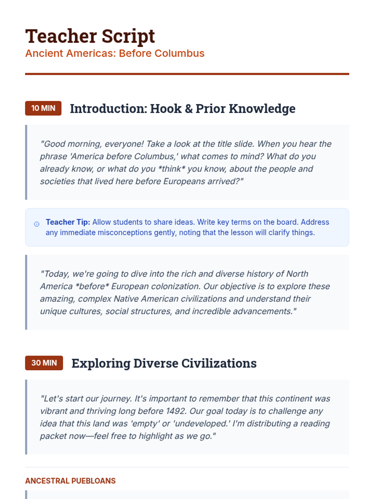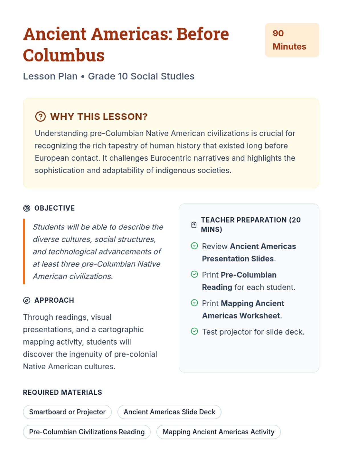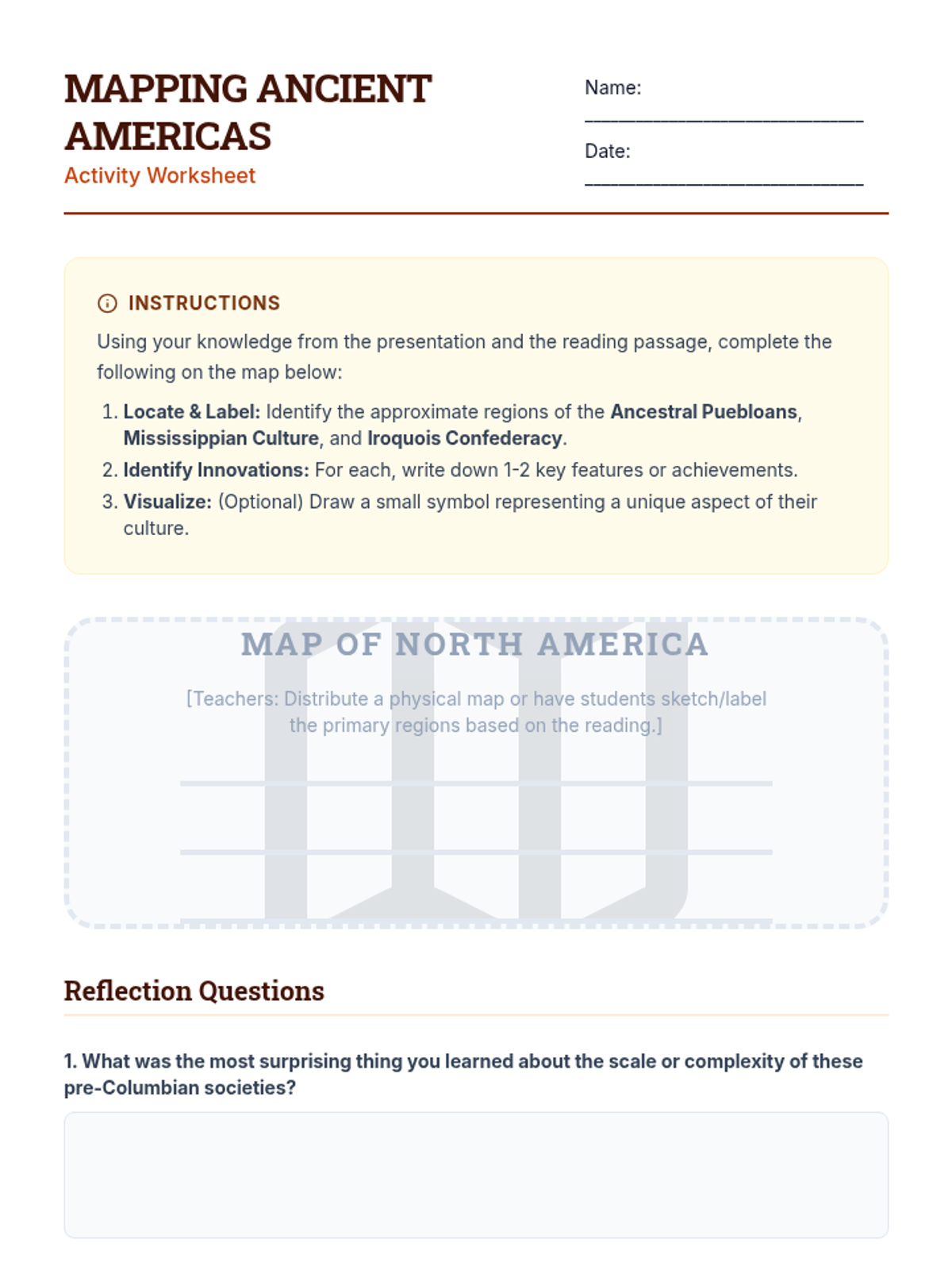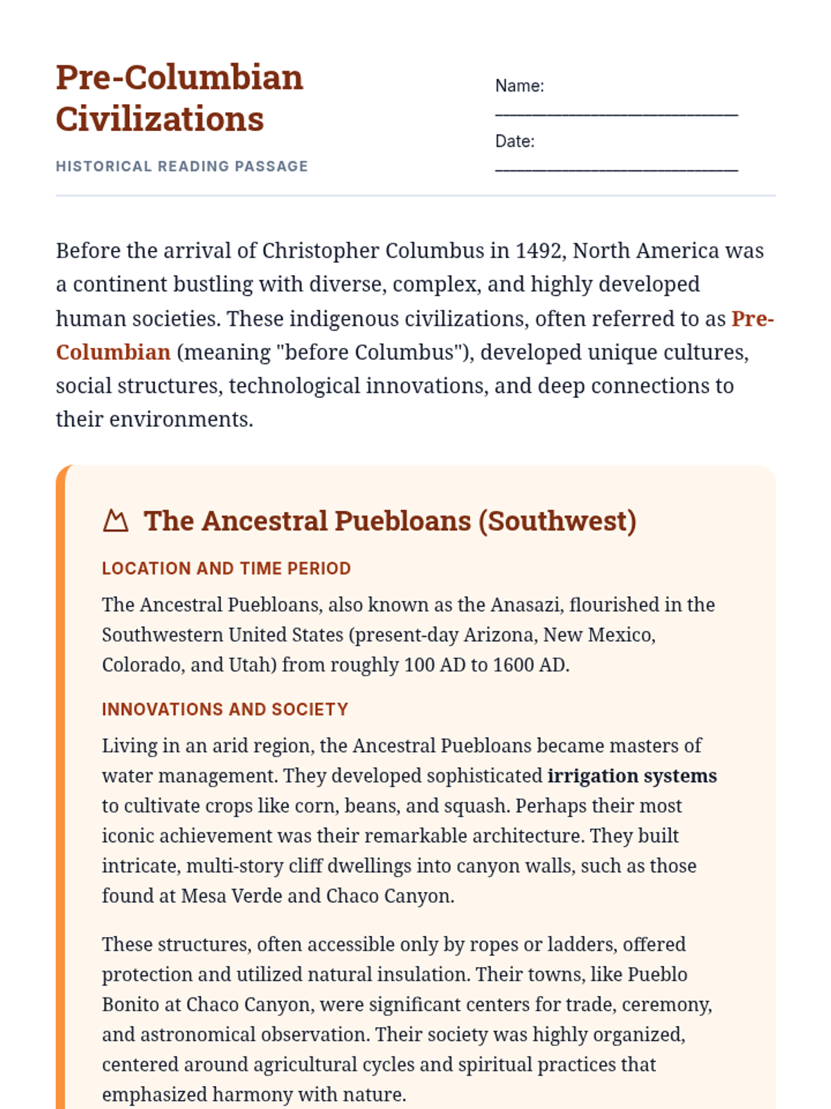 This lesson explores the rich and diverse civilizations of Native Americans across North America before European colonization, focusing on the Ancestral Puebloans, Mississippian culture, and Iroquois Confederacy. Students will analyze social structures, innovations, and cultural practices that thrived for centuries.