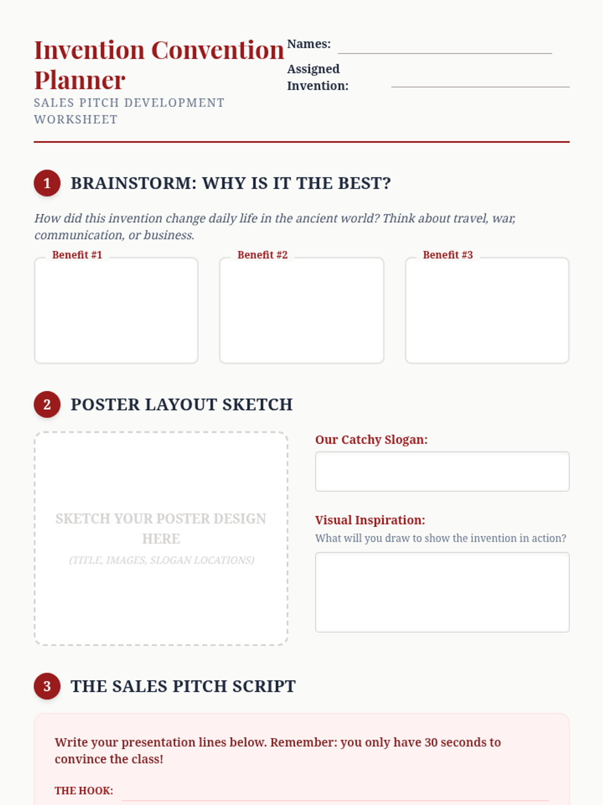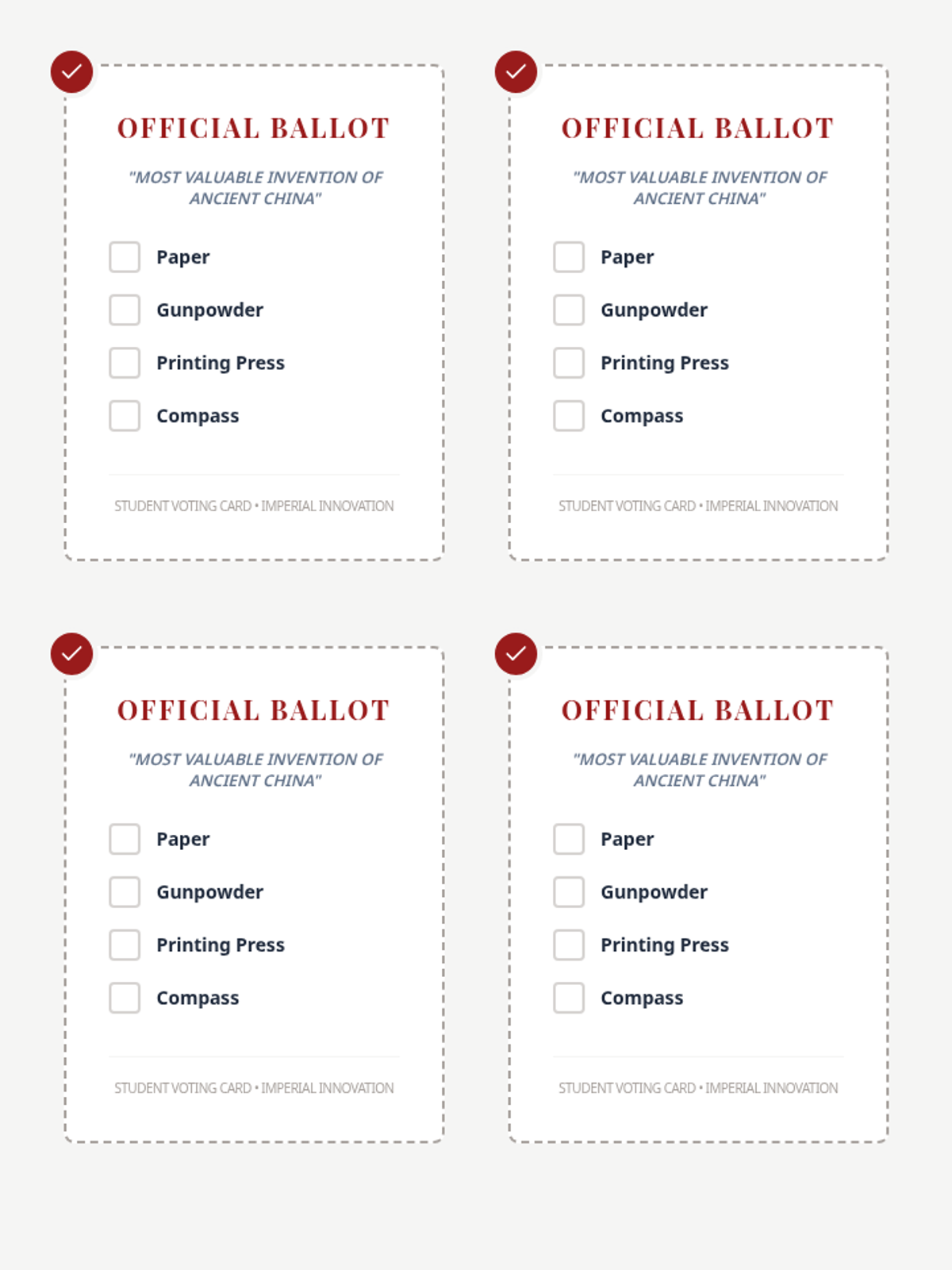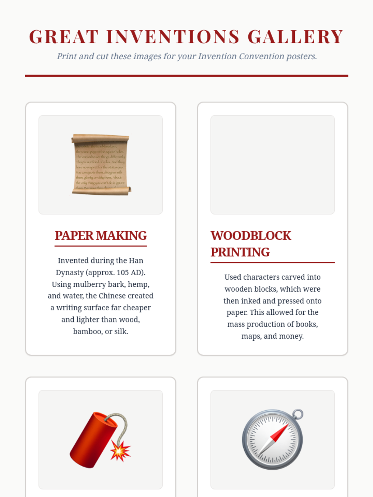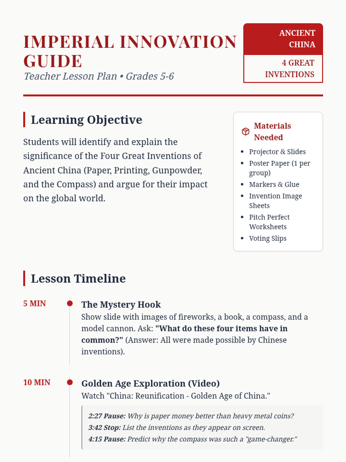 A comprehensive lesson exploring the Four Great Inventions of Ancient China (Paper, Printing, Gunpowder, and the Compass), featuring a video-based discussion and a 'sales pitch' group activity.