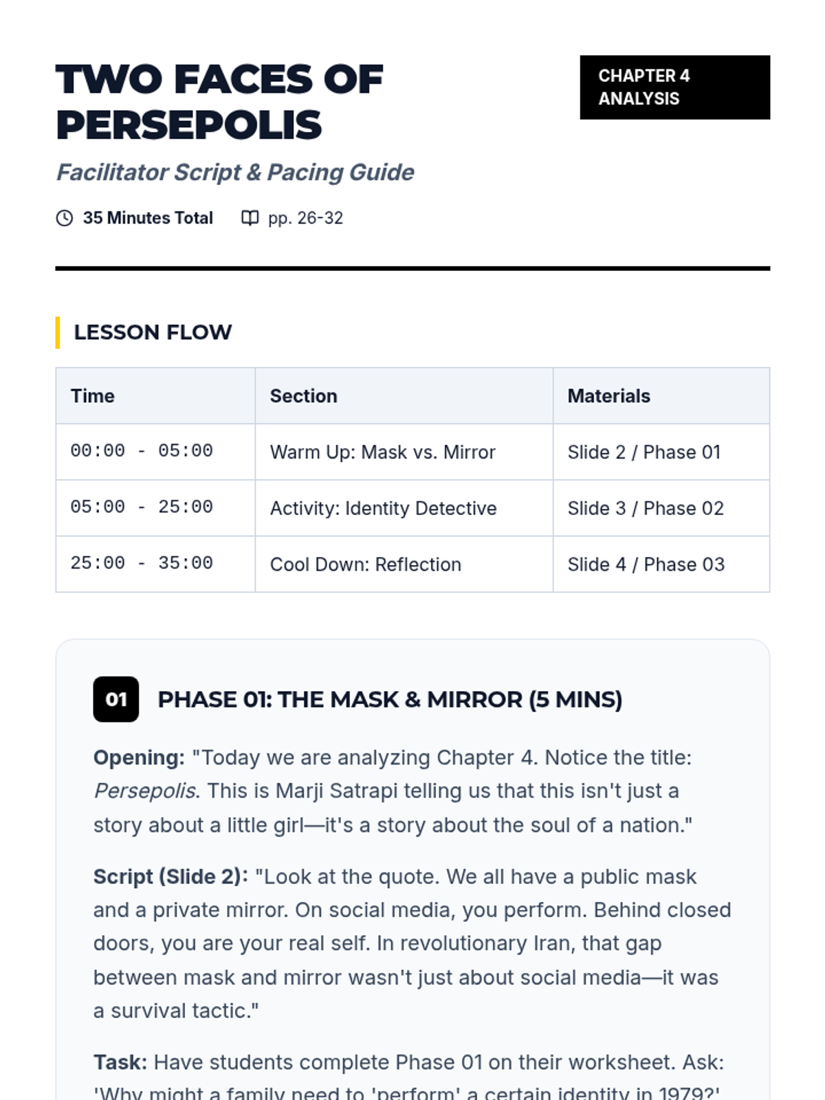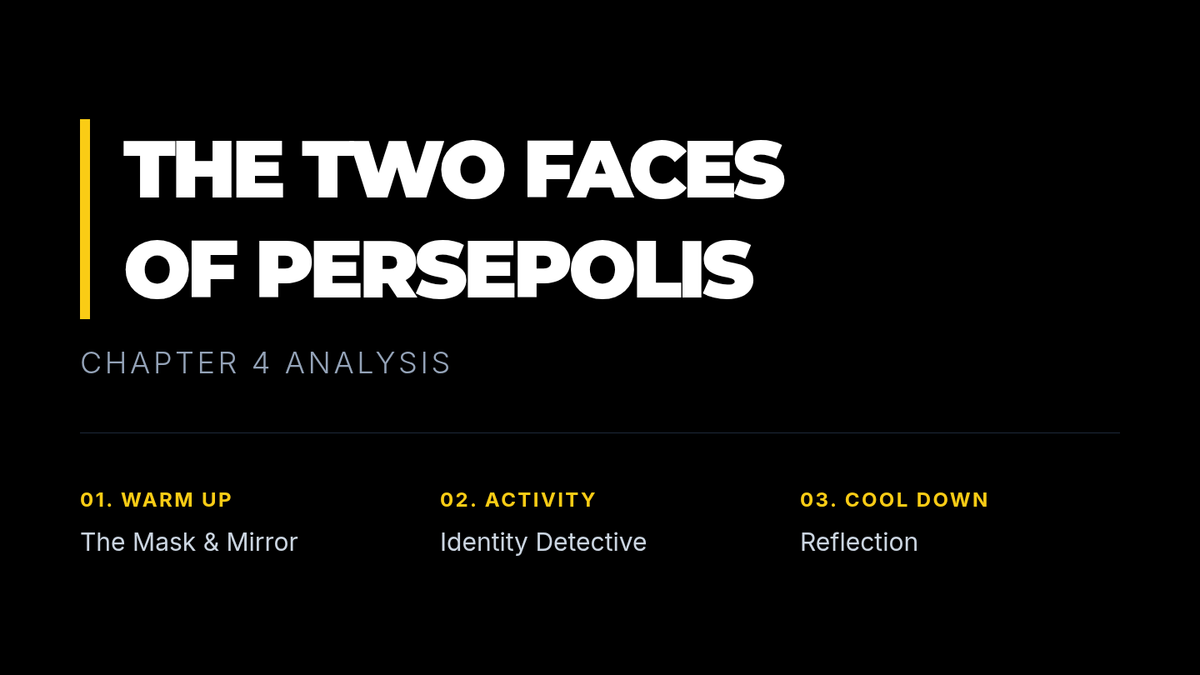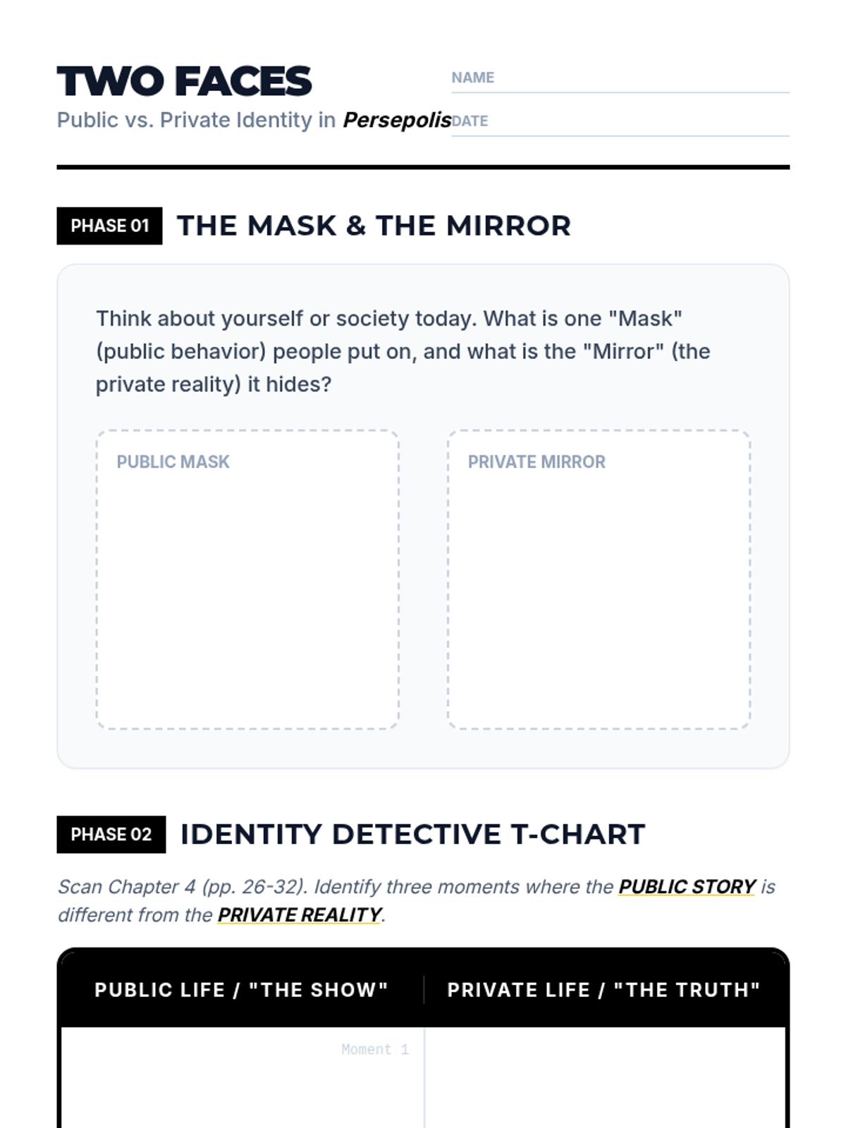 A 35-minute lesson exploring the theme of public vs. private identity in Chapter 4 of Persepolis. Students analyze how characters navigate the contradictions between their personal lives and the political atmosphere of 1970s Iran.