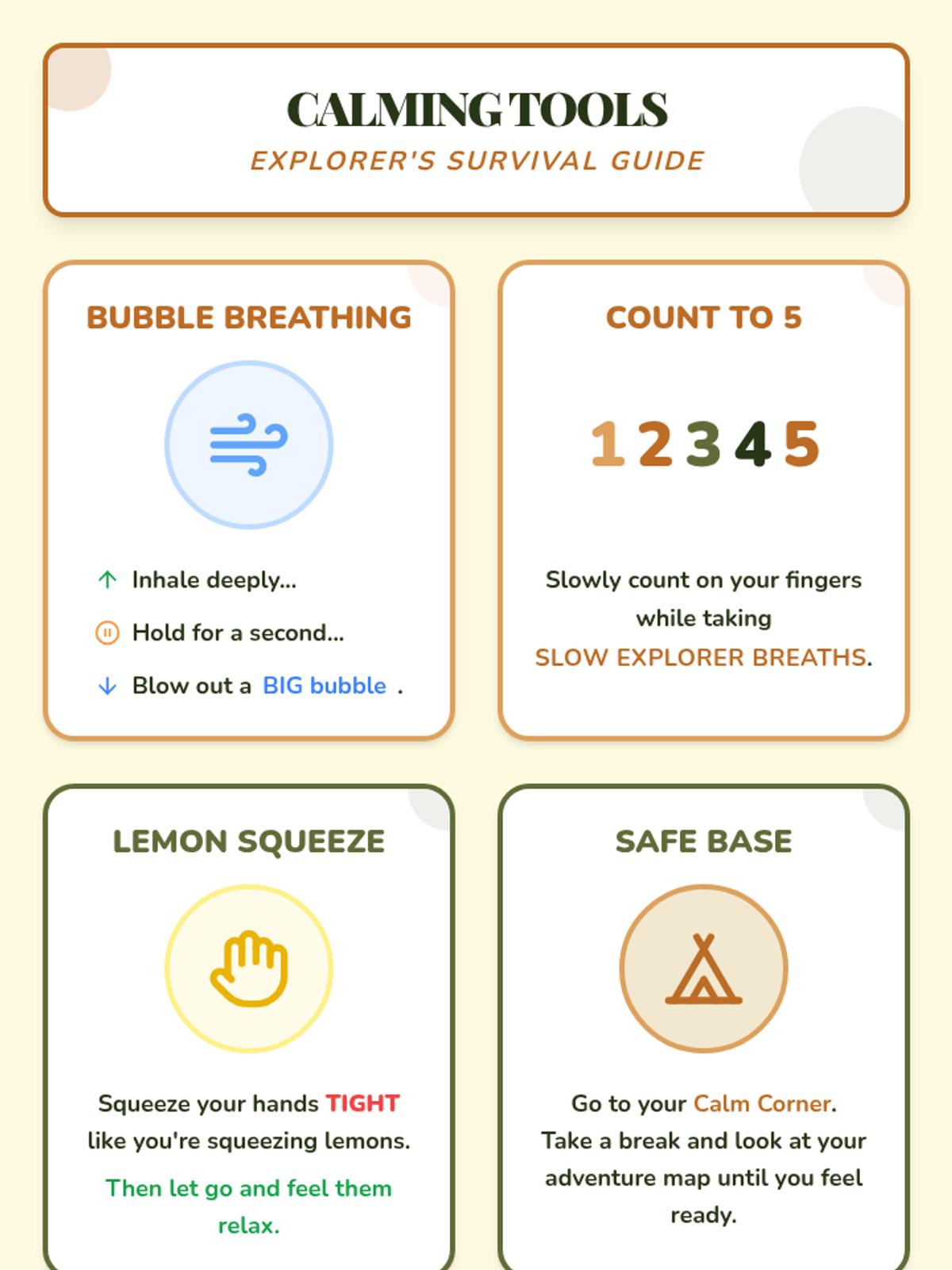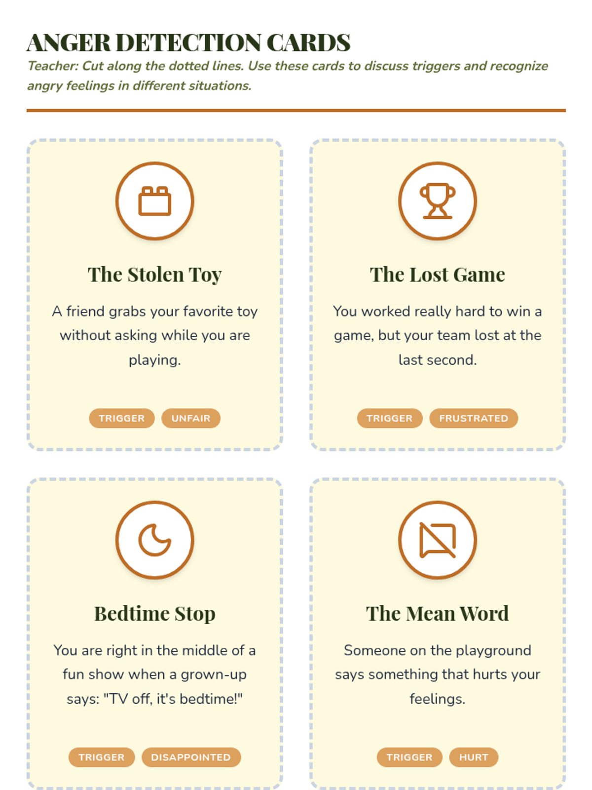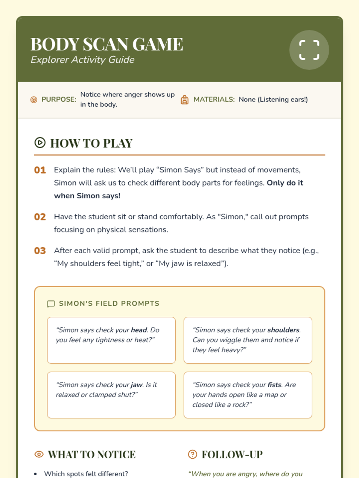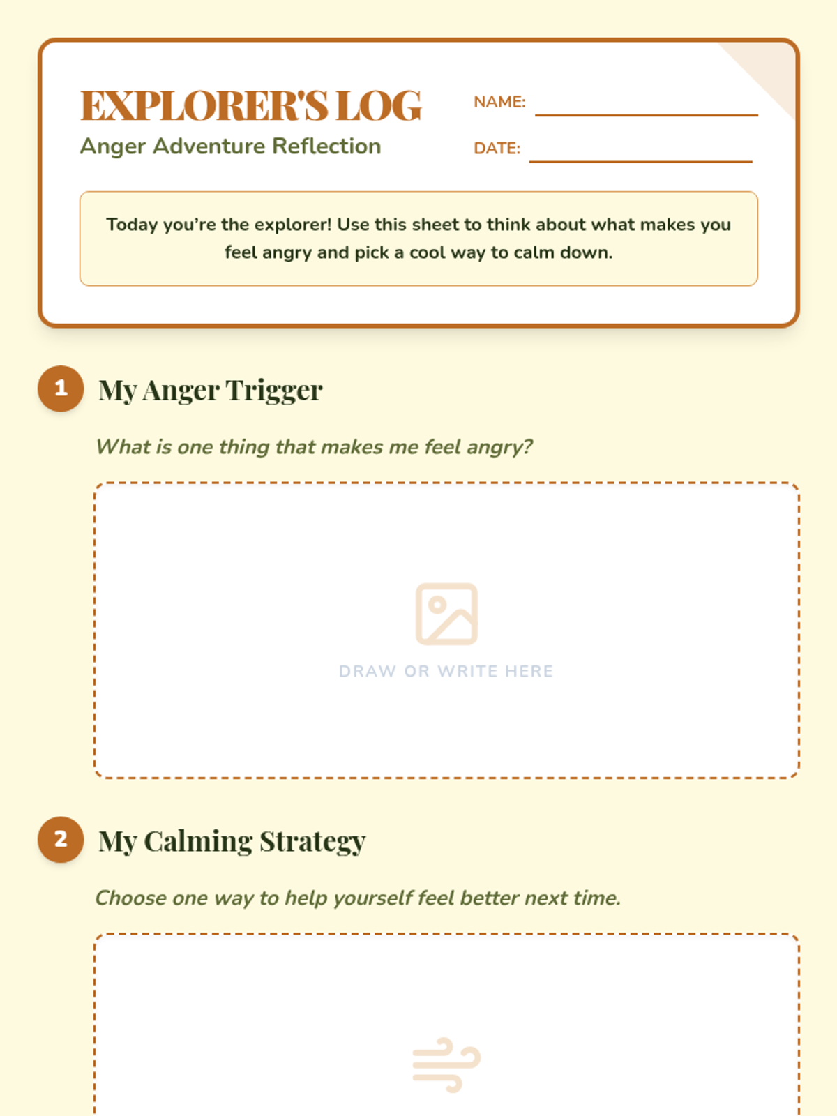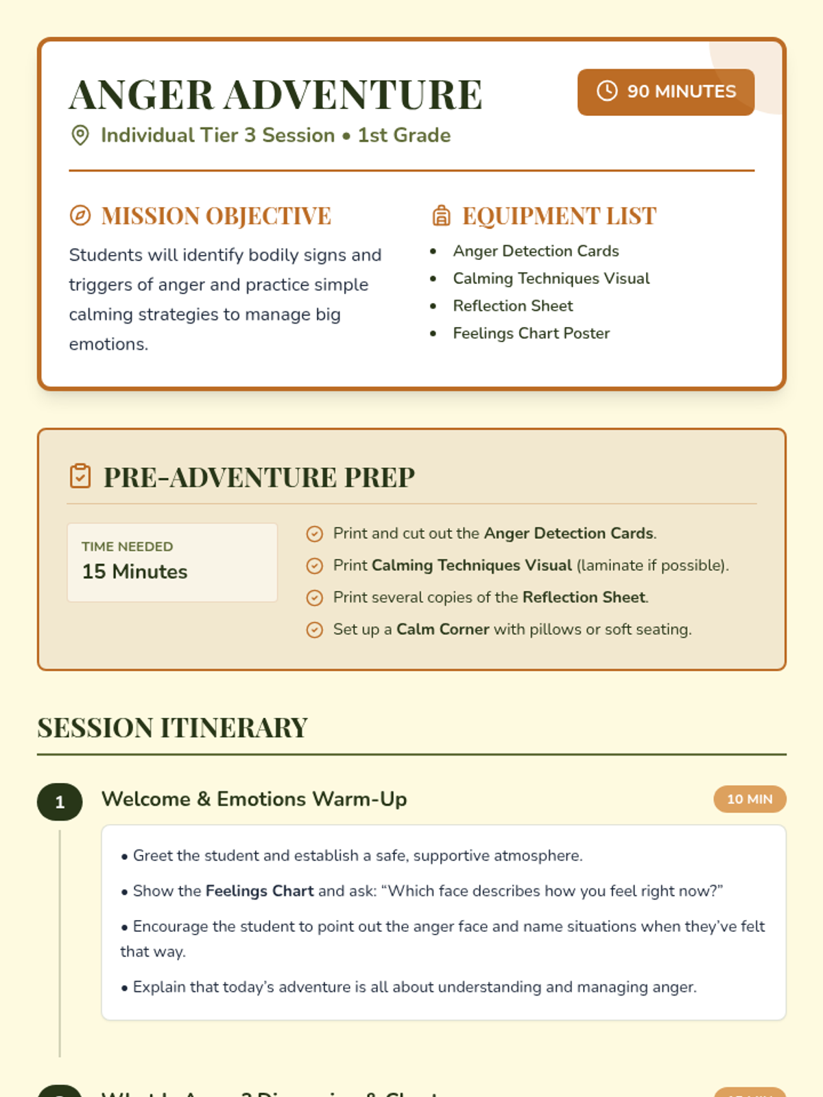 A 90-minute Tier 3 individual session for first graders focused on identifying anger triggers, recognizing body clues, and practicing calming strategies through an engaging adventure theme.