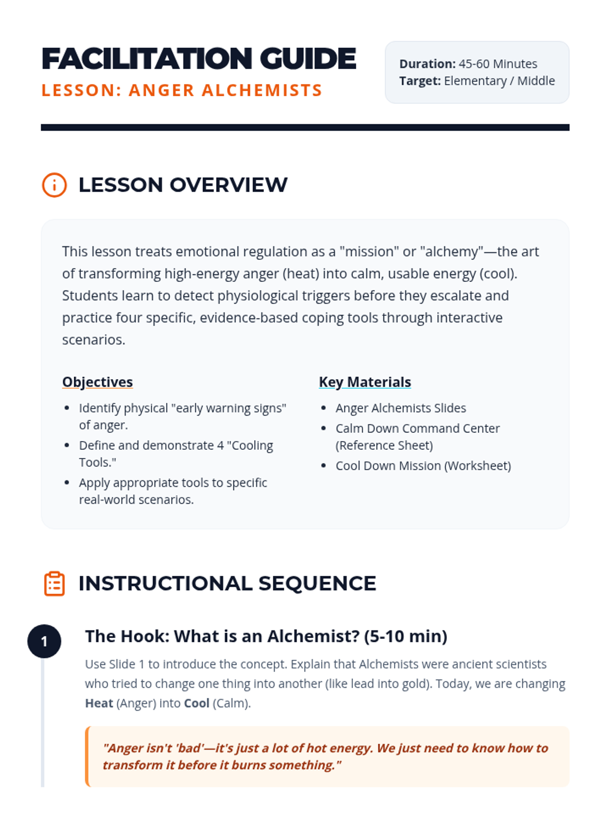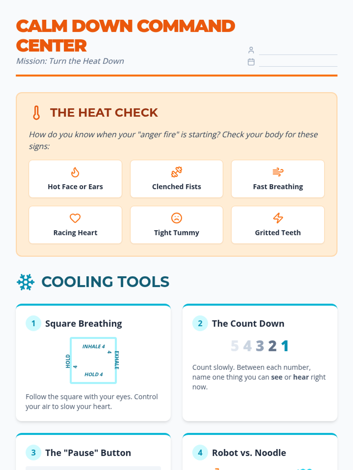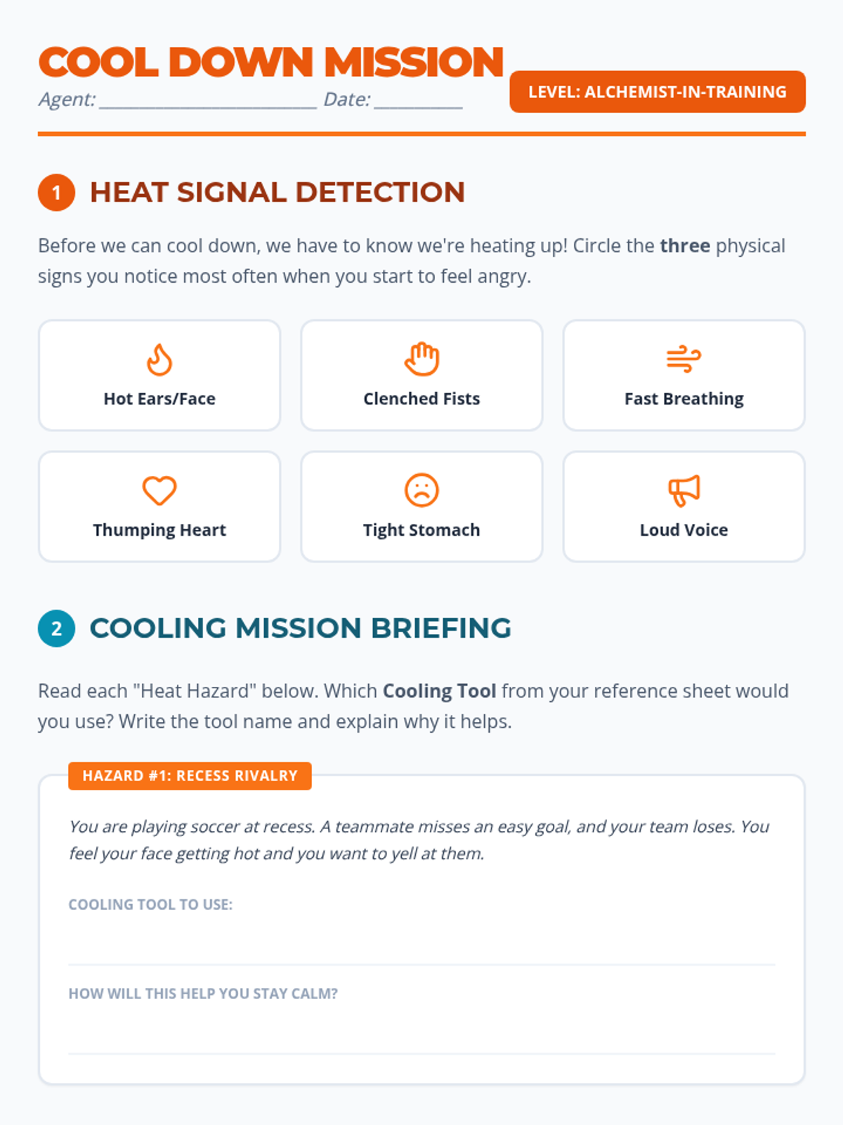 A lesson focused on identifying the physical signs of anger and practicing specific coping strategies through real-world scenarios. Students learn to 'cool down' their emotional fire using a variety of sensory and cognitive tools.