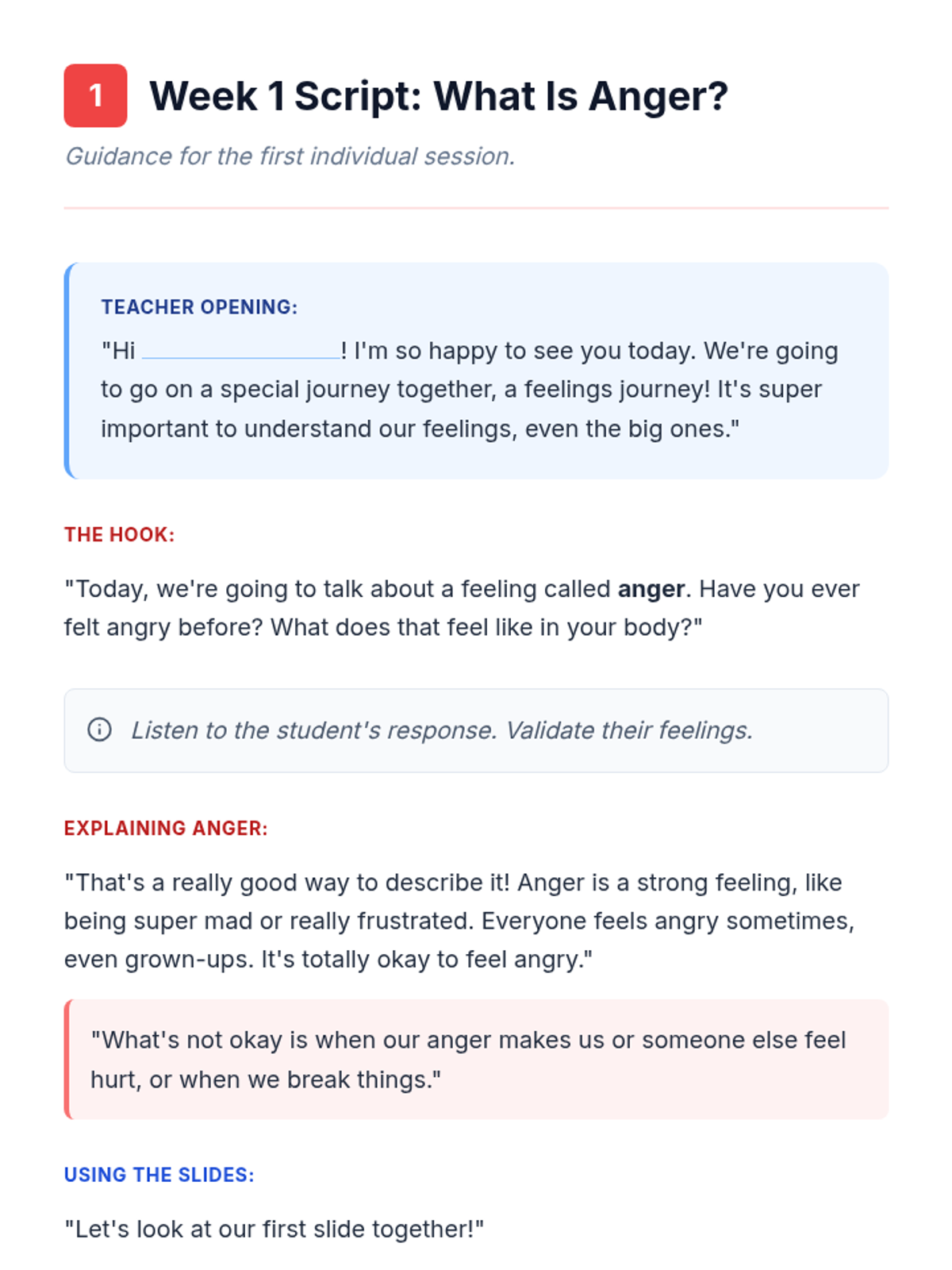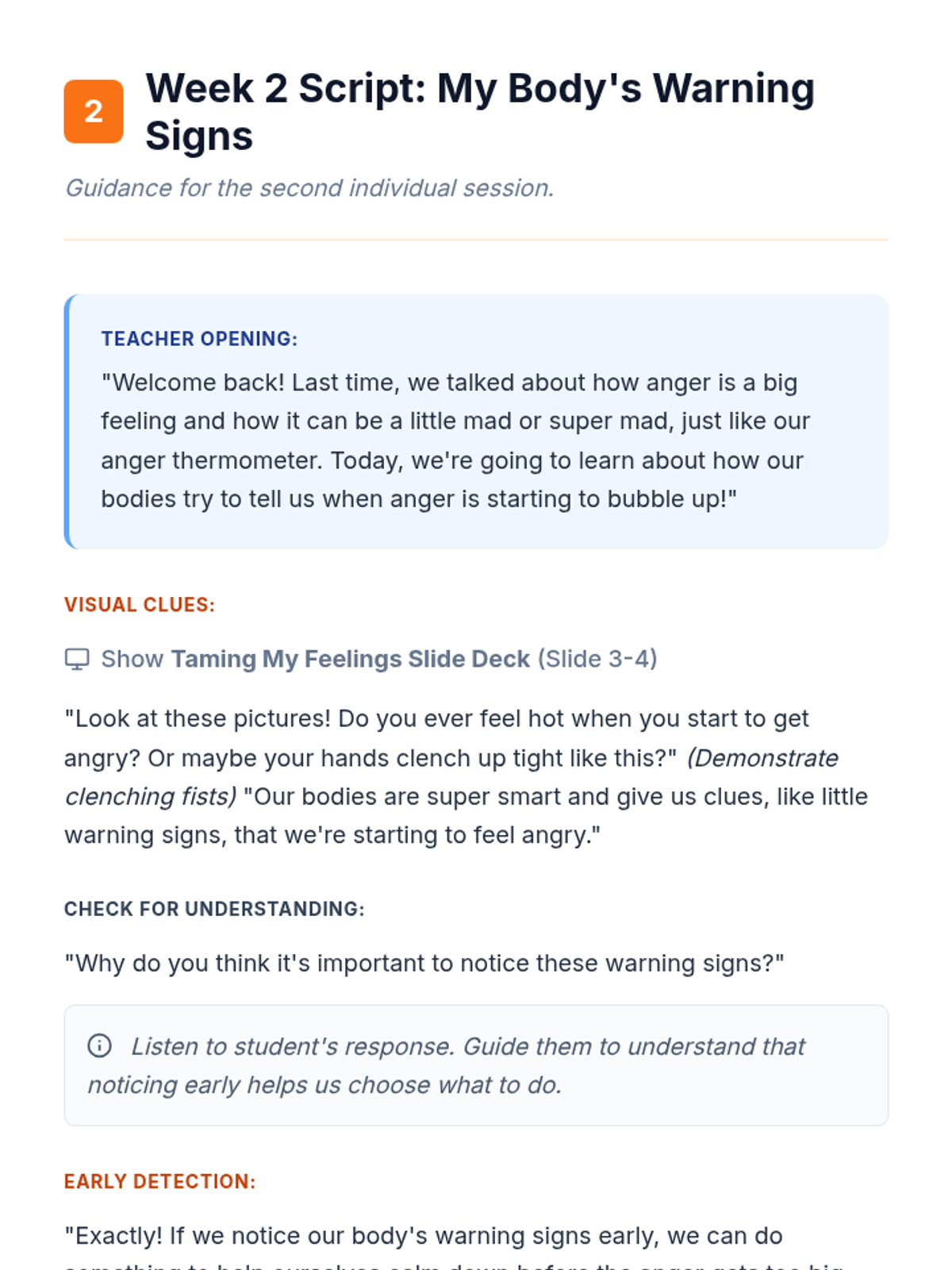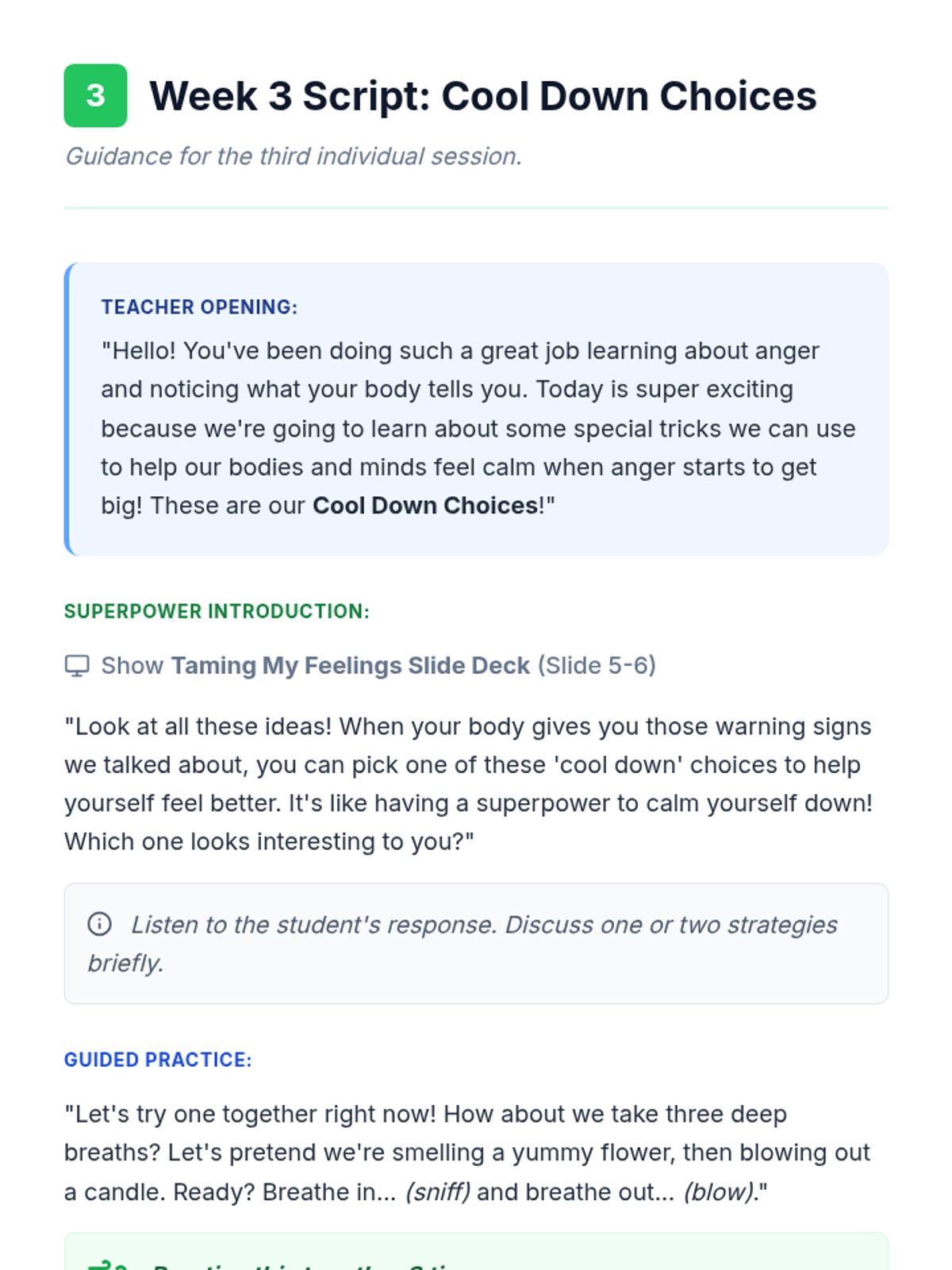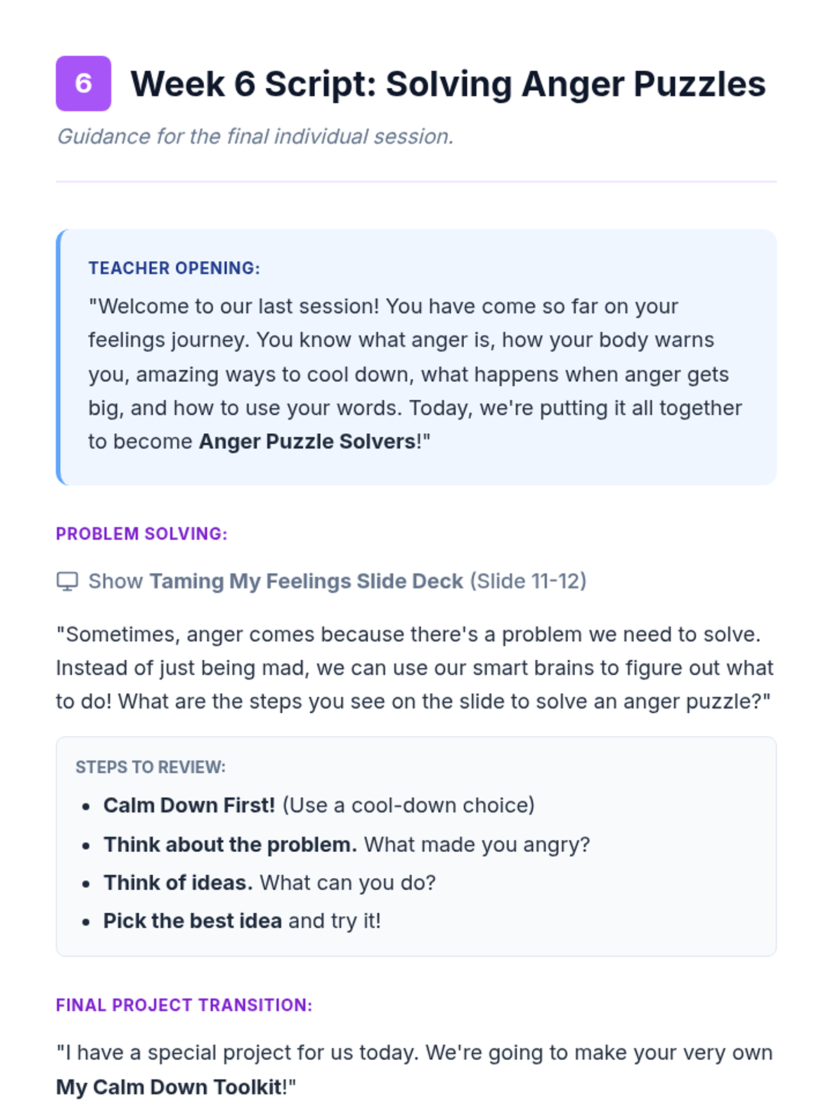 A 6-week individual intervention helping students recognize physical anger signs and build a personalized toolkit of calming strategies.