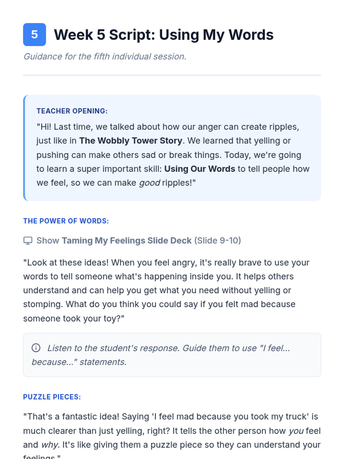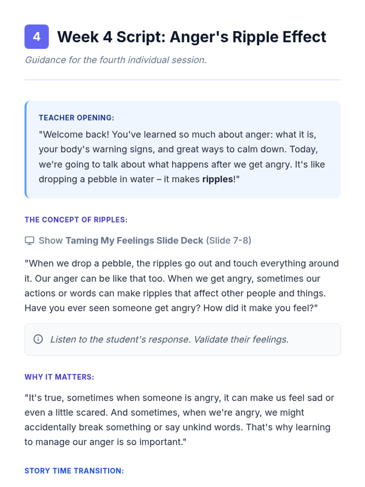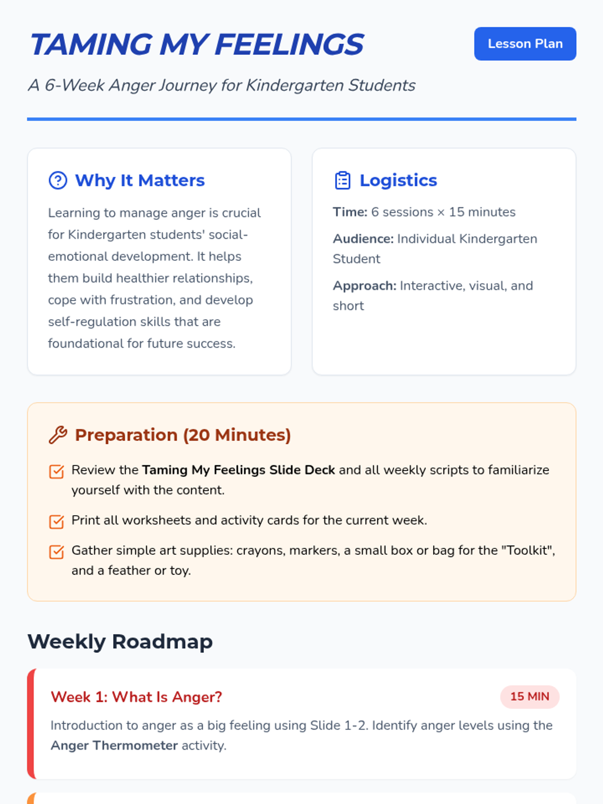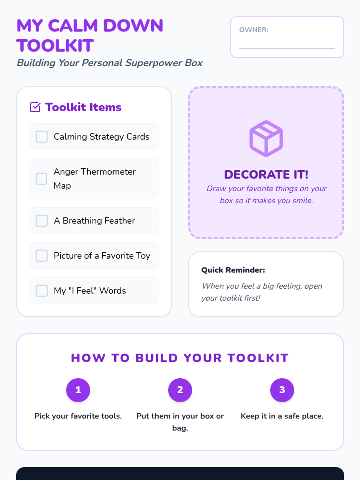 A 6-week individual intervention helping students recognize physical anger signs and build a personalized toolkit of calming strategies.