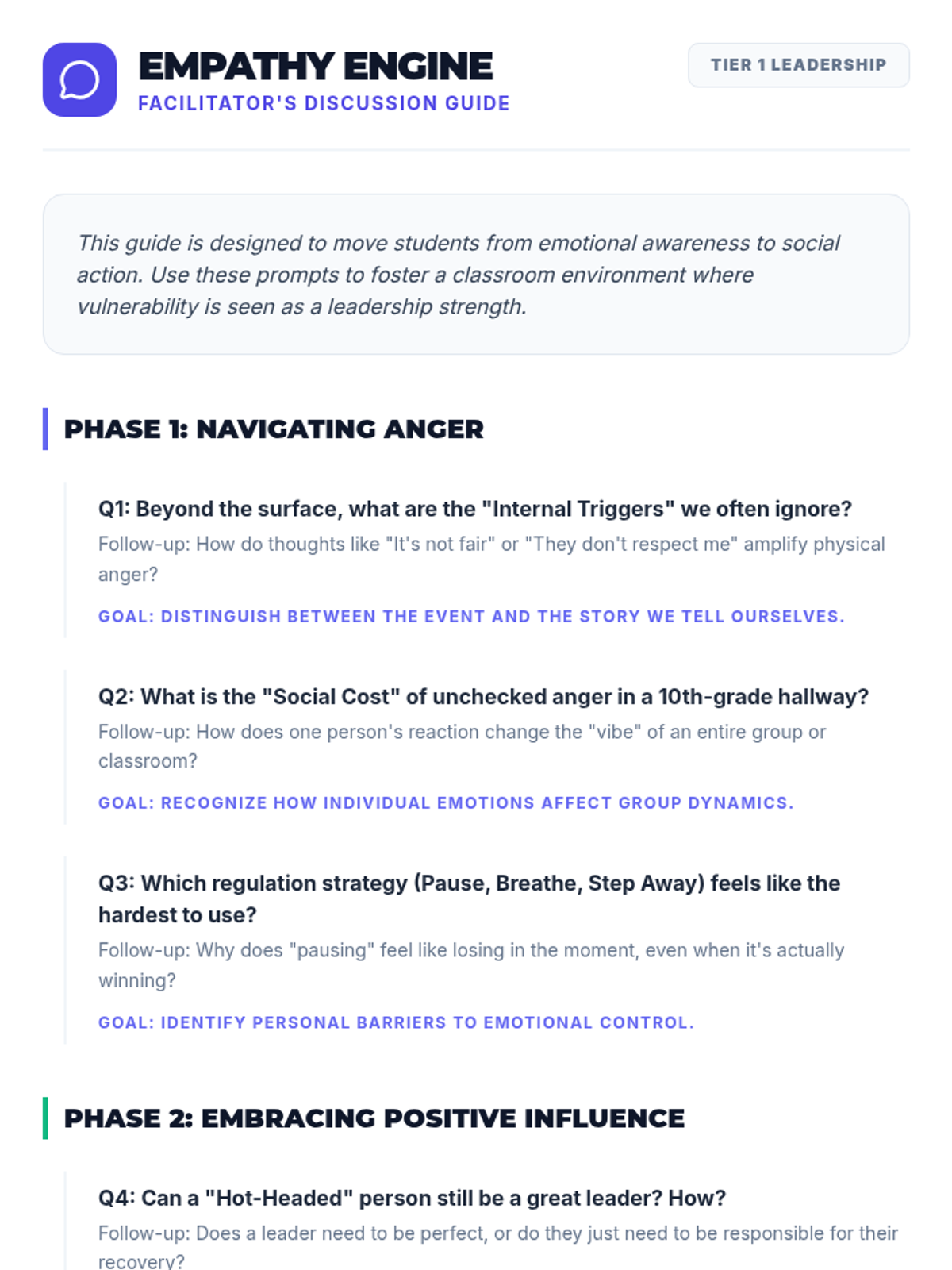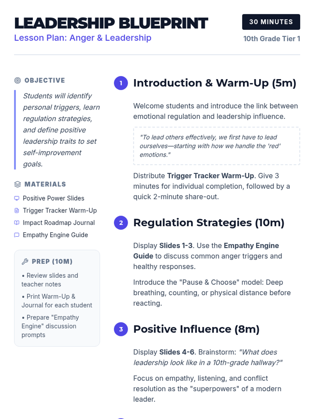 A 30-minute lesson for 10th-grade students focusing on emotional regulation and leadership. Students learn to identify anger triggers and set actionable goals for positive peer influence and personal growth.