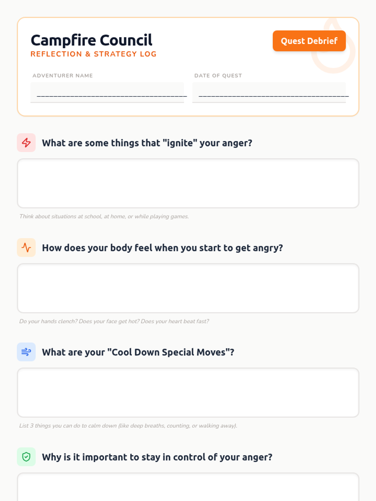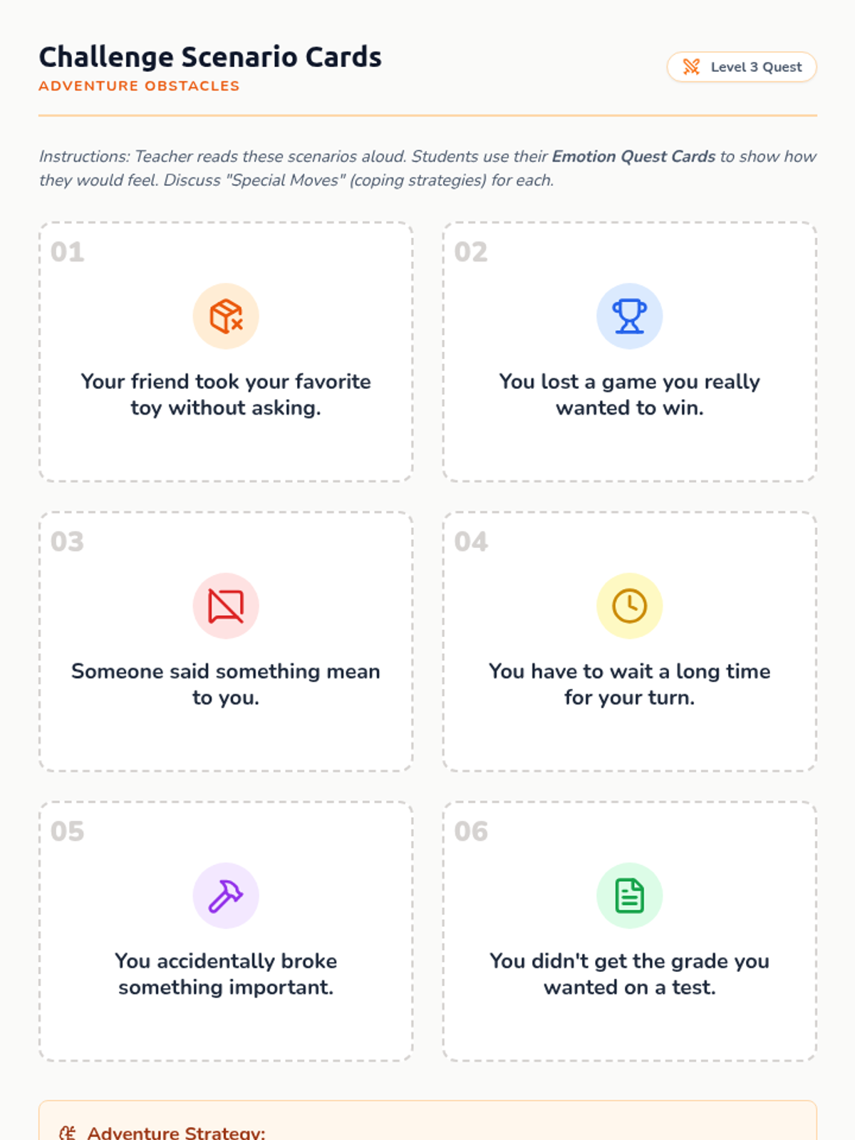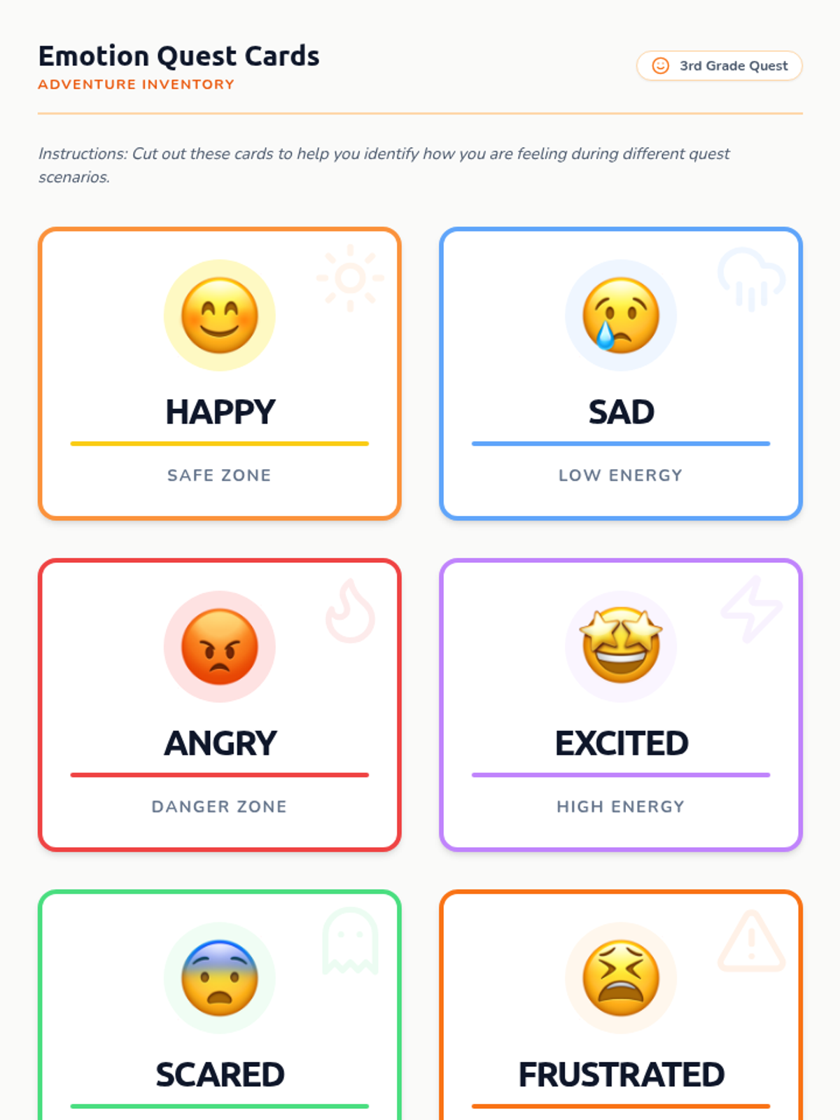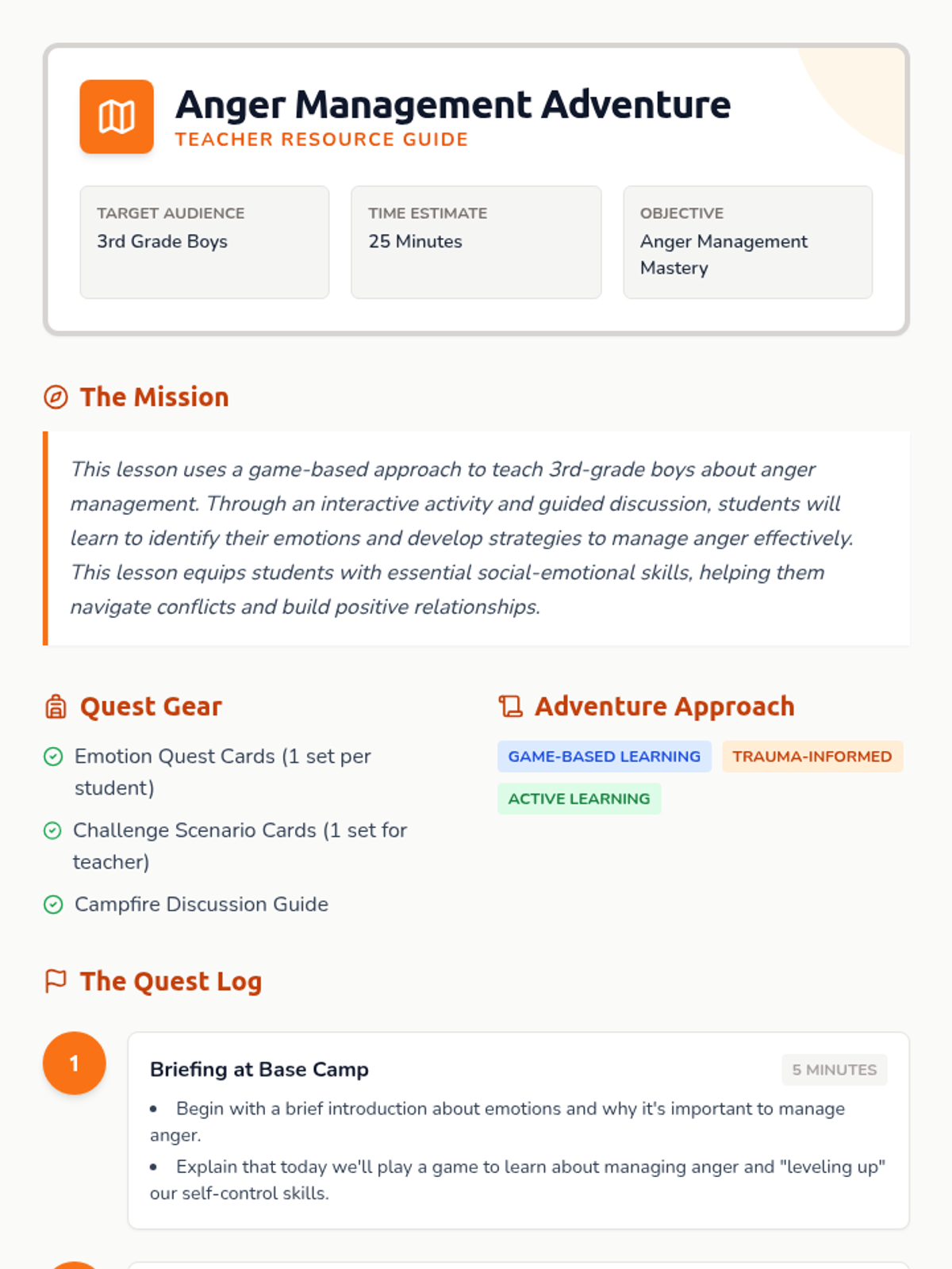 A game-based lesson for 3rd-grade boys to identify emotions and develop anger management strategies through an adventure-themed quest.
