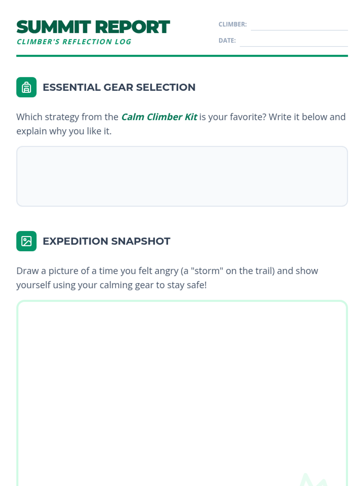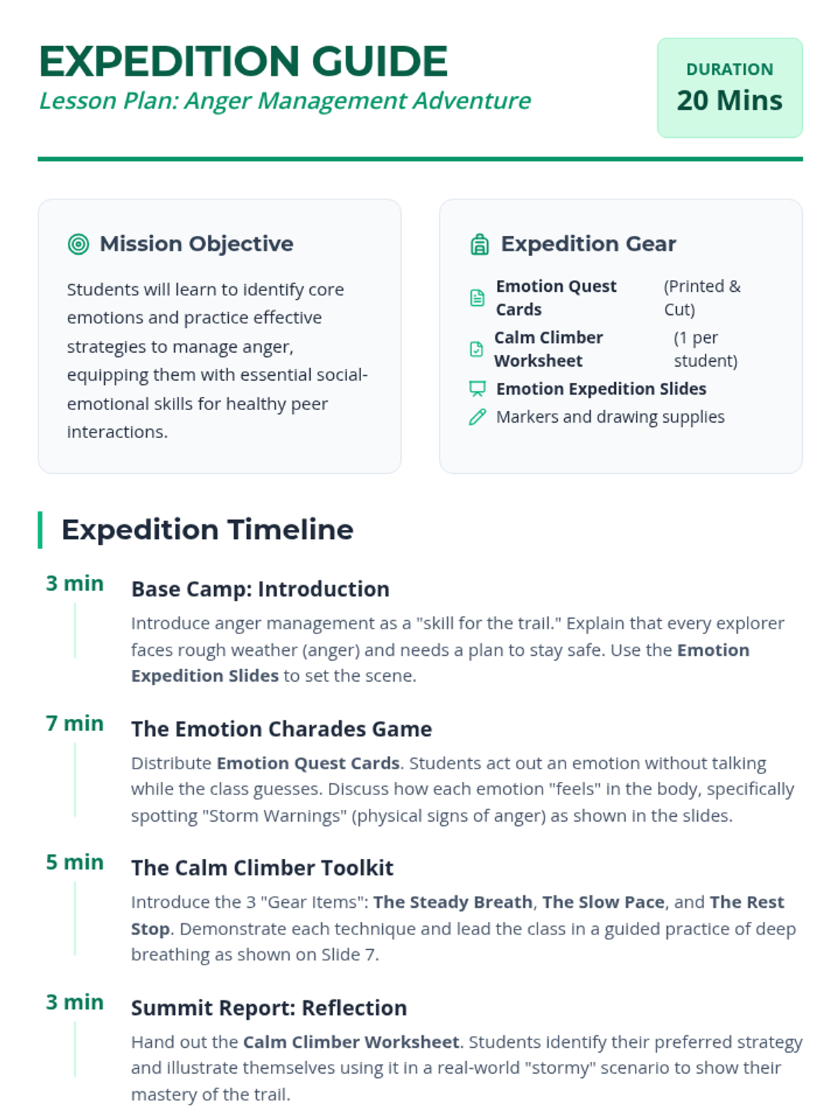 A 20-minute interactive lesson for 4th grade students using a mountain climbing theme to learn and practice anger management strategies.