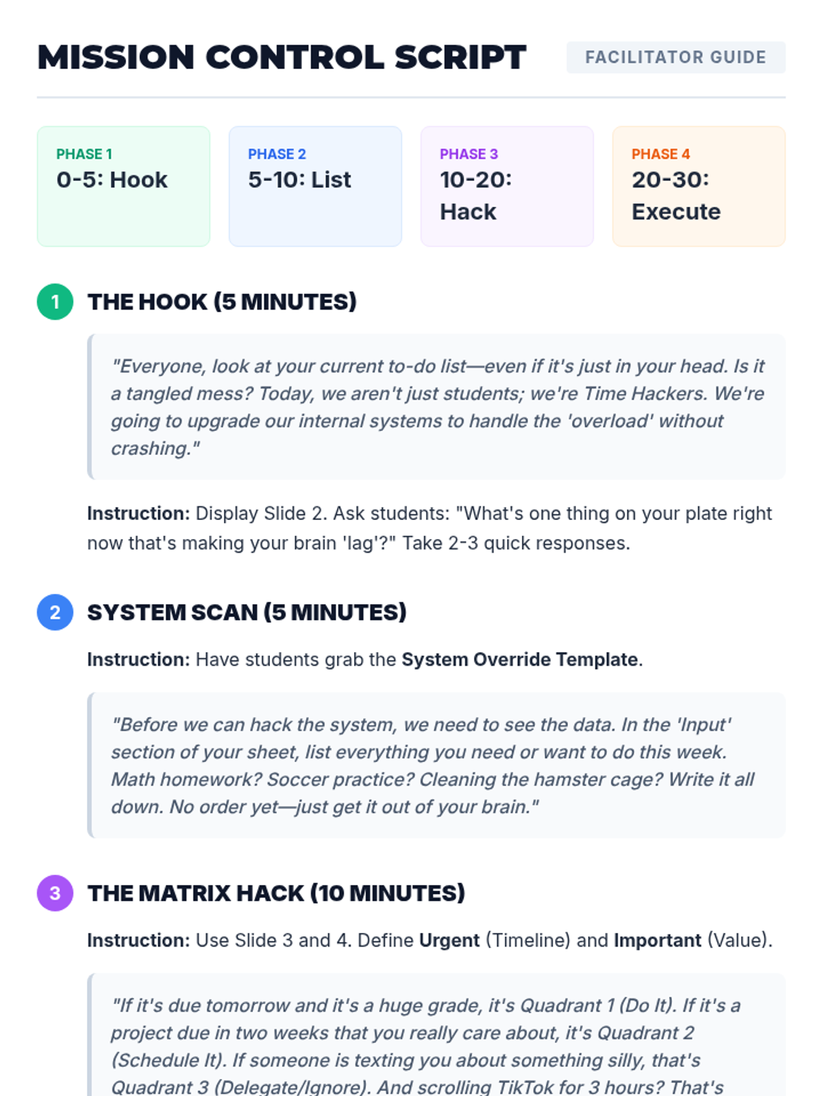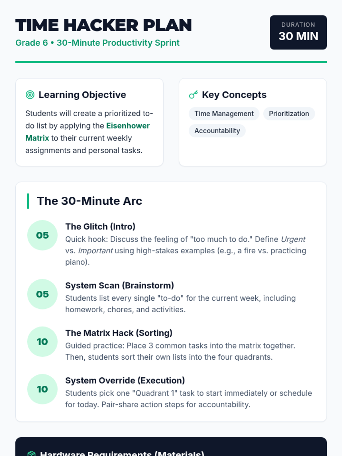 A fast-paced 30-minute lesson designed to help 6th graders master their schedules using the Eisenhower Matrix. Students learn to distinguish between urgent and important tasks to boost productivity and reduce stress.