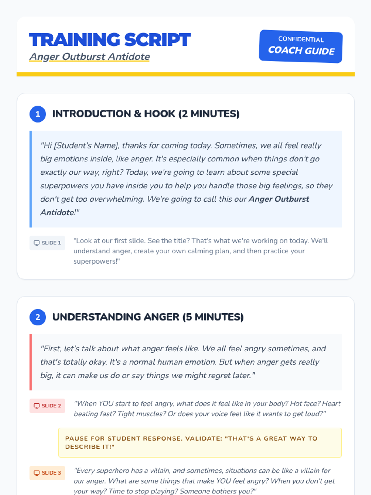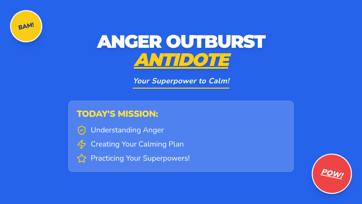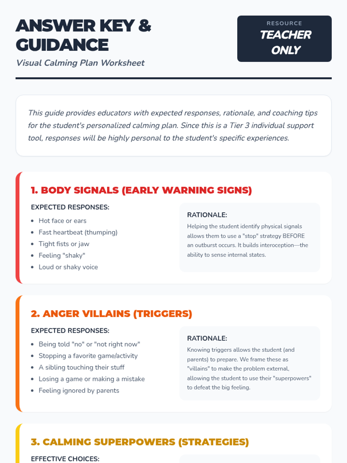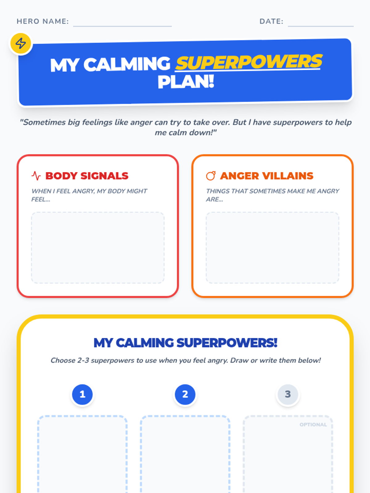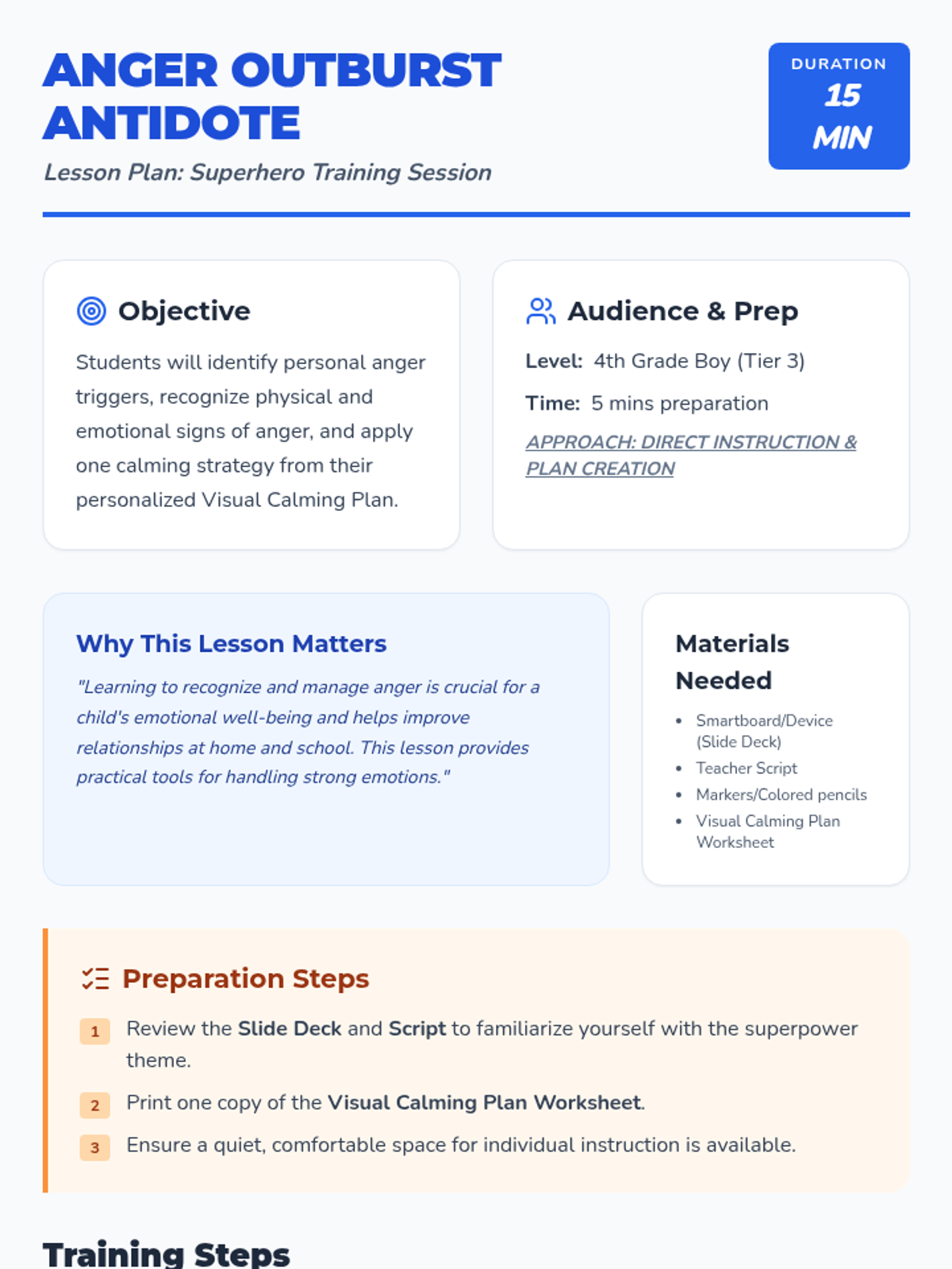 A 15-minute Tier 3 lesson for a 4th-grade student to recognize anger triggers and develop a personalized calming superpower plan.