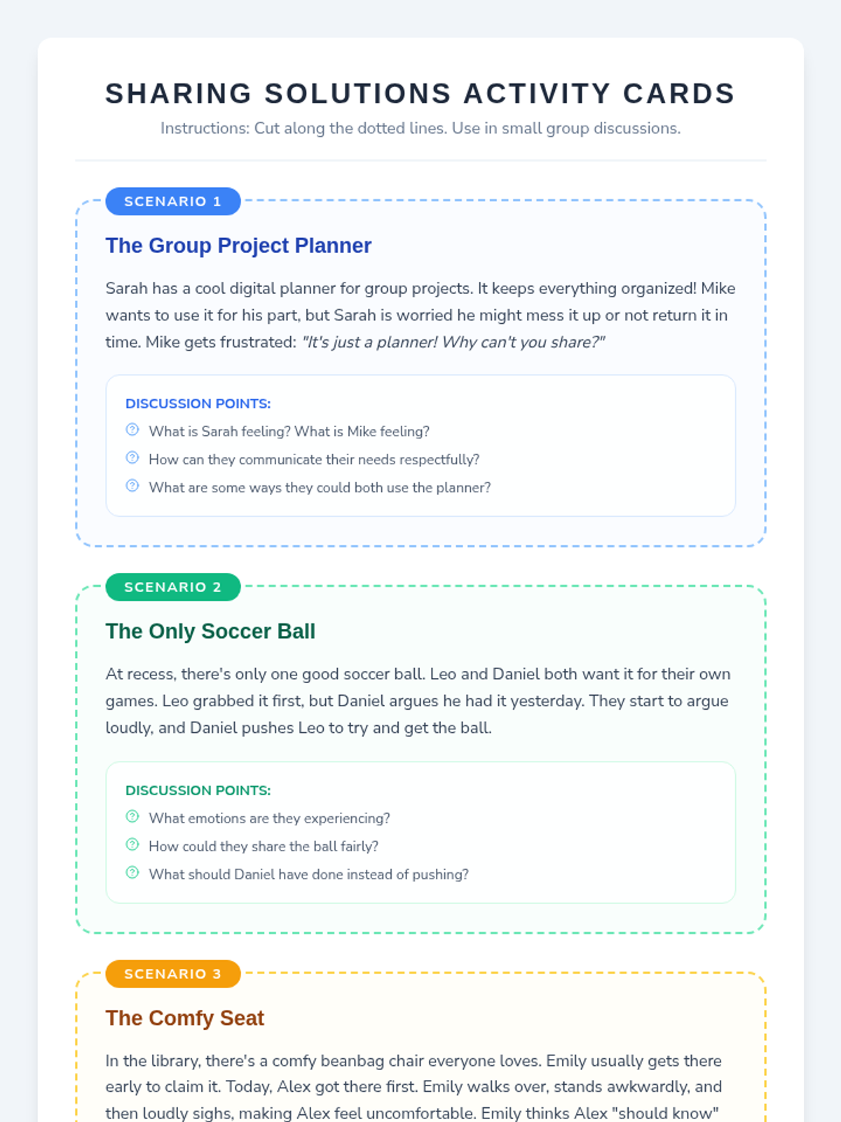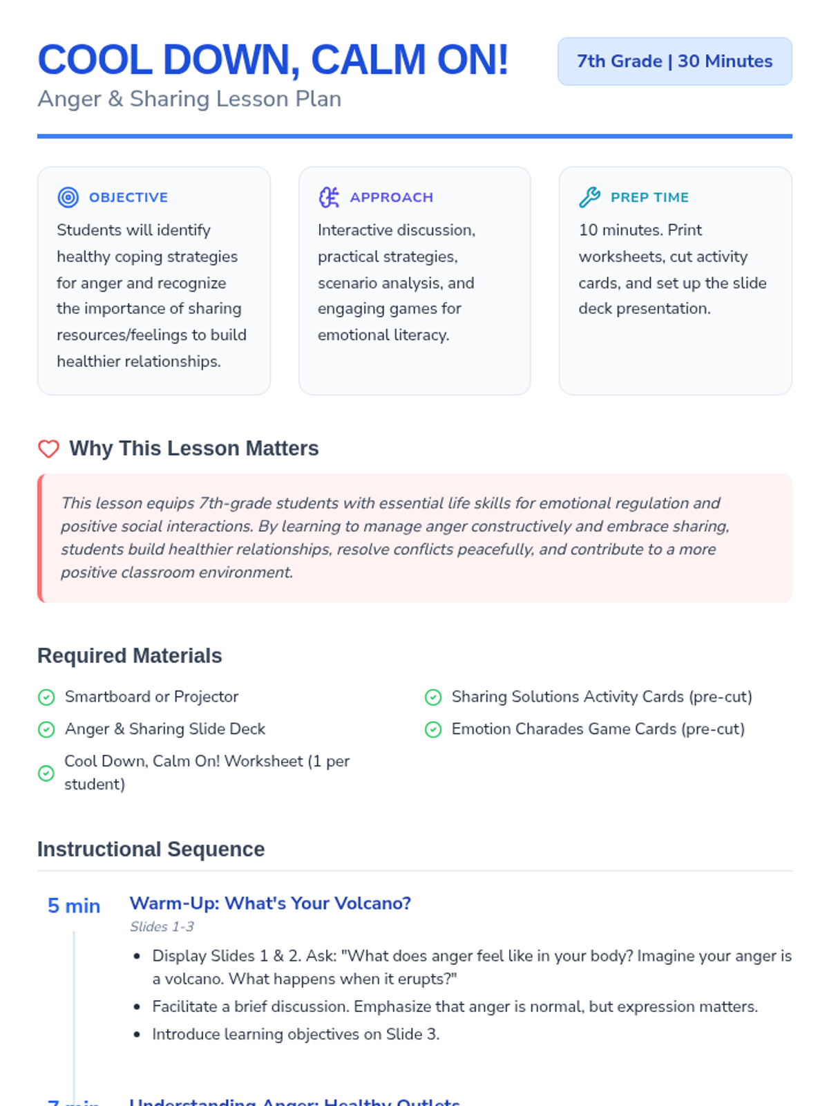 A 30-minute Tier 1 SEL lesson for 7th graders focused on identifying healthy coping strategies for anger and the importance of sharing resources and feelings. Students engage in interactive discussions, scenario-based problem solving, and a charades game to build emotional literacy and empathy.