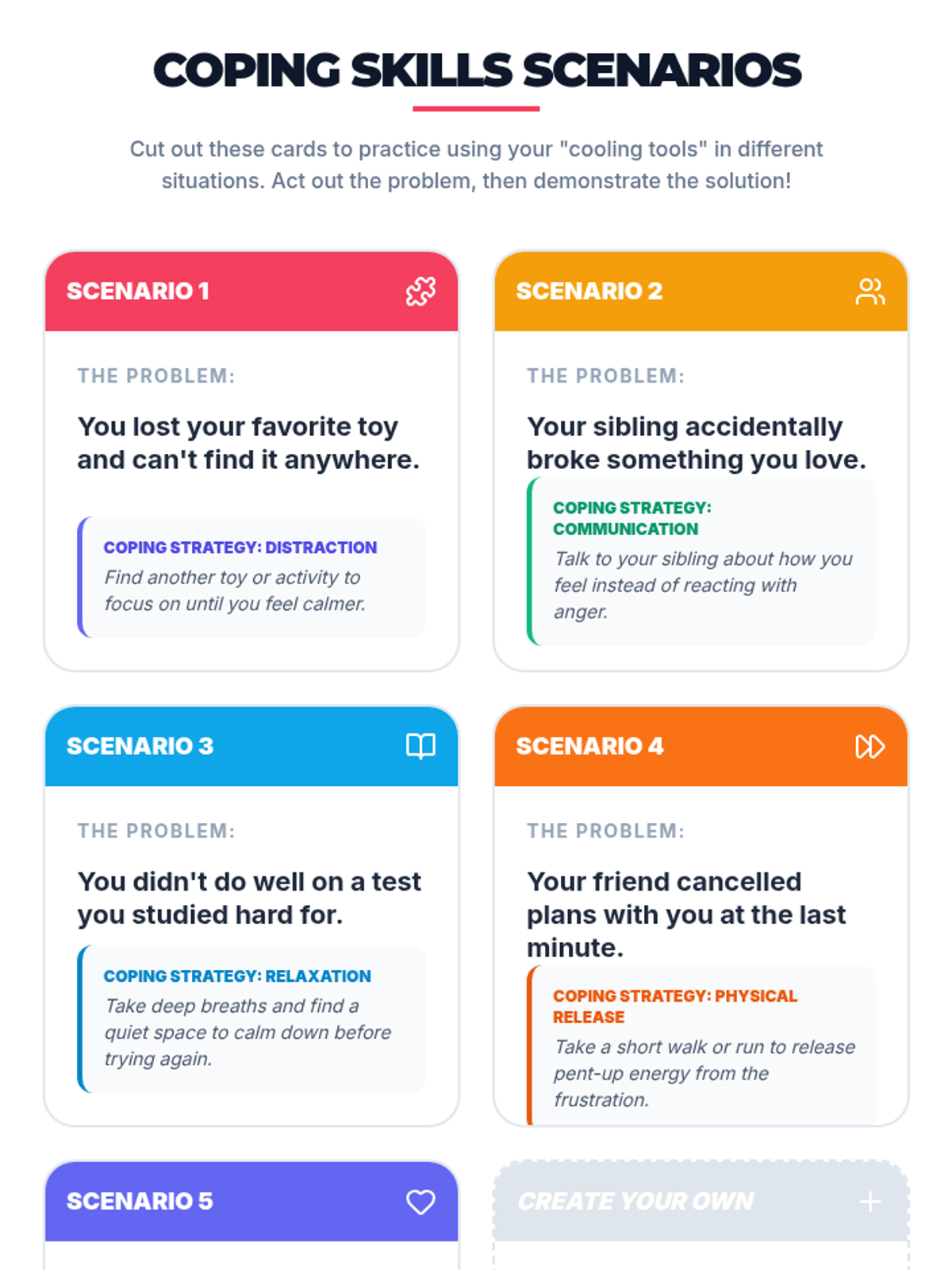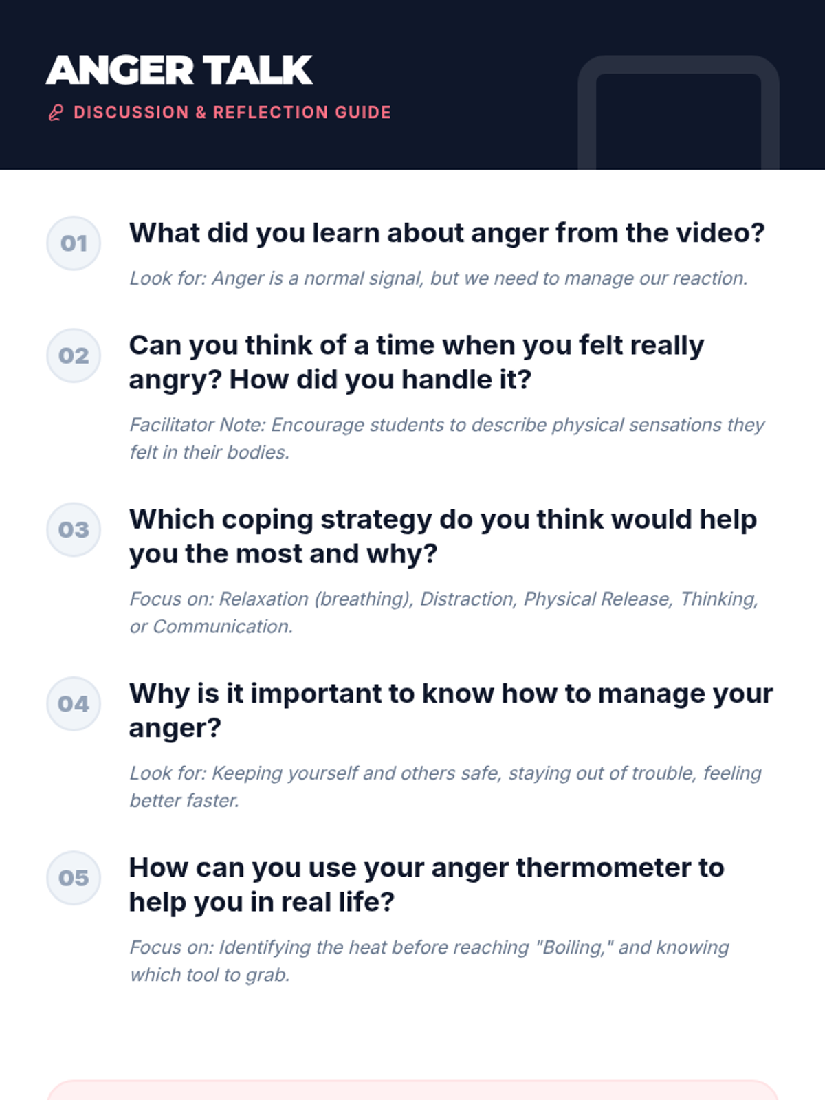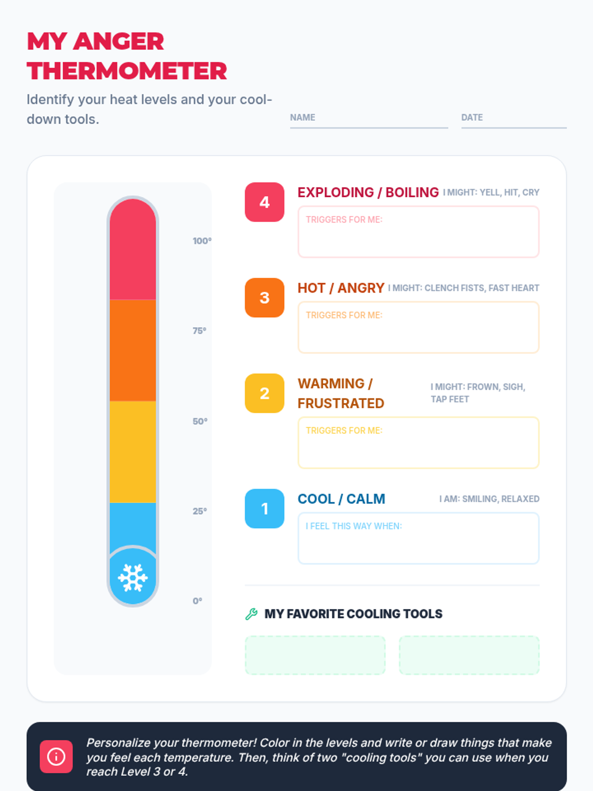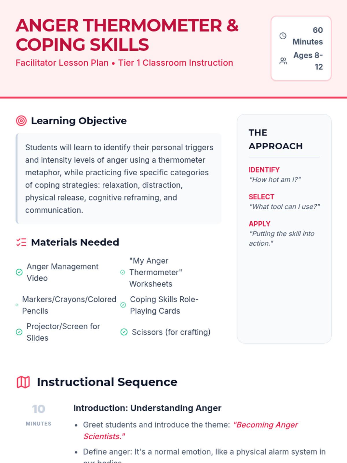 A comprehensive lesson for ages 8-12 focusing on identifying anger levels using a thermometer metaphor and practicing specific coping strategies through role-play.