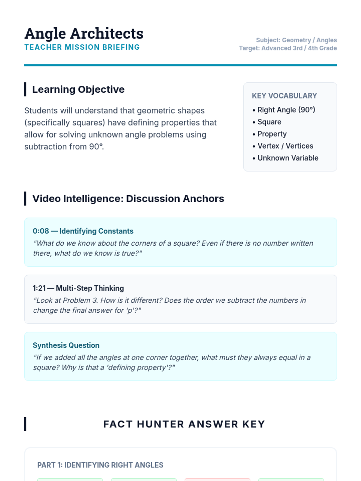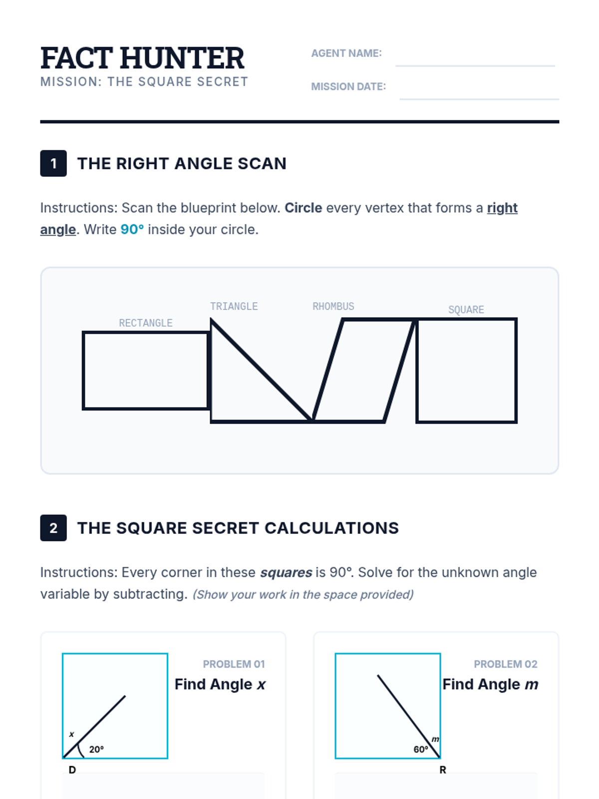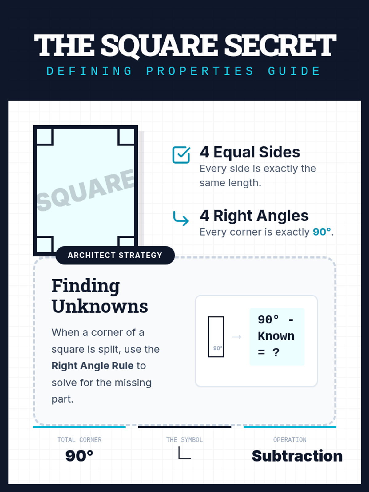 Students explore the defining properties of squares, specifically focusing on the 90-degree right angle property to solve for unknown angles using subtraction.