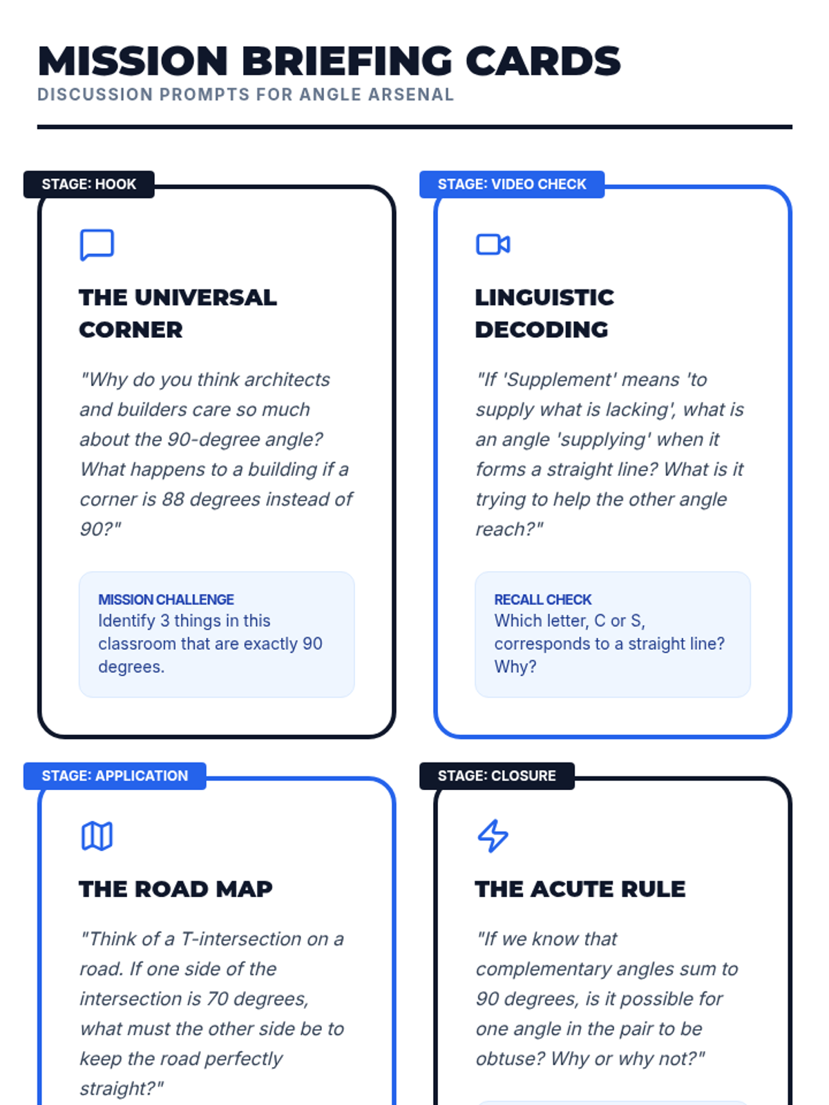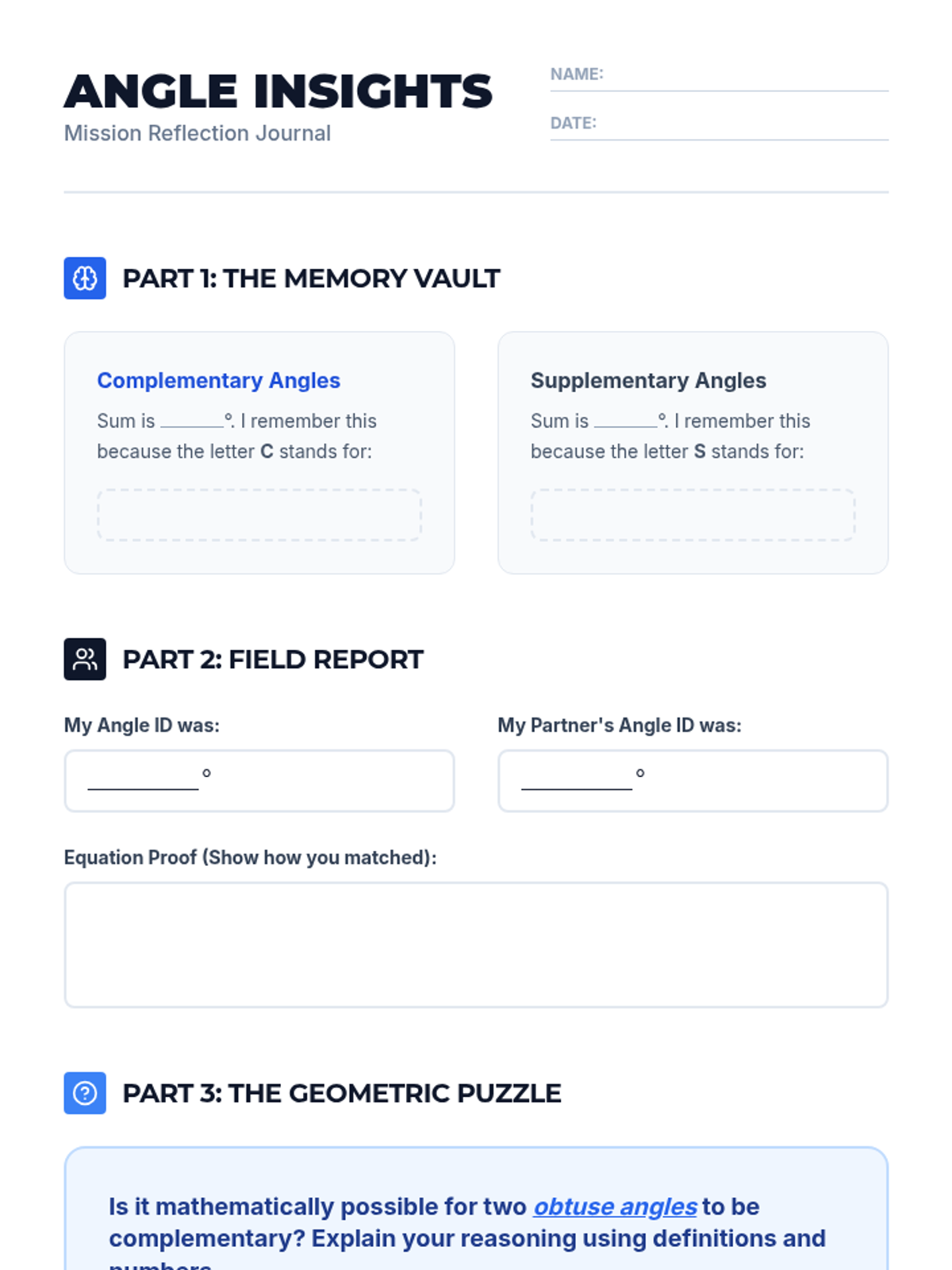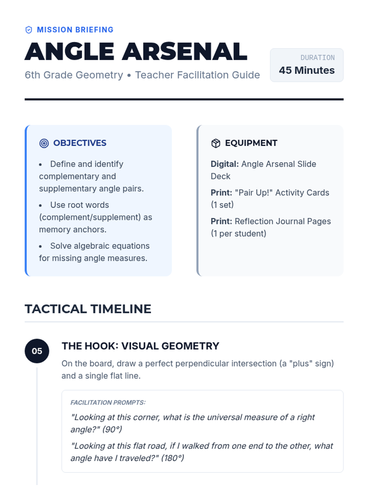 Students will distinguish between complementary and supplementary angles using root words as memory aids and apply their knowledge to solve for missing angle measures. The lesson includes a high-energy 'Pair Up!' activity and a geometric-themed slide deck.