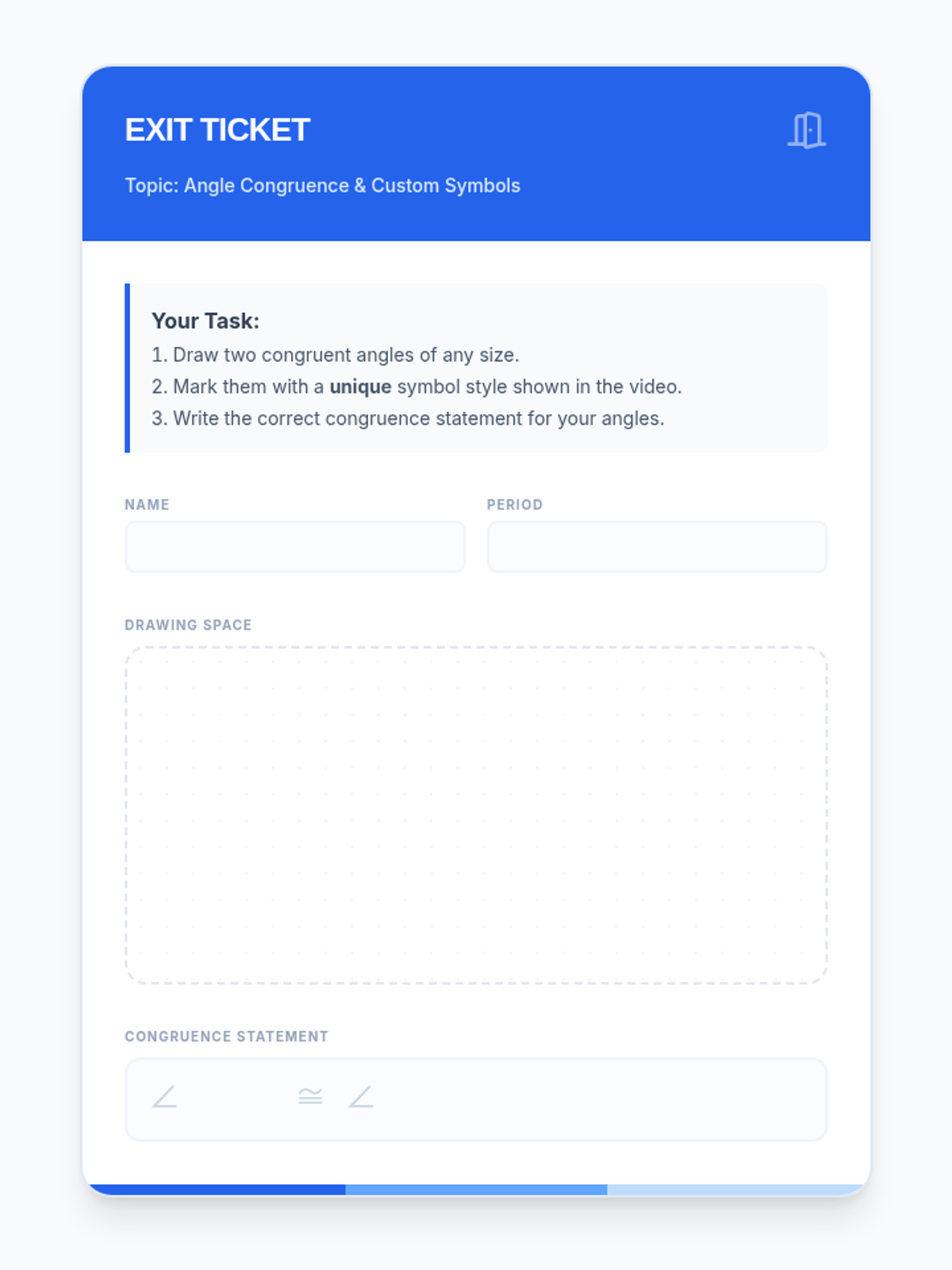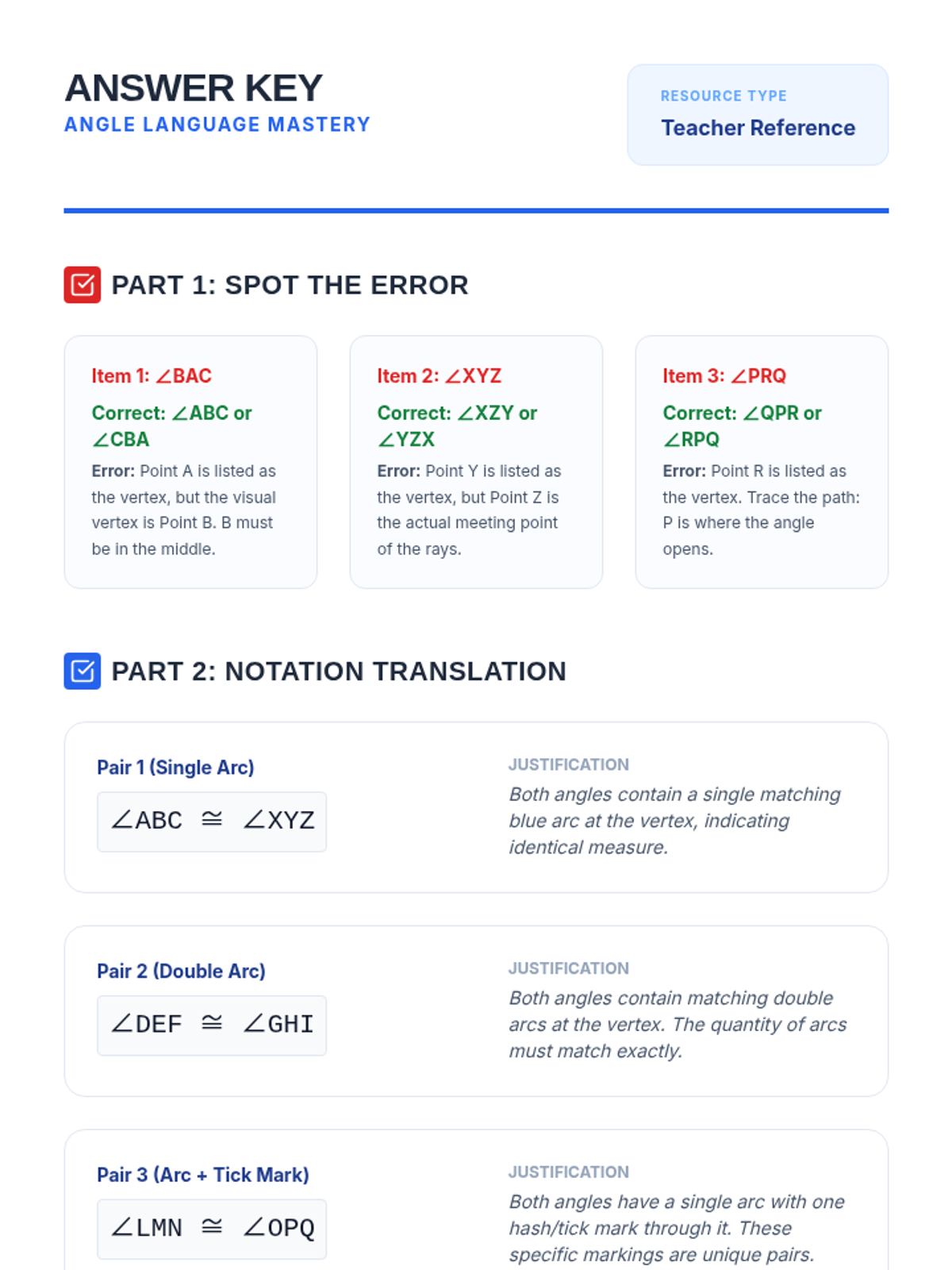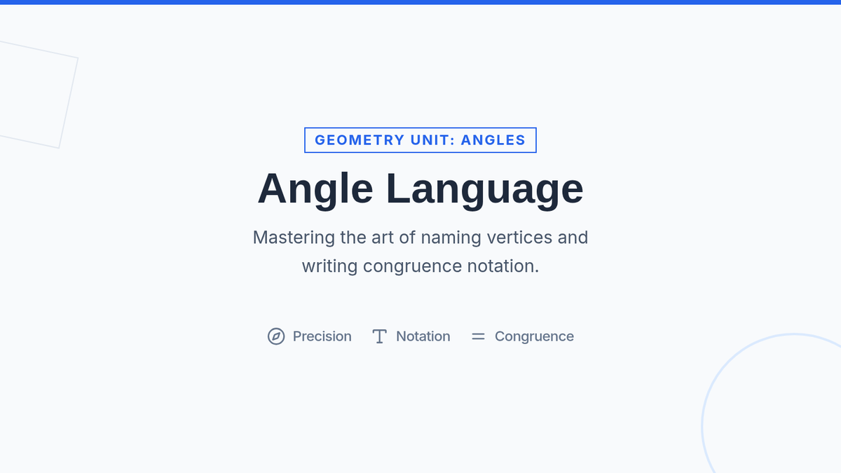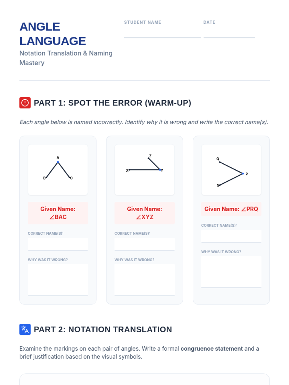 A high school geometry lesson focused on the precision of naming angles and using congruence notation correctly based on visual markers. Students will master the 'vertex-in-the-middle' rule and translate geometric symbols into formal congruence statements.