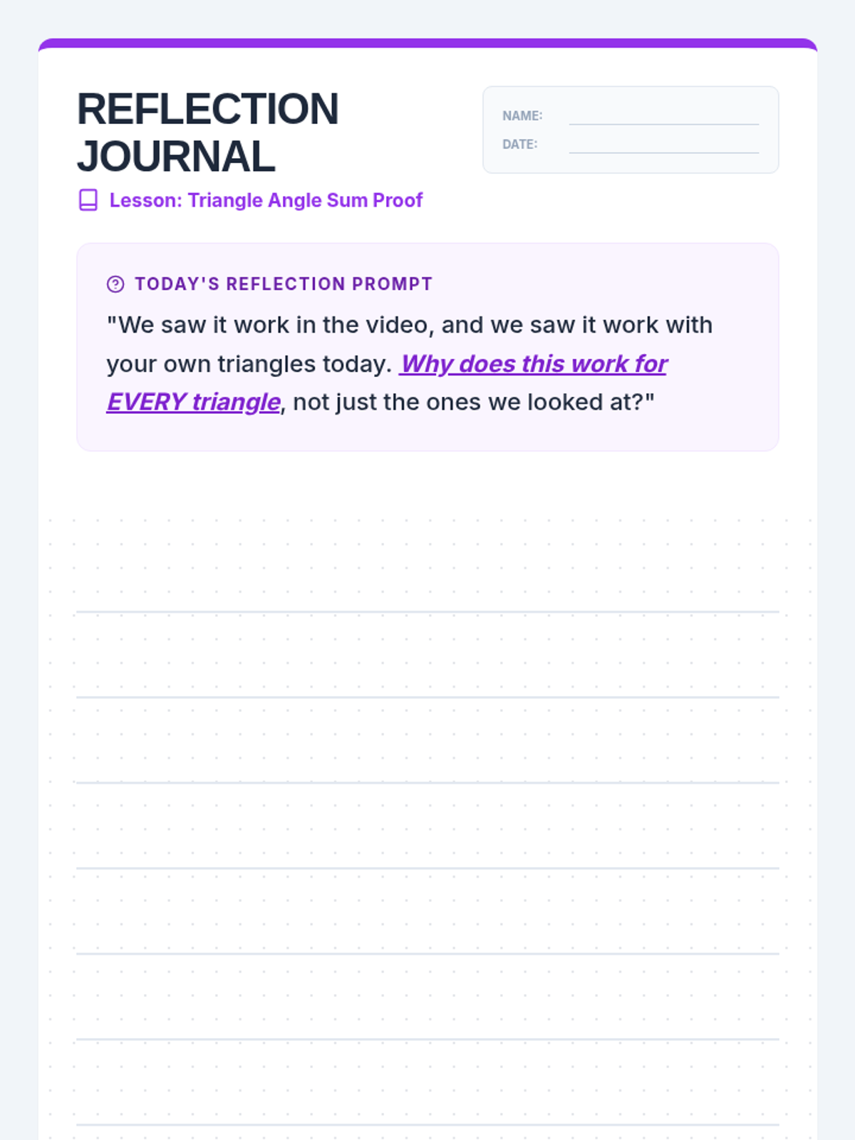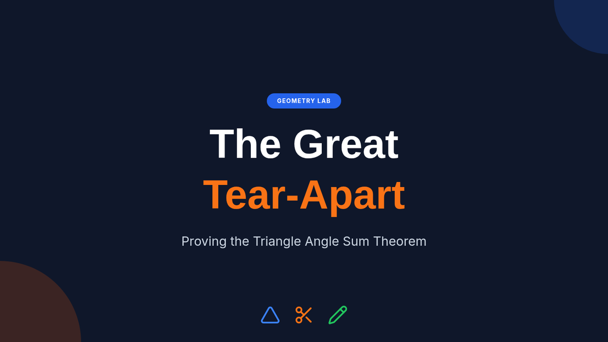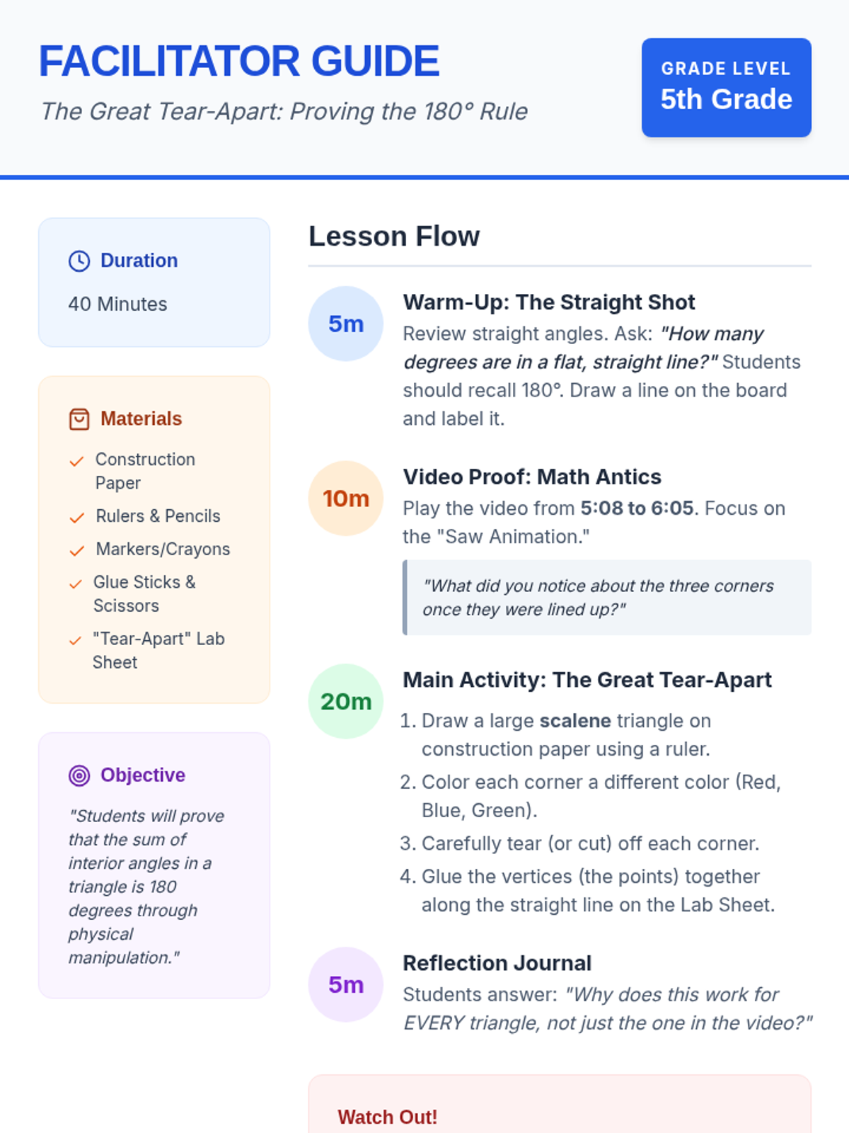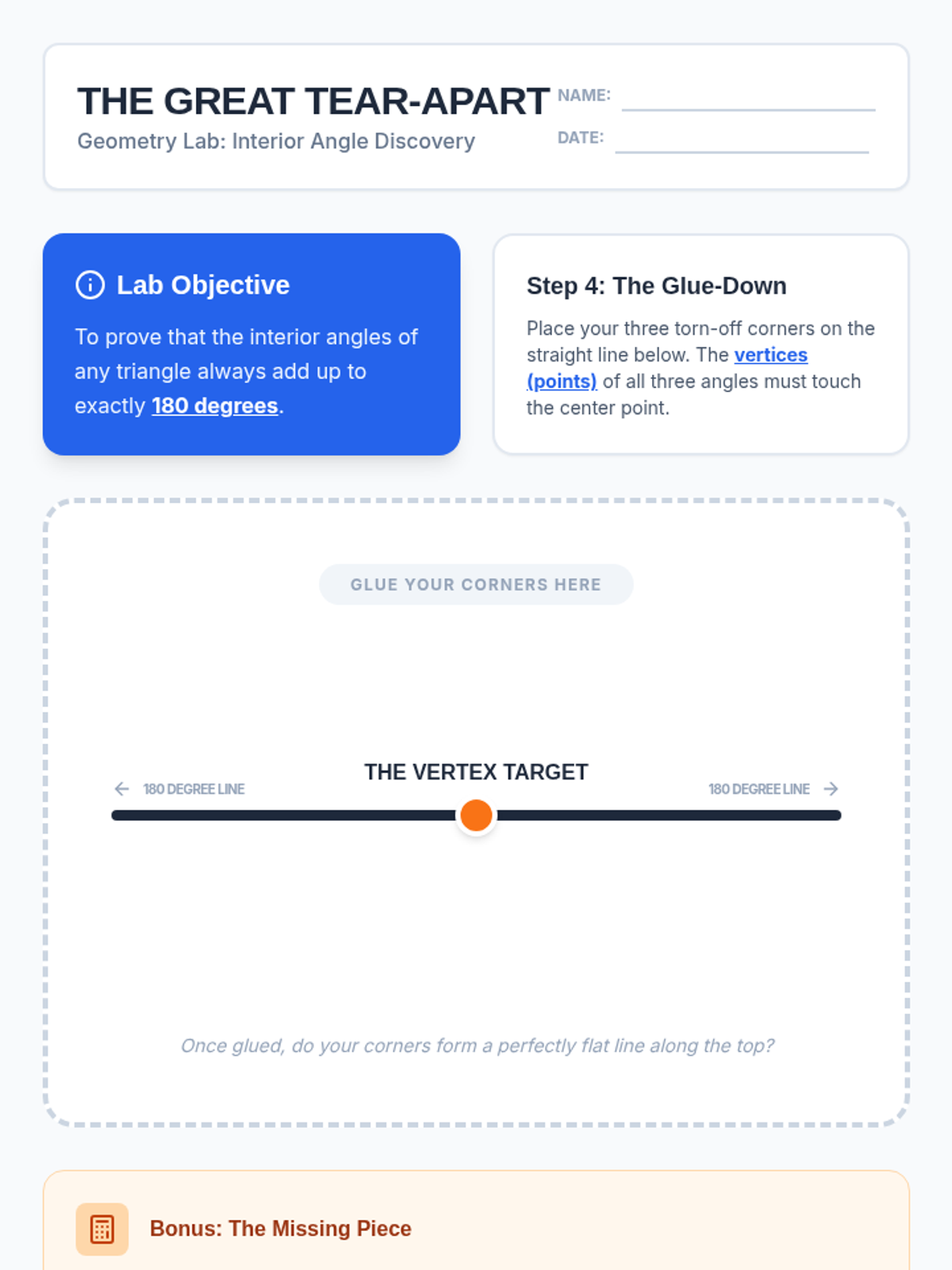 A hands-on geometry lesson where students prove the triangle angle sum theorem by physically manipulating triangle corners to form a straight line. Includes a video analysis, a creative construction activity, and reflective writing.