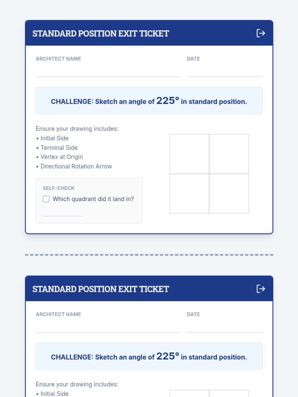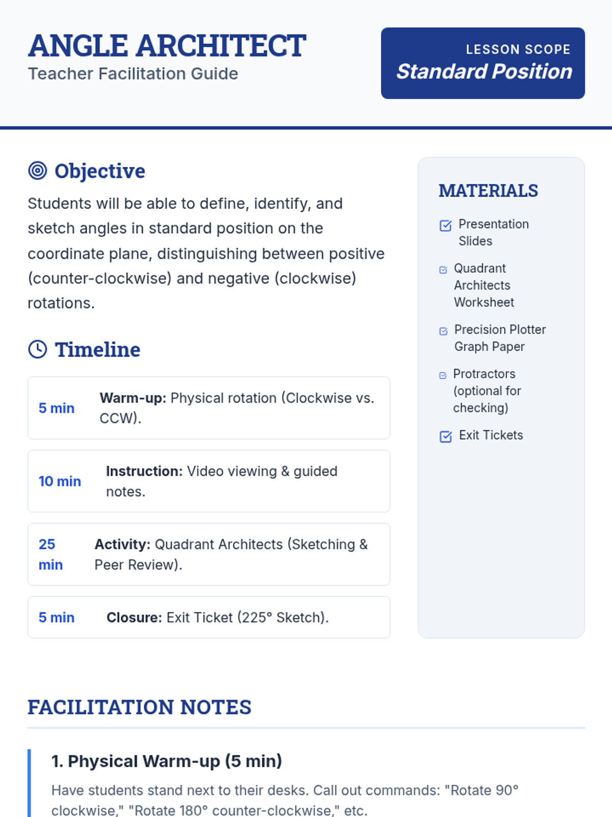 Students learn to define and sketch angles in standard position on the coordinate plane. They explore positive and negative rotations, identify quadrants, and practice precise sketching through a 'Quadrant Architects' collaborative activity.