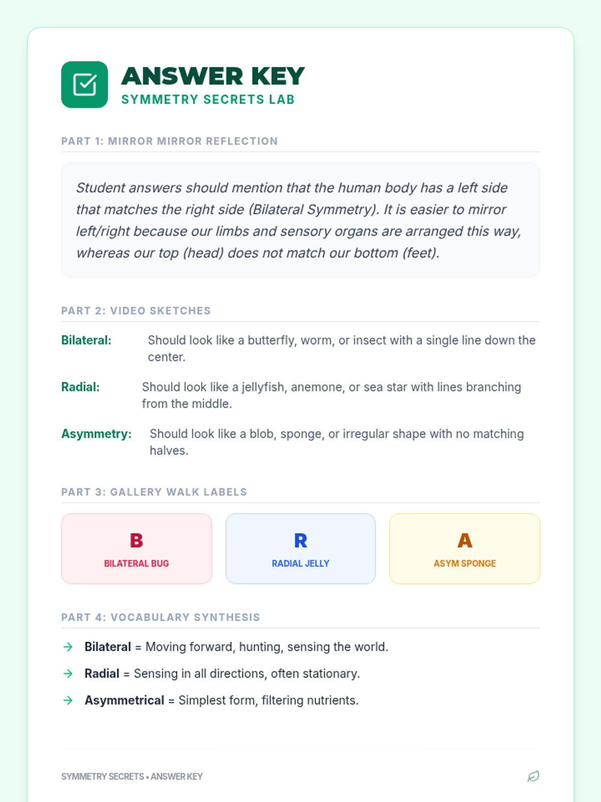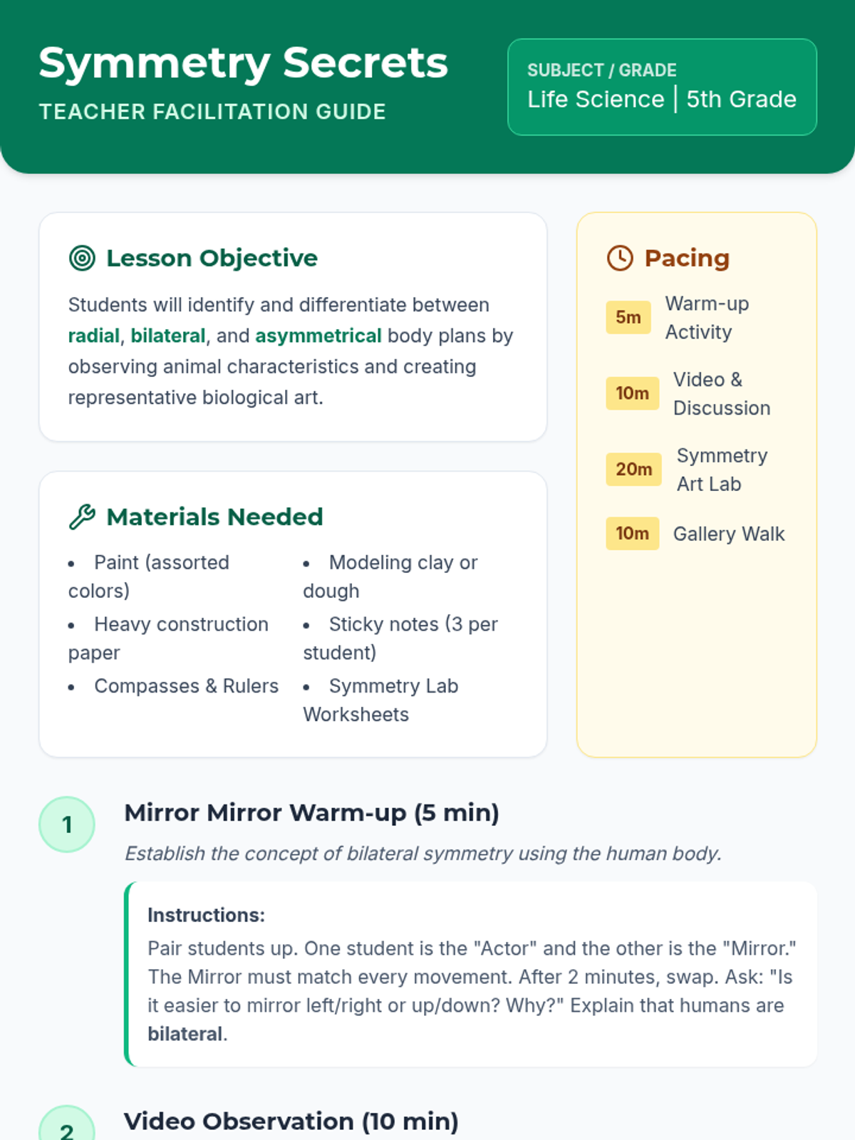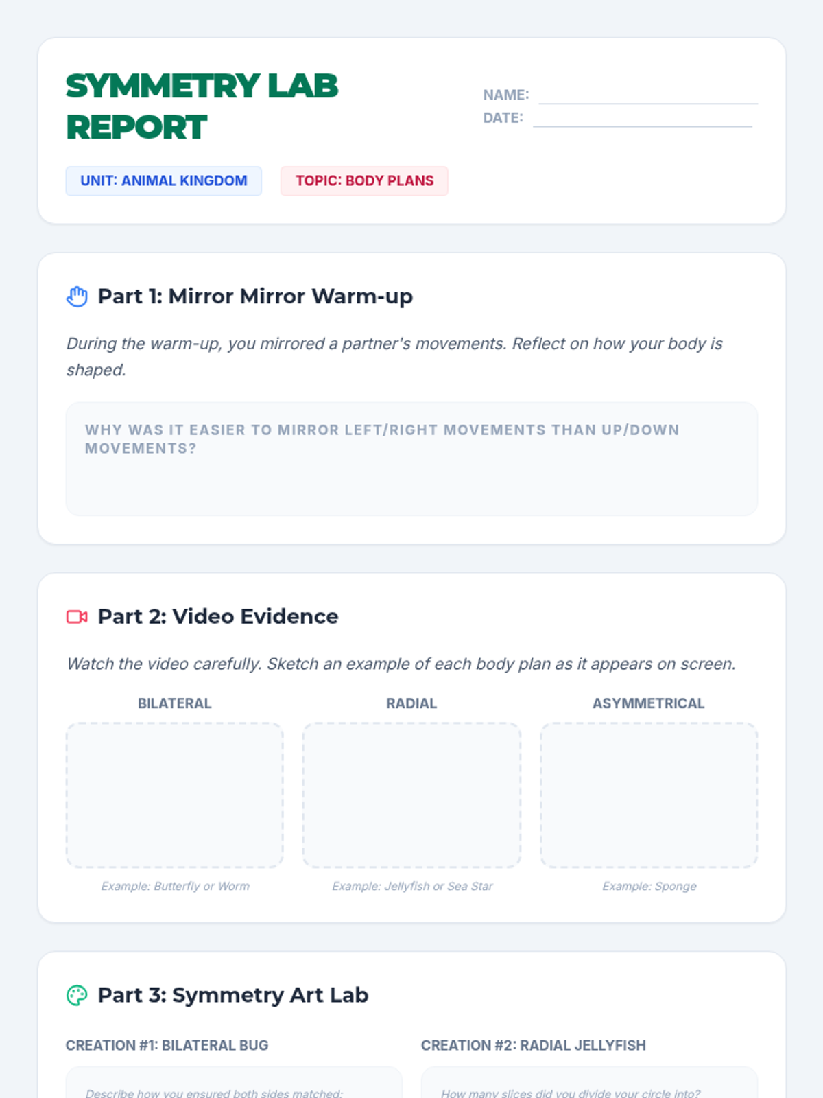 A hands-on biology and art lesson for 5th graders exploring the three main animal body plans: radial, bilateral, and asymmetrical symmetry. Students move from physical movement to video observation and finally create 3D and 2D art pieces to represent each plan.
