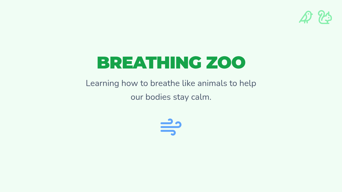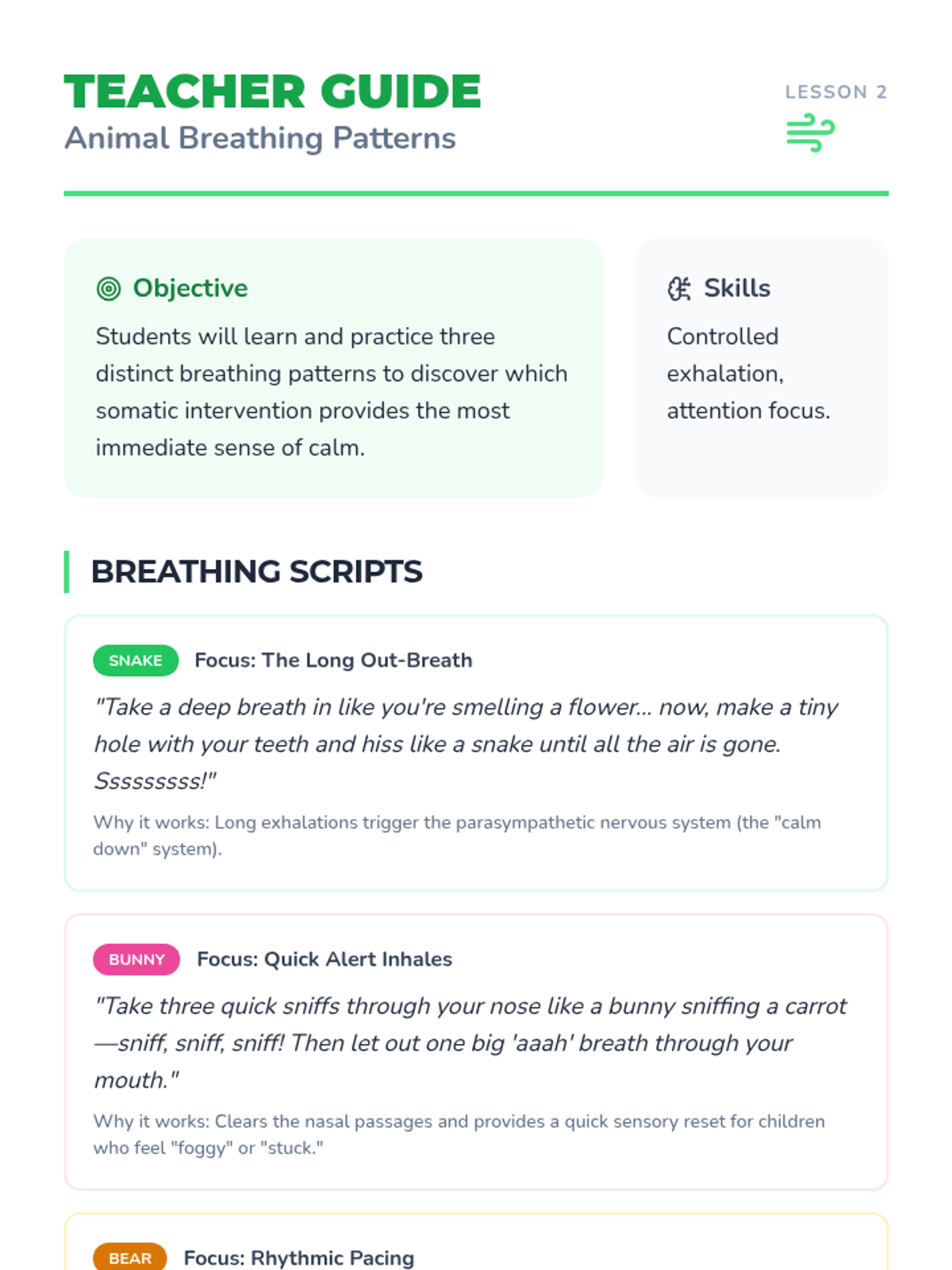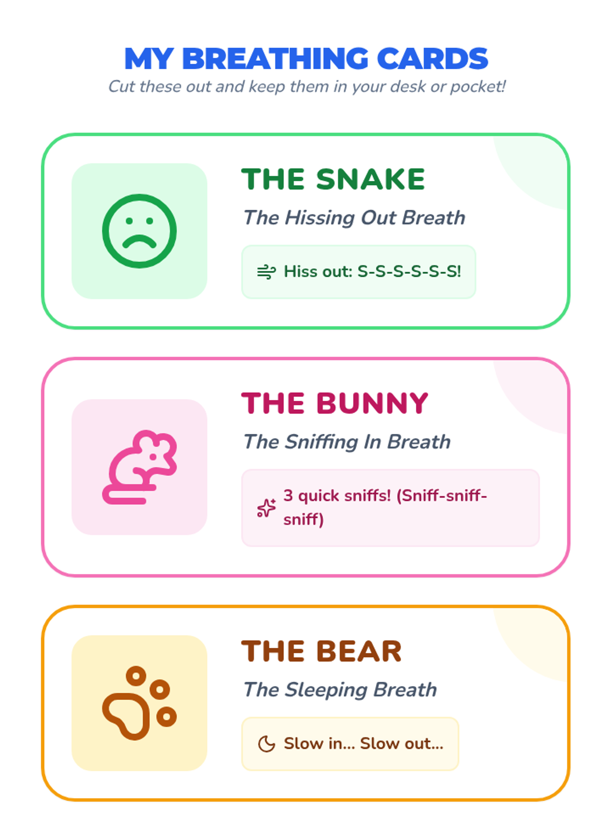 Students learn three distinct animal-themed breathing patterns (Snake, Bunny, Bear) to discover which ones help them feel most calm.