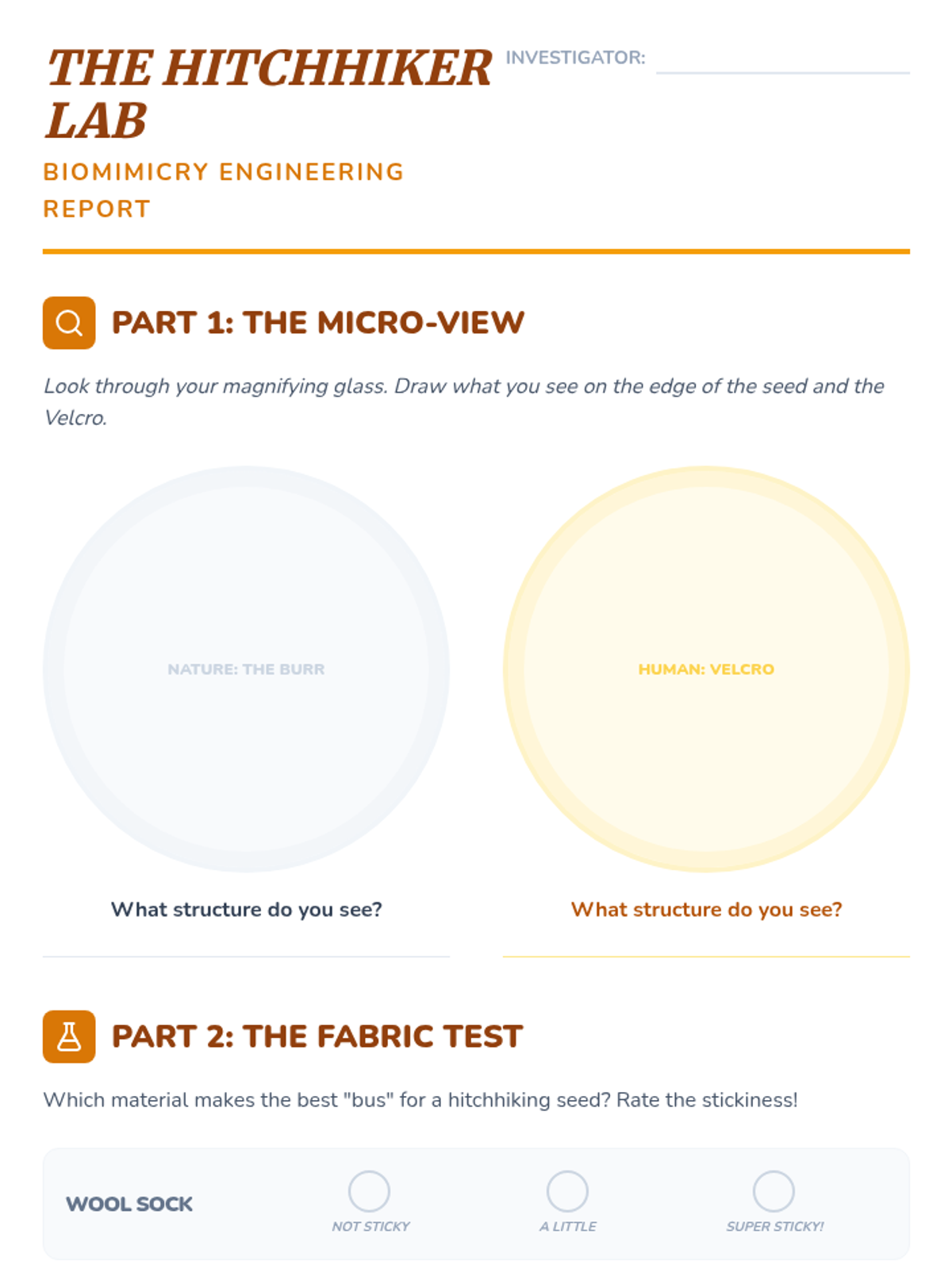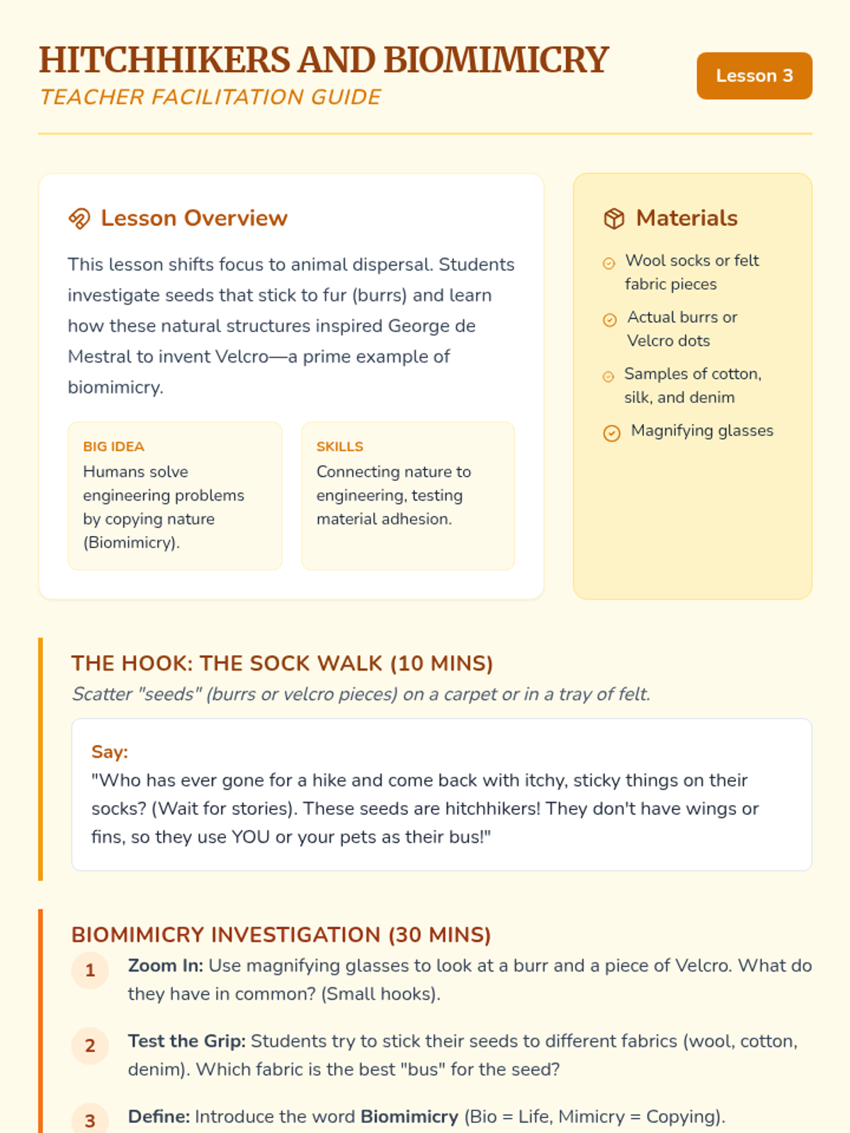 Students investigate seeds that hitch rides on animals and explore how these natural structures inspired inventions like Velcro through biomimicry.