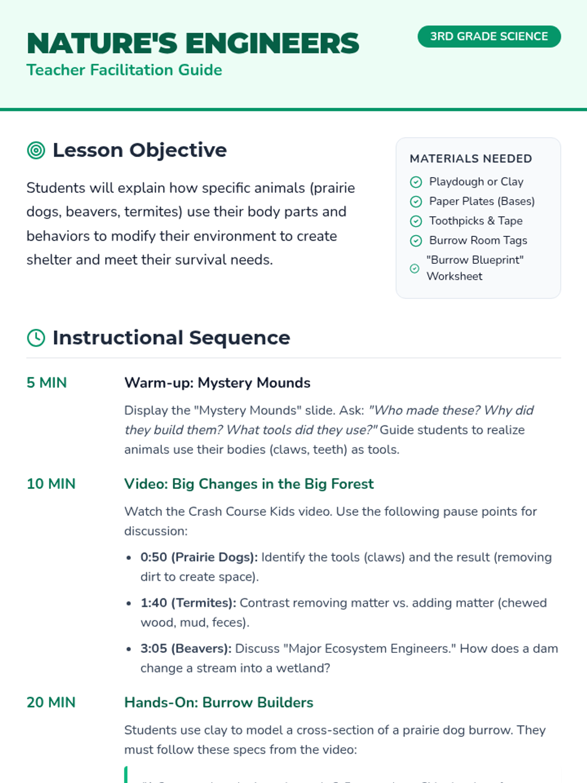 Students explore how animals like prairie dogs, beavers, and termites act as engineers, using their bodies and behaviors to modify their environments for shelter and survival. The lesson features a hands-on modeling activity of a prairie dog burrow.