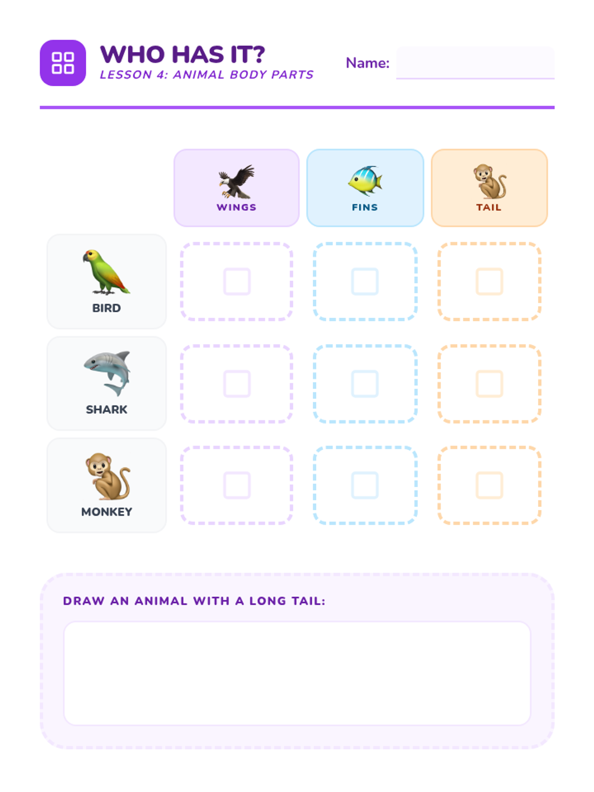 Students categorize and compare animal body parts like wings, tails, and fins through active listening games.
