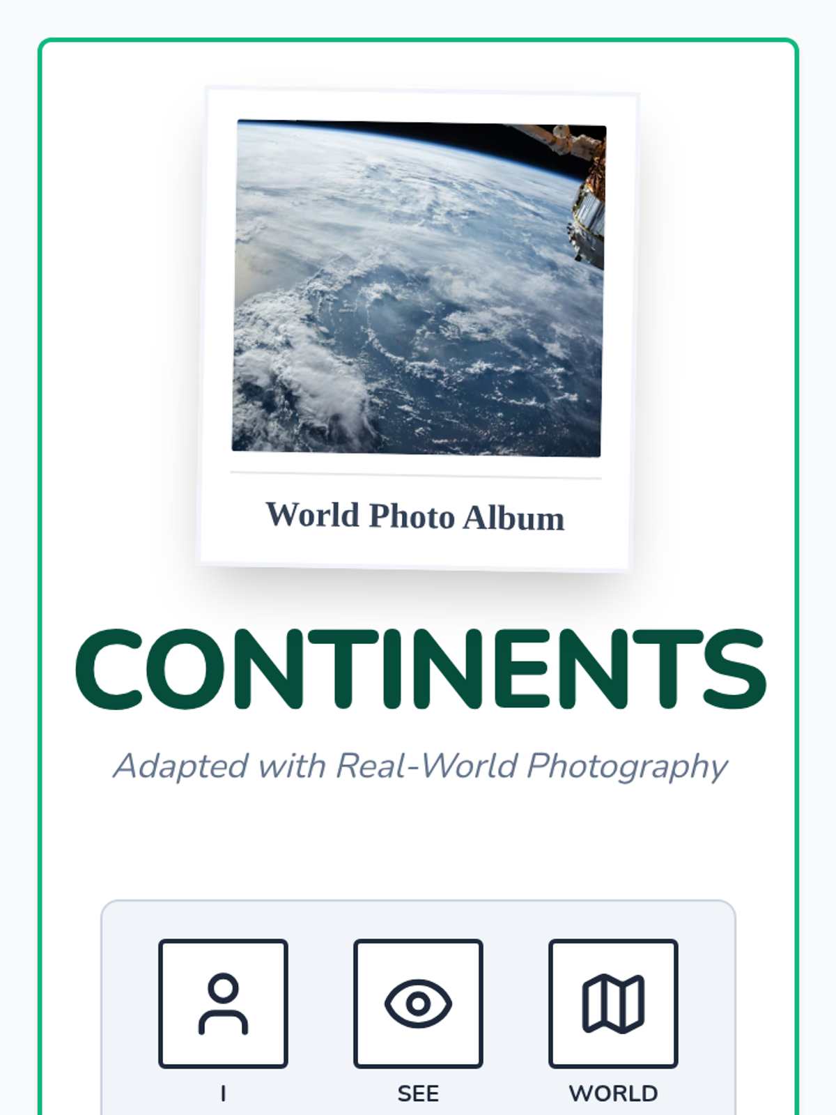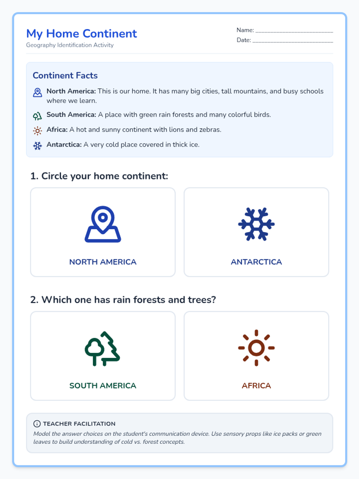 A lesson introducing the seven continents with a special focus on North America, using symbol-supported text to help students identify global geography.