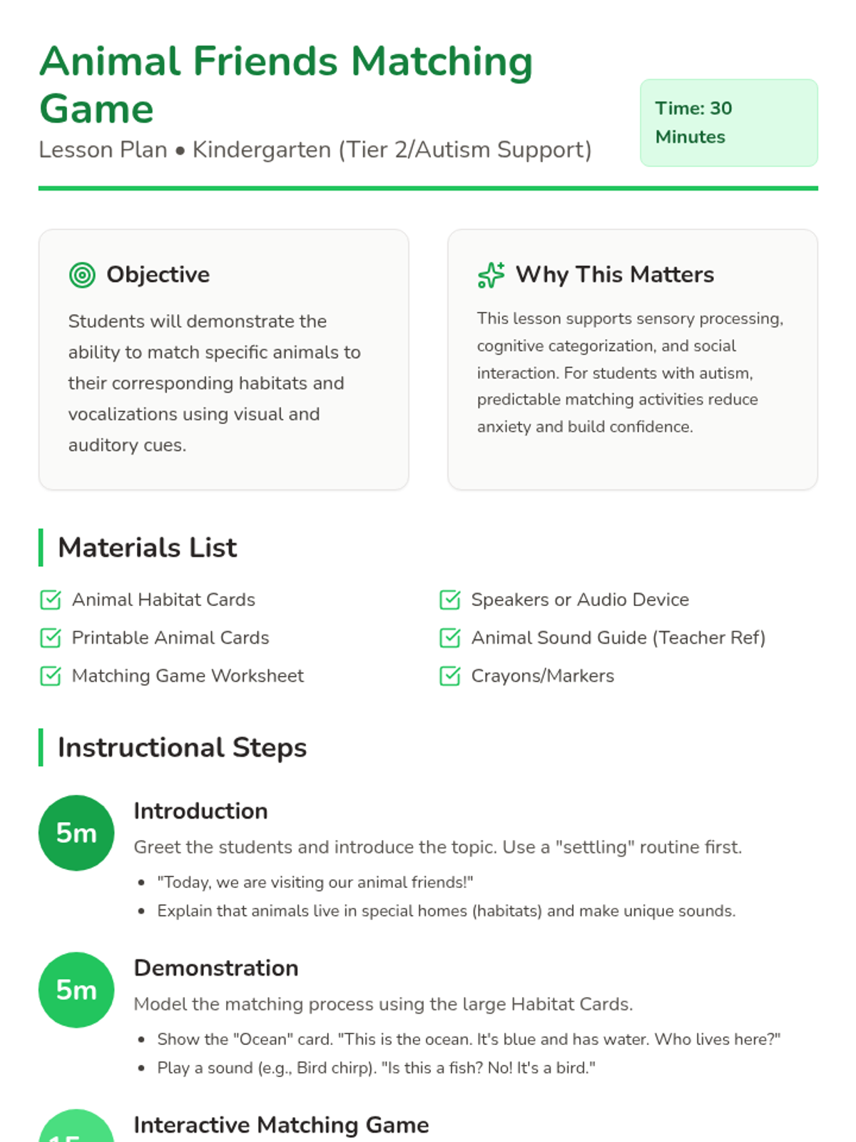 An interactive lesson for kindergarten students with autism to learn about animals through habitat and sound matching. This session uses visual and auditory cues to support categorization skills and social engagement.