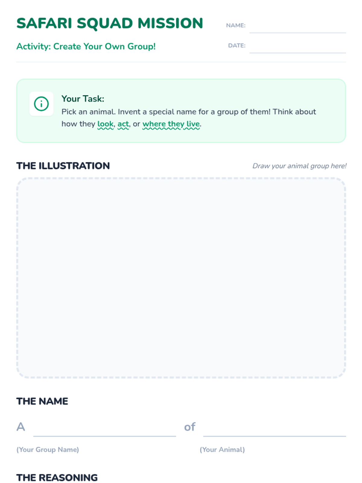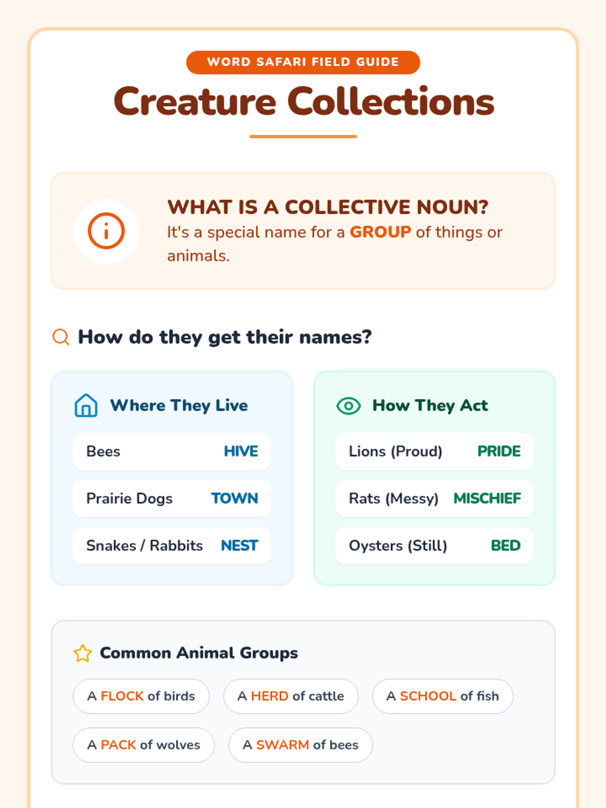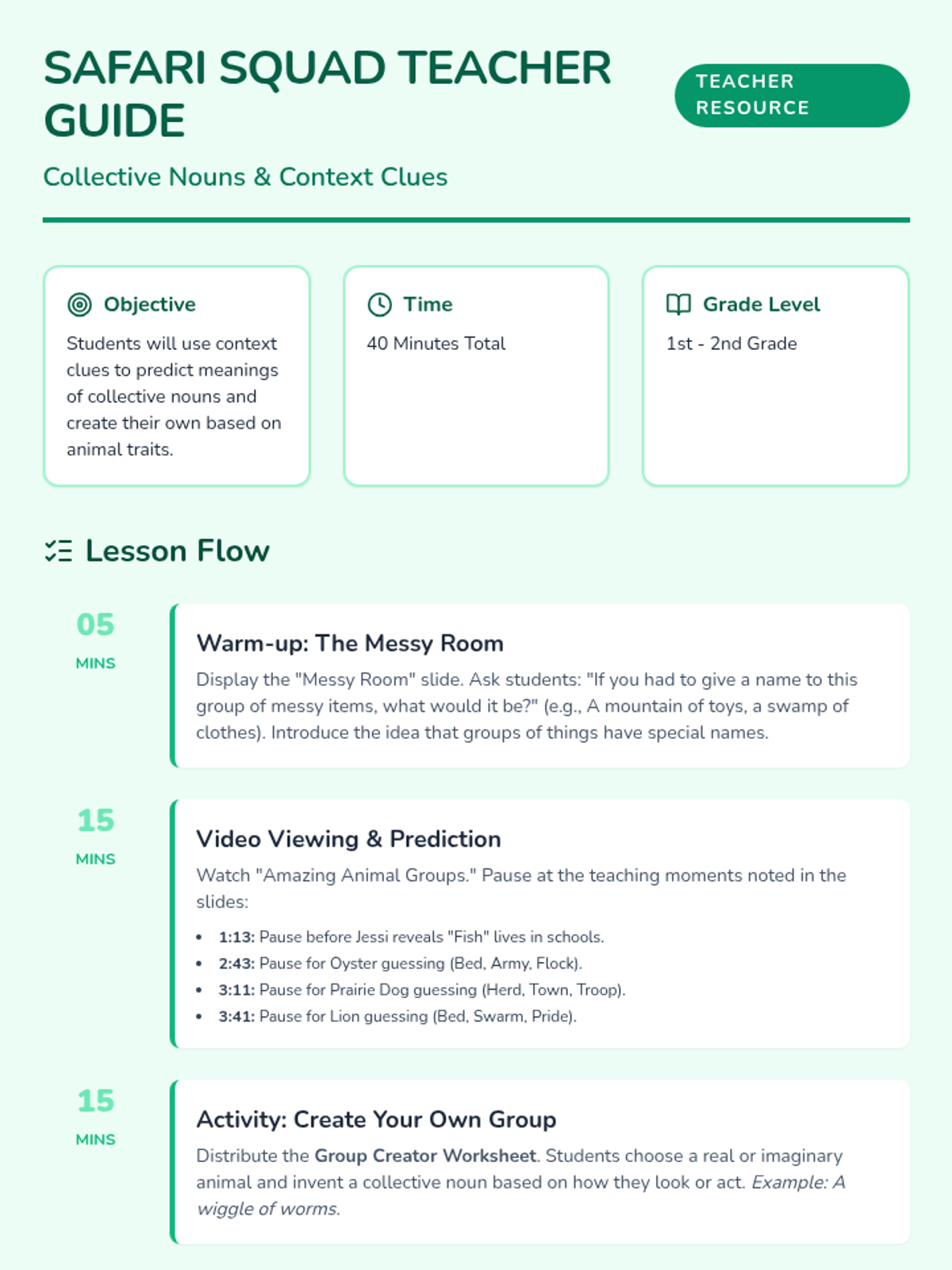 Students explore collective nouns through a nature-themed lens, using context clues to predict and invent creative names for animal groups. This lesson integrates video-based inquiry with a hands-on 'creative naming' activity.