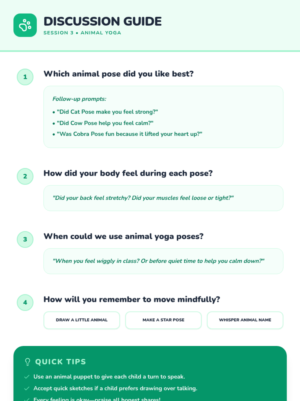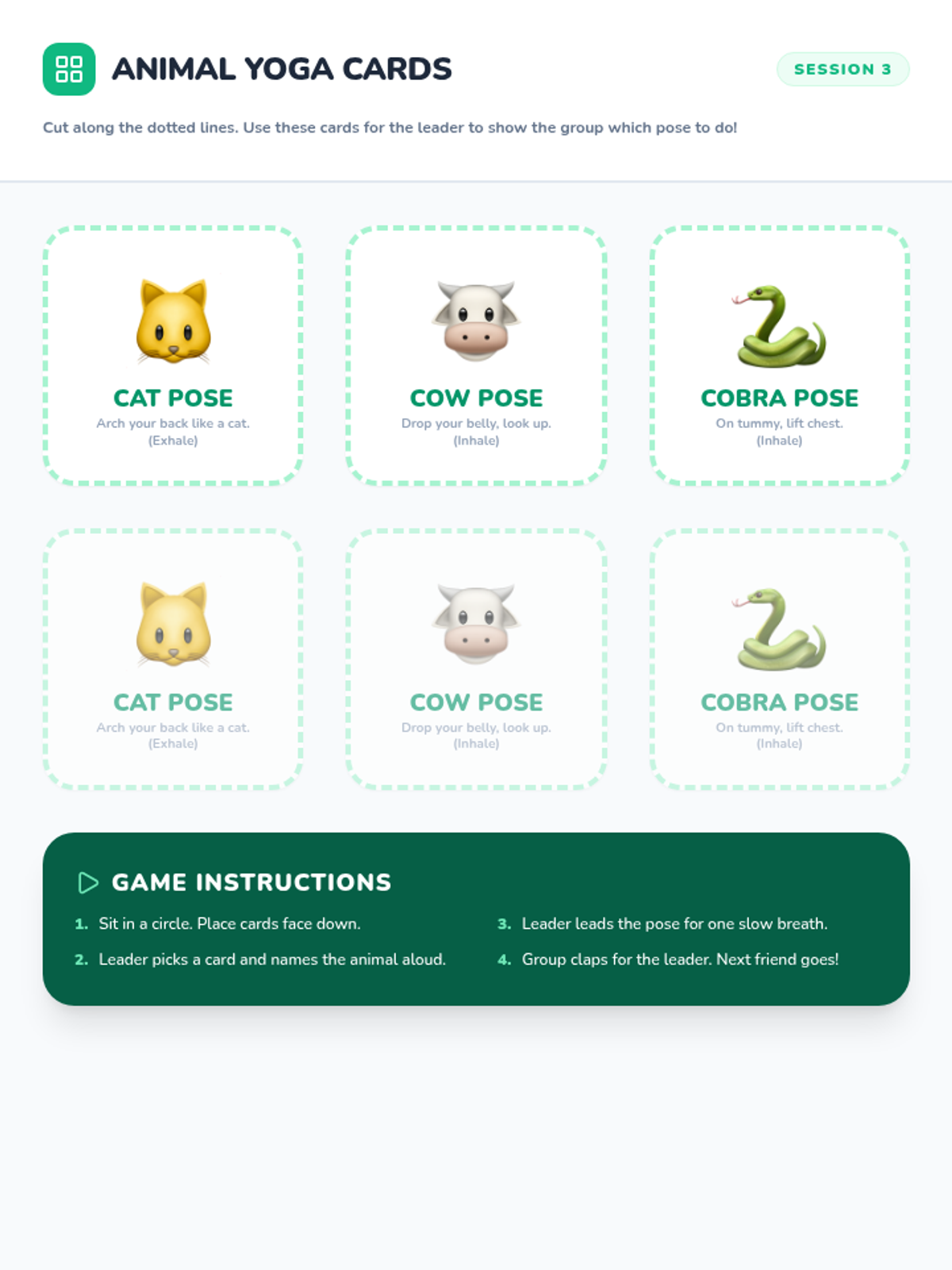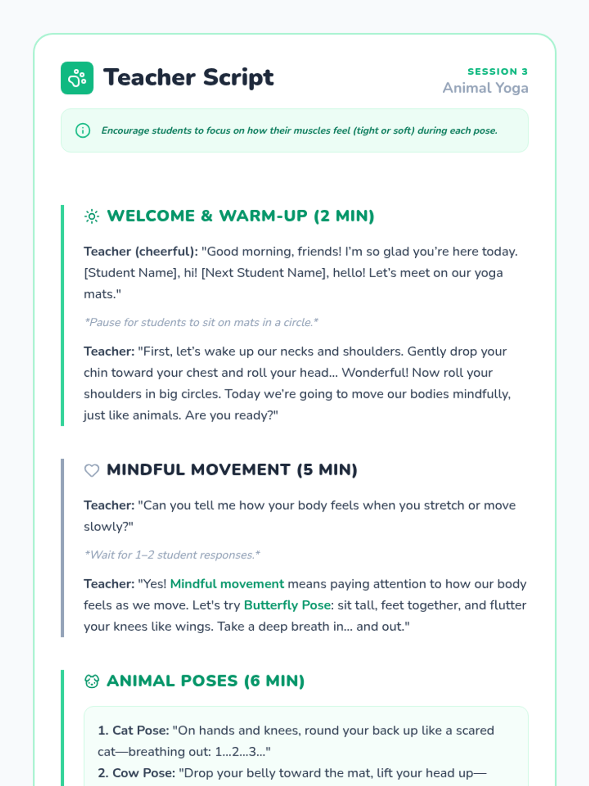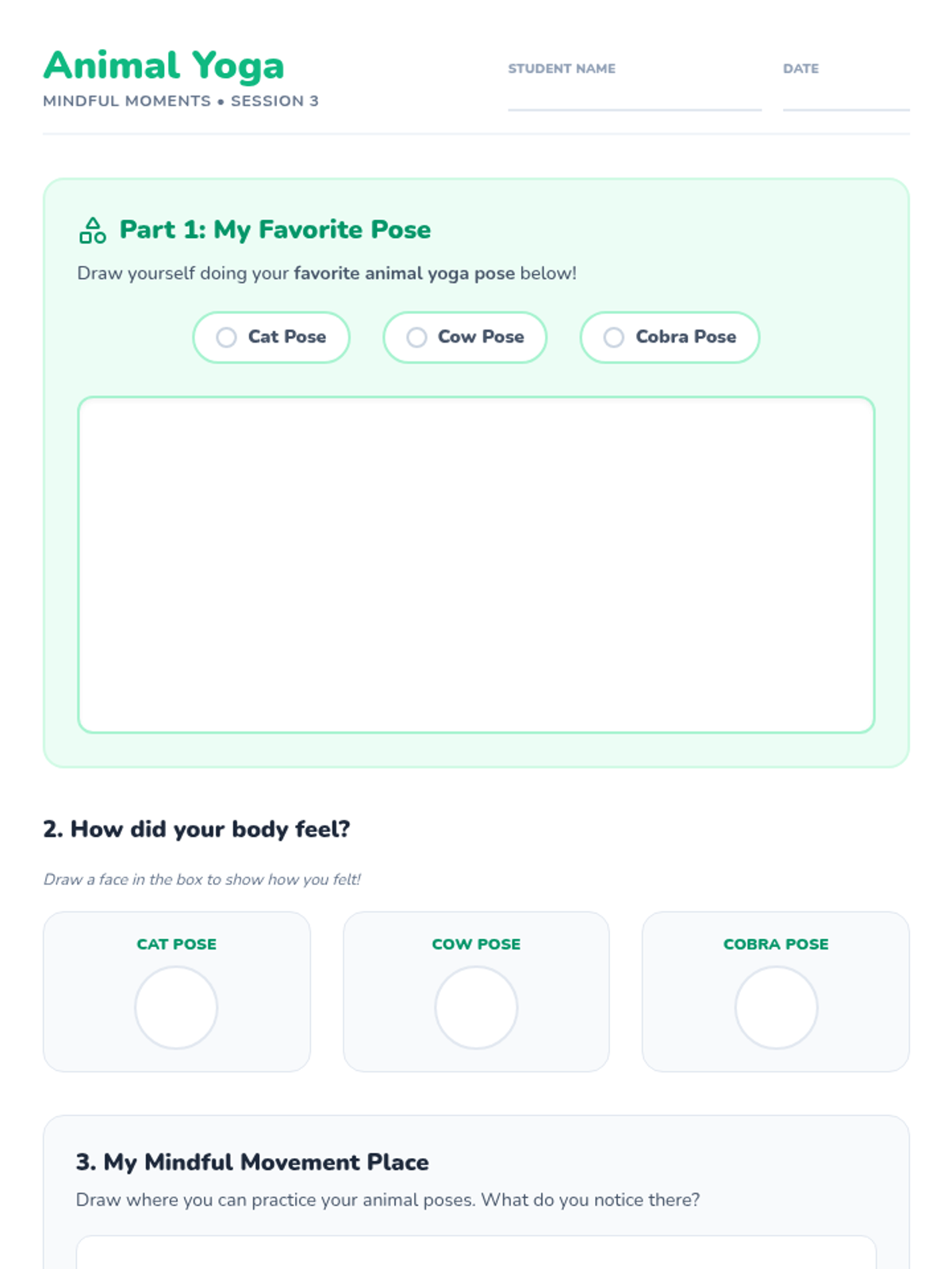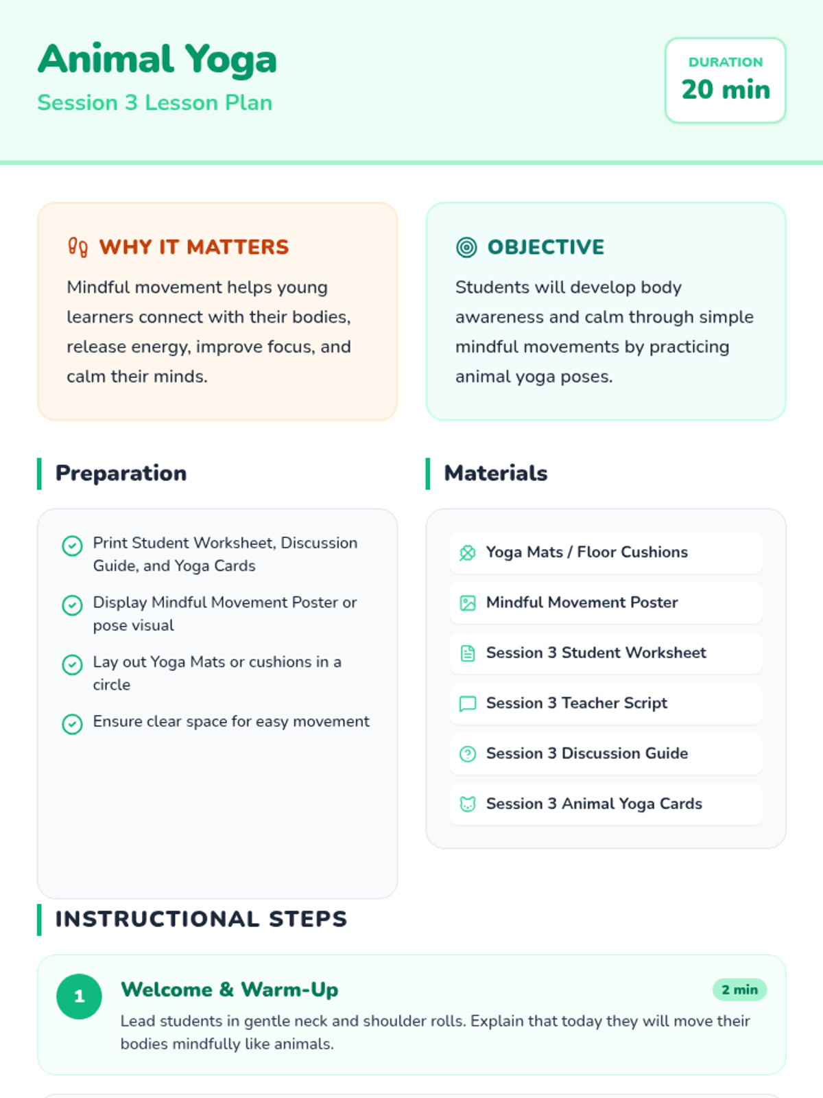 Students will develop body awareness and calm through simple mindful movements by practicing animal yoga poses.