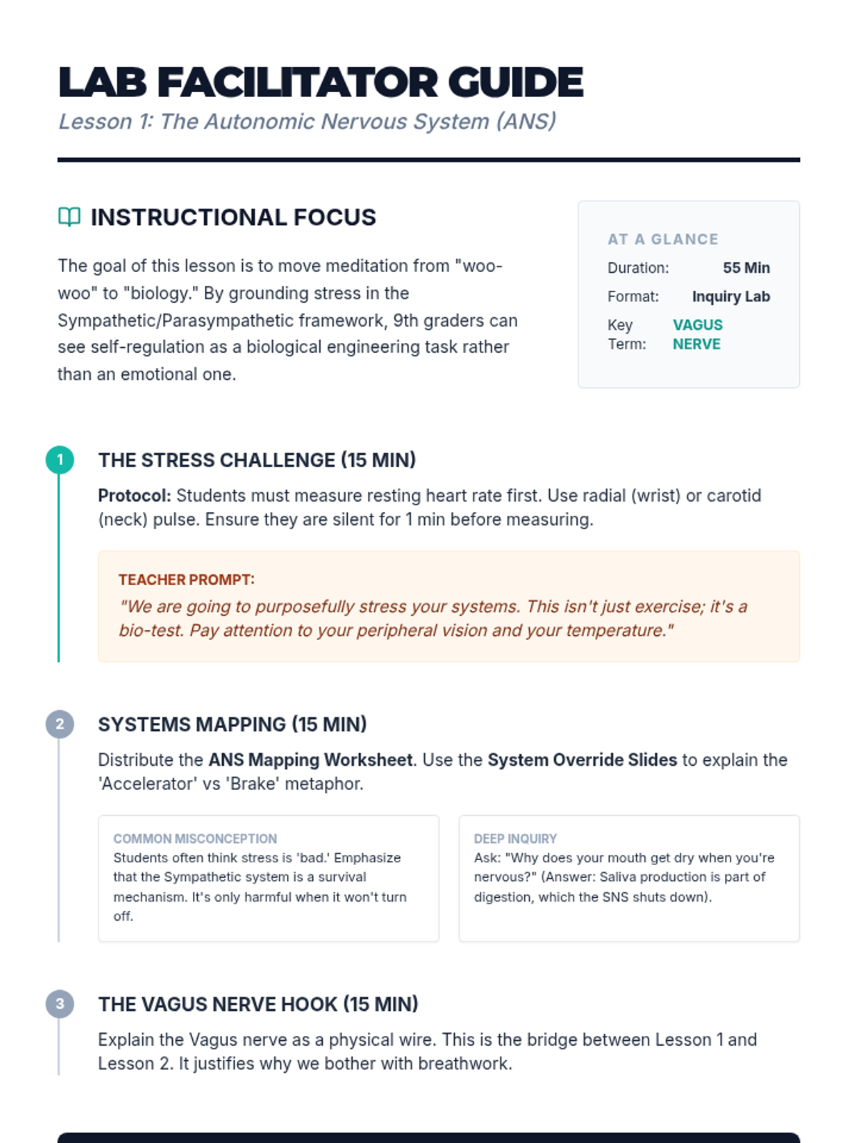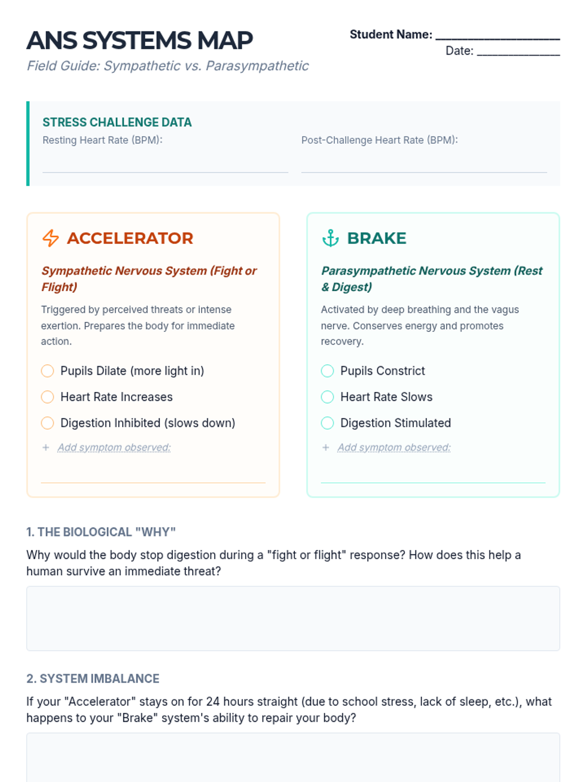 Students investigate the roles of the sympathetic and parasympathetic nervous systems through a 'stress challenge' simulation. They map physical symptoms to biological processes and identify the vagus nerve's role in activation.