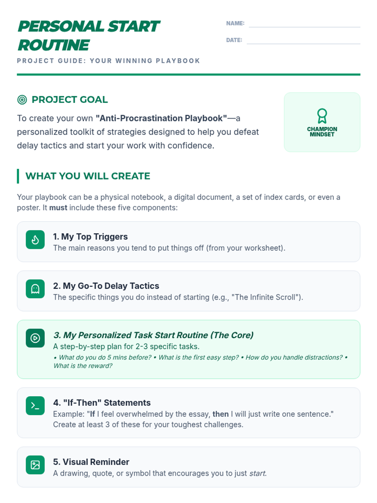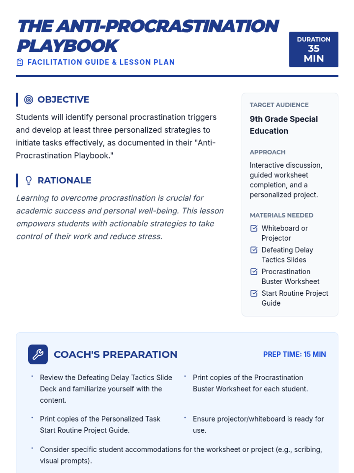 This lesson helps 9th-grade students identify procrastination triggers and develop personalized 'task initiation' routines to build better work habits. Students create a 'Playbook' of strategies to move from delay to action.